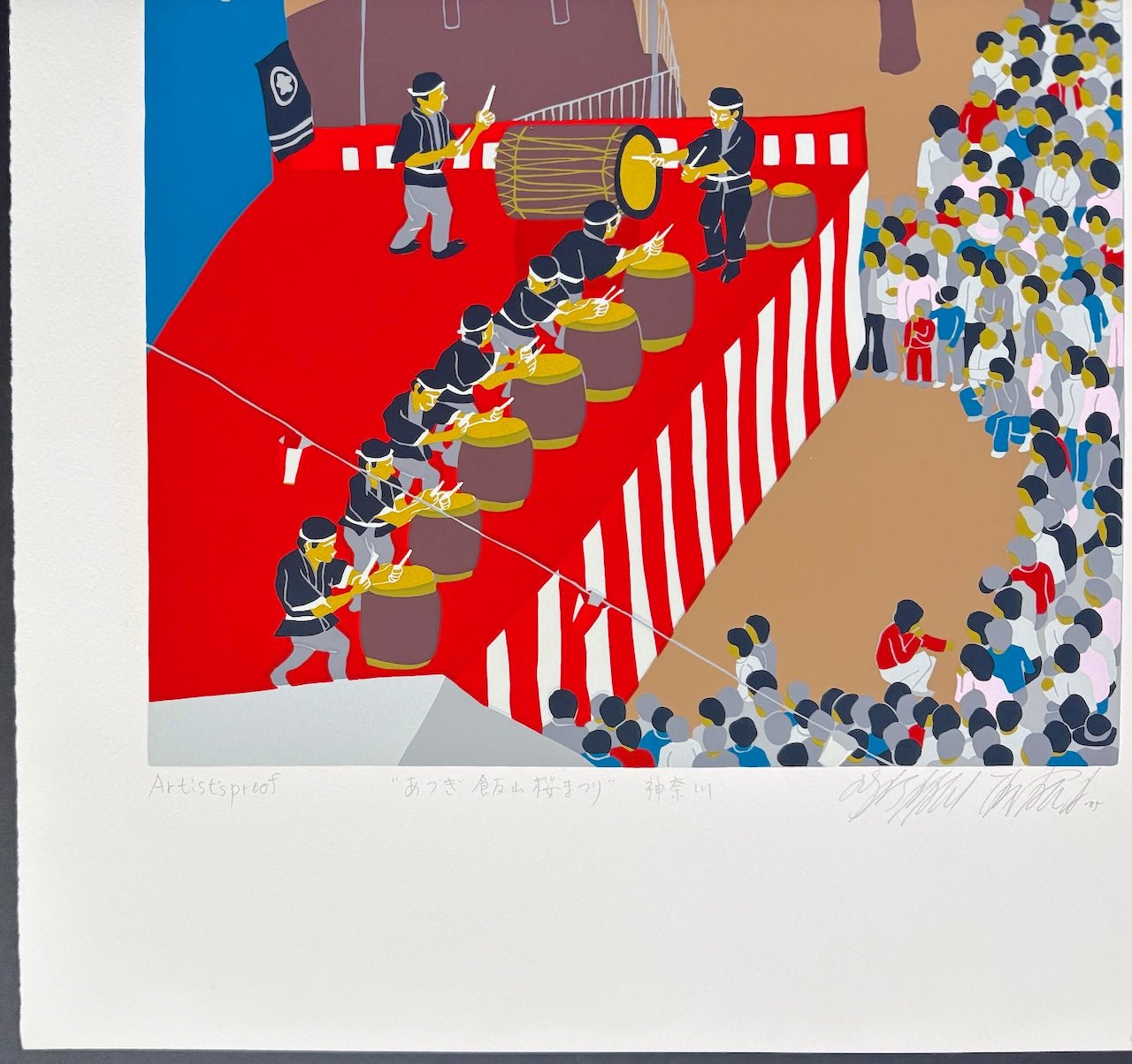 The delightful silkscreen print “Atsugi Iiyama Sakura Matsuri” (Atsugi Iiyama Cherry Blossom Festival, Kanagawa) is by Masaaki Tanaka (b. 1947). This vibrant work captures the joy of a traditional Japanese spring festival in full bloom, with cherry blossoms filling the scene in Atsugi, Kanagawa Prefecture. Rich colors and strong contrast give the image lively visual impact. The sheet number, Japanese title, and artist’s signature are hand-signed in the bottom margin. Printed in a limited edition of only 50 impressions, this example is an artist’s proof.