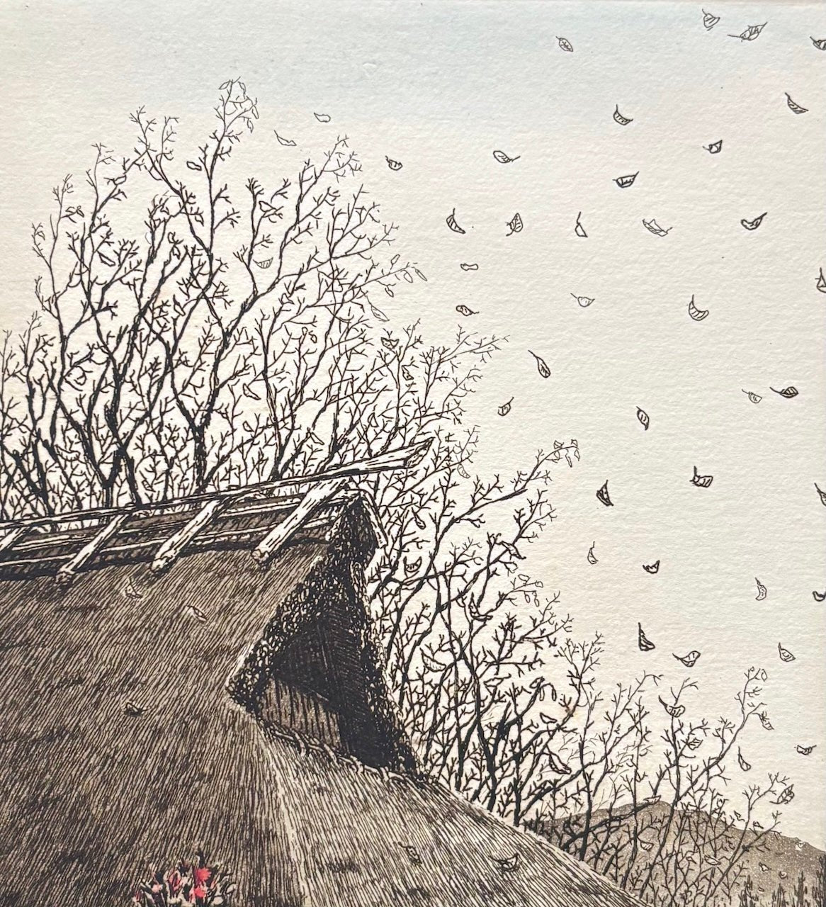 The beautiful etching “Banshun-2” (Late Spring 2) is by Hiroto Norikane. It depicts a scene of the season transitioning from spring to summer, with leaves swirling in the strong spring wind. This is a wonderful example of Norikane’s work, in which the movement of falling leaves animates an otherwise tranquil landscape.