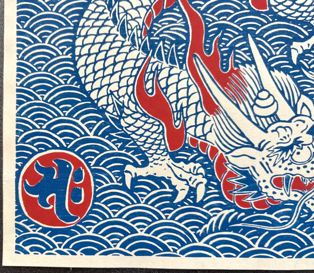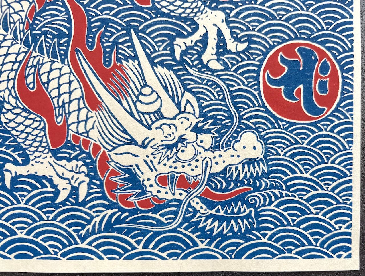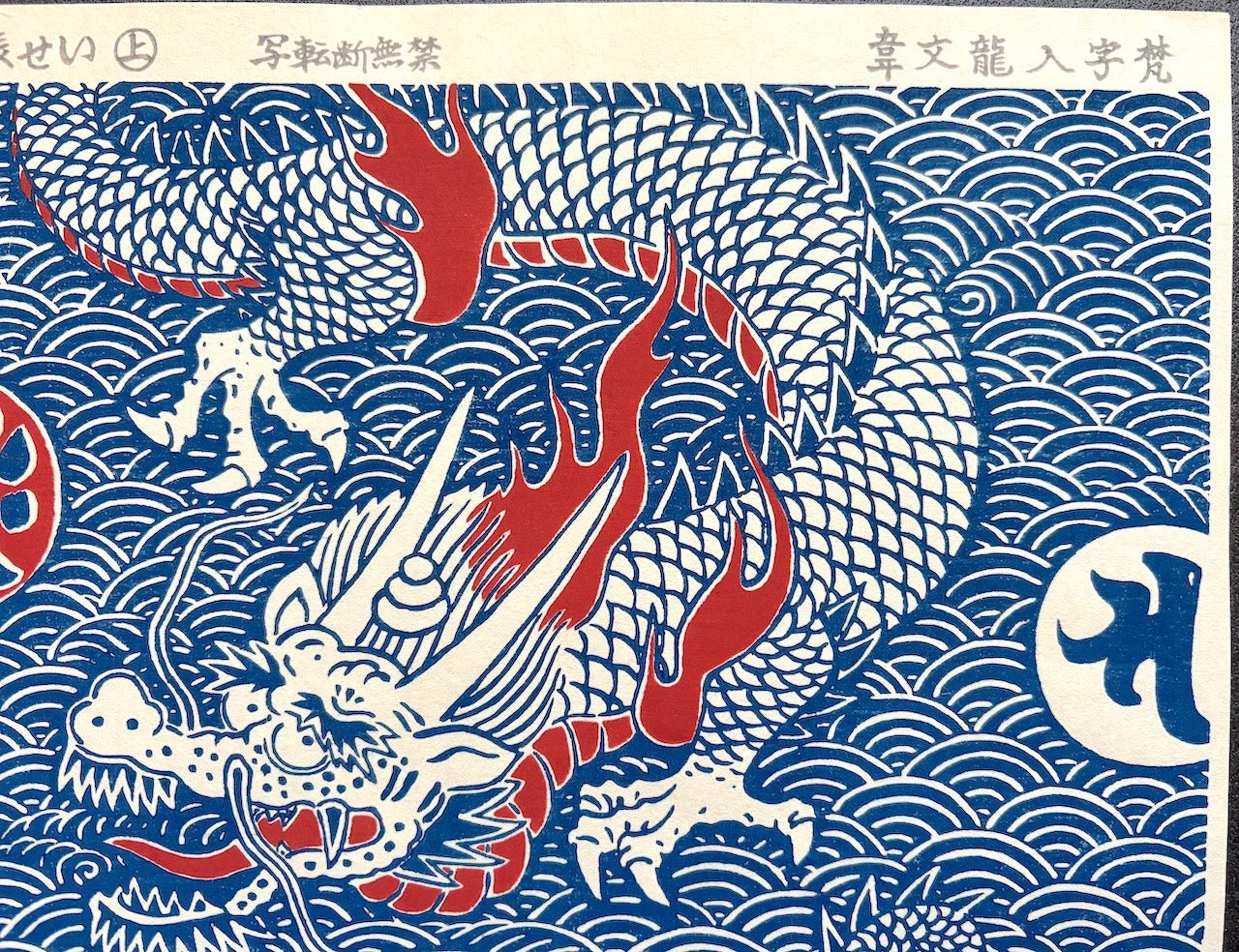 The remarkable dragon print titled Bonji iri Tatsunoekawa (Dragon Design with Sanskrit Characters) is by Isetatsu. Bonji (Sanskrit characters) are sacred symbols representing deities and Buddhas, each expressed through a single character. Two dynamic dragons and these Sanskrit characters are beautifully integrated into the Seigaiha design, a traditional Japanese pattern of overlapping waves.