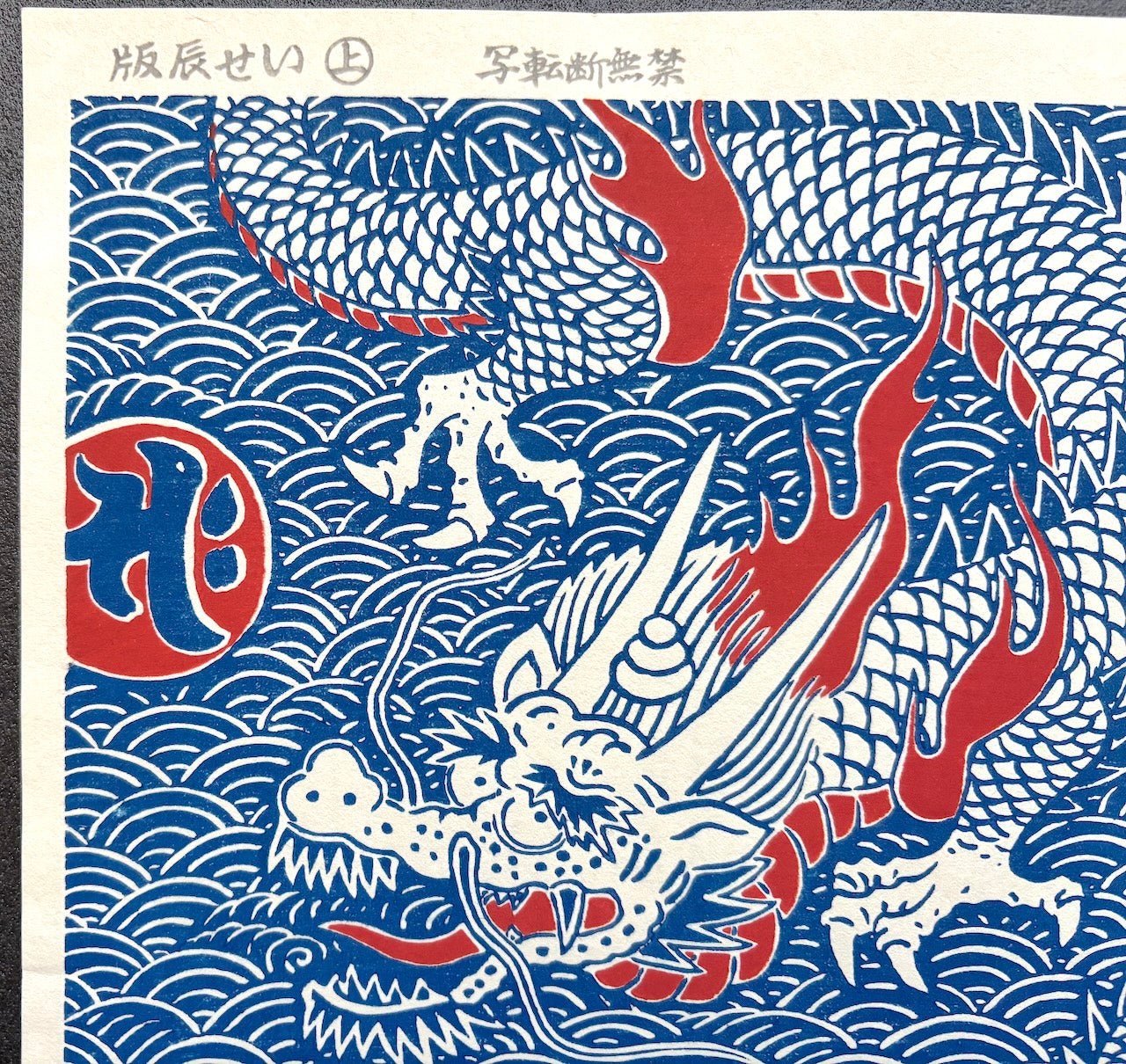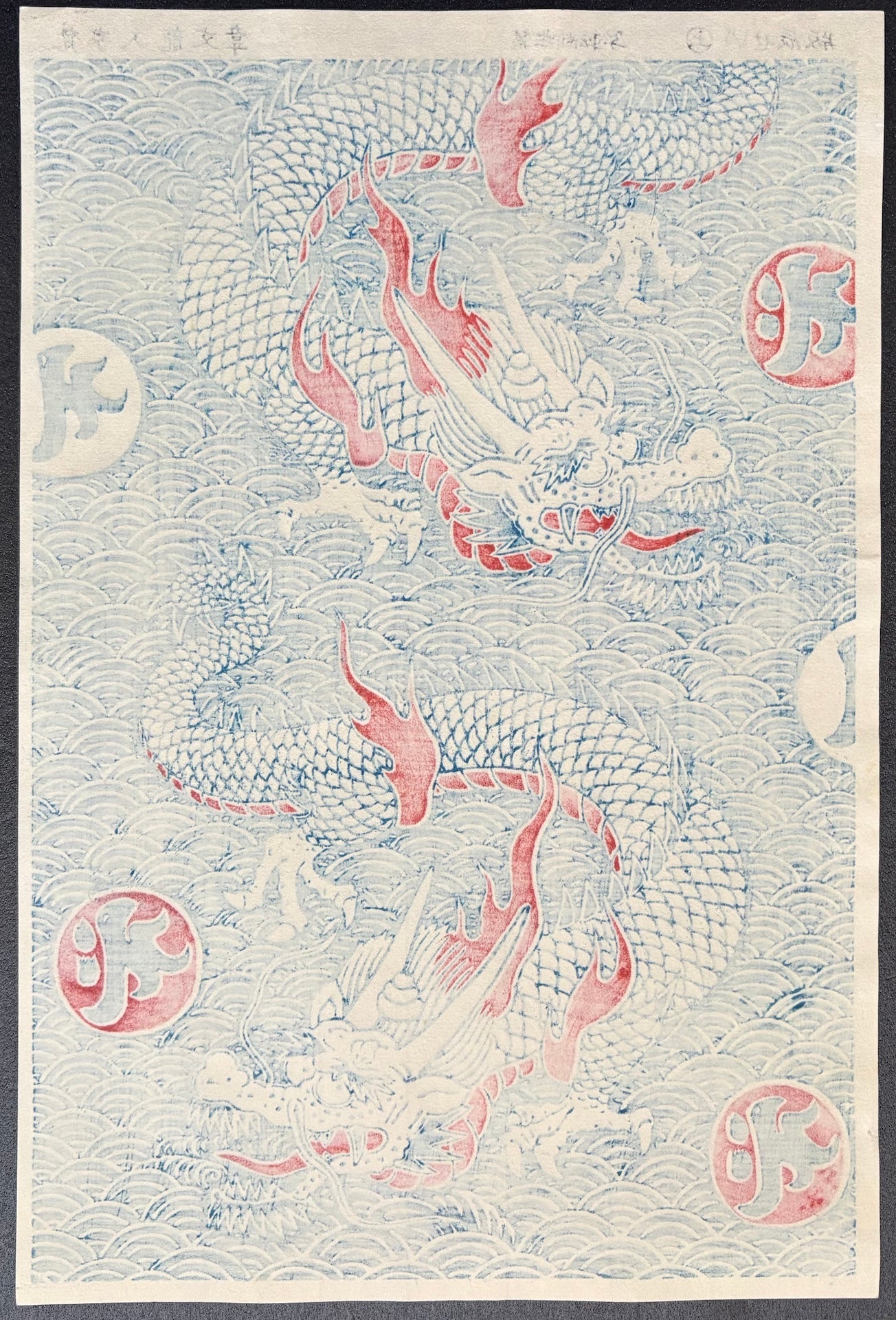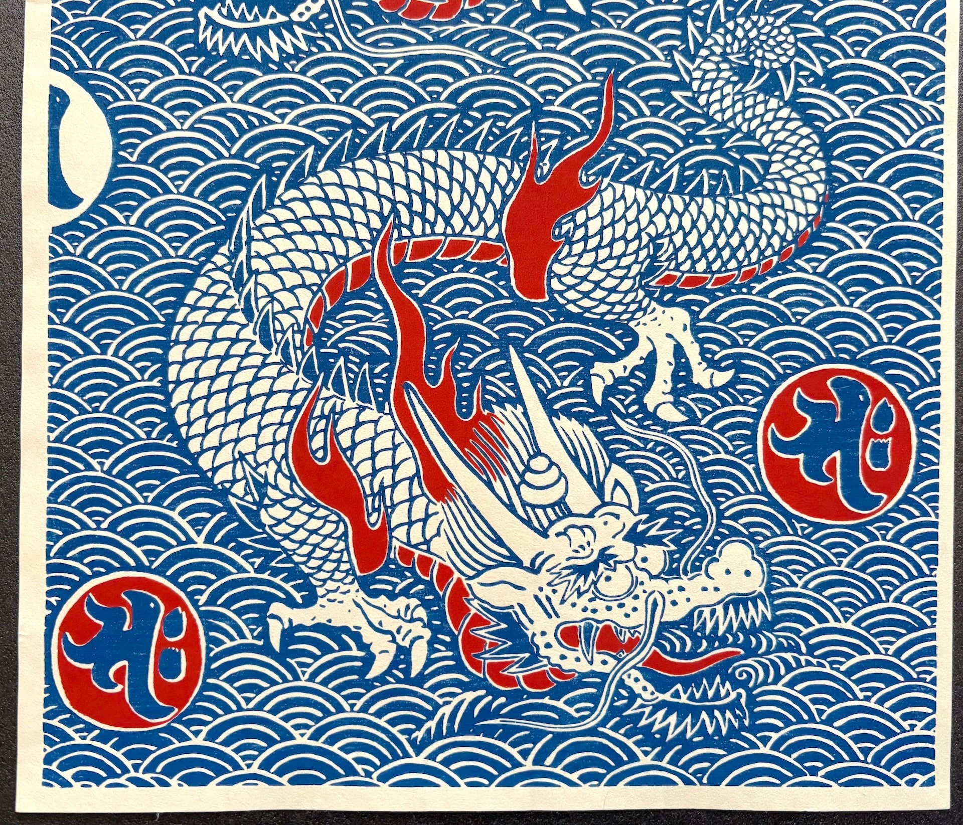 The remarkable dragon print titled Bonji iri Tatsunoekawa (Dragon Design with Sanskrit Characters) is by Isetatsu. Bonji (Sanskrit characters) are sacred symbols representing deities and Buddhas, each expressed through a single character. Two dynamic dragons and these Sanskrit characters are beautifully integrated into the Seigaiha design, a traditional Japanese pattern of overlapping waves.