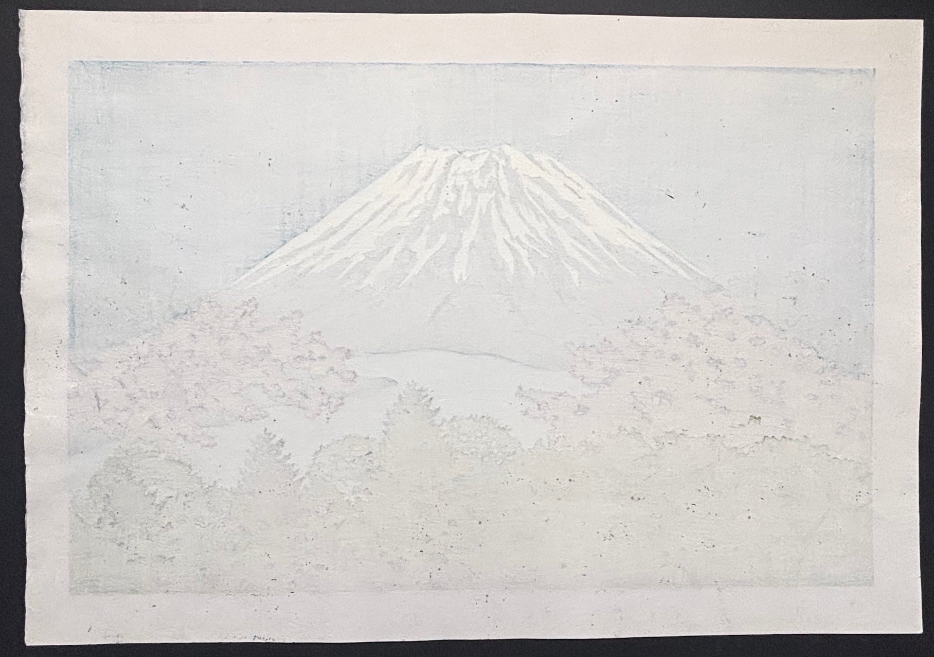 The spectacular woodblock print “Fuji-san to Sakura” (Mt. Fuji and Cherry Blossoms) by Masao Ido captures one of Japan’s most iconic scenes. This exceptionally large work, measuring 25 1/2 × 17 5/8 inches (65 × 45 cm), depicts magnificent cherry trees in full bloom set against the majestic presence of snow-capped Mount Fuji and clear blue sky.