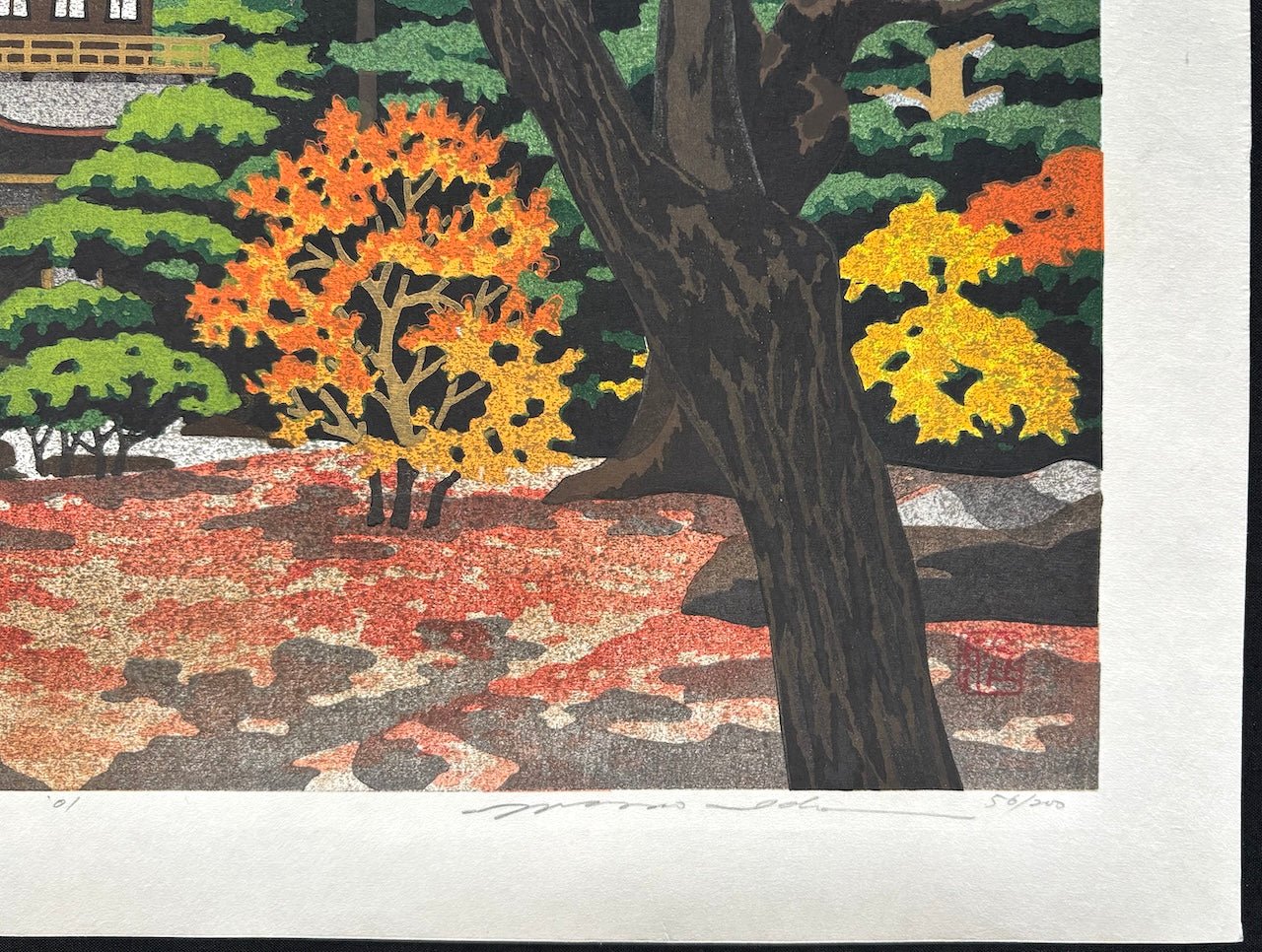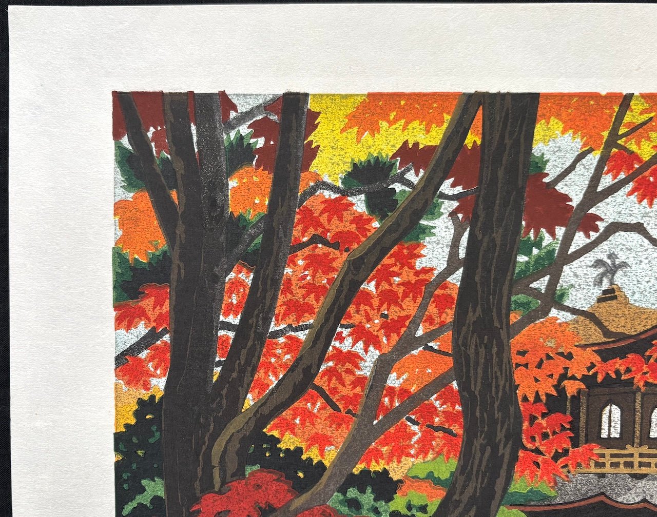 The exquisite woodblock print “Ginkaku-ji” (Ginkaku-ji Temple in Autumn, Kyoto) by Masao Ido (1945–2016) beautifully depicts the serene elegance of Ginkaku-ji Temple, also known as the Silver Pavilion, surrounded by vibrant autumn foliage. The contrast between the tranquil temple and the rich seasonal colors creates a quietly atmospheric scene.