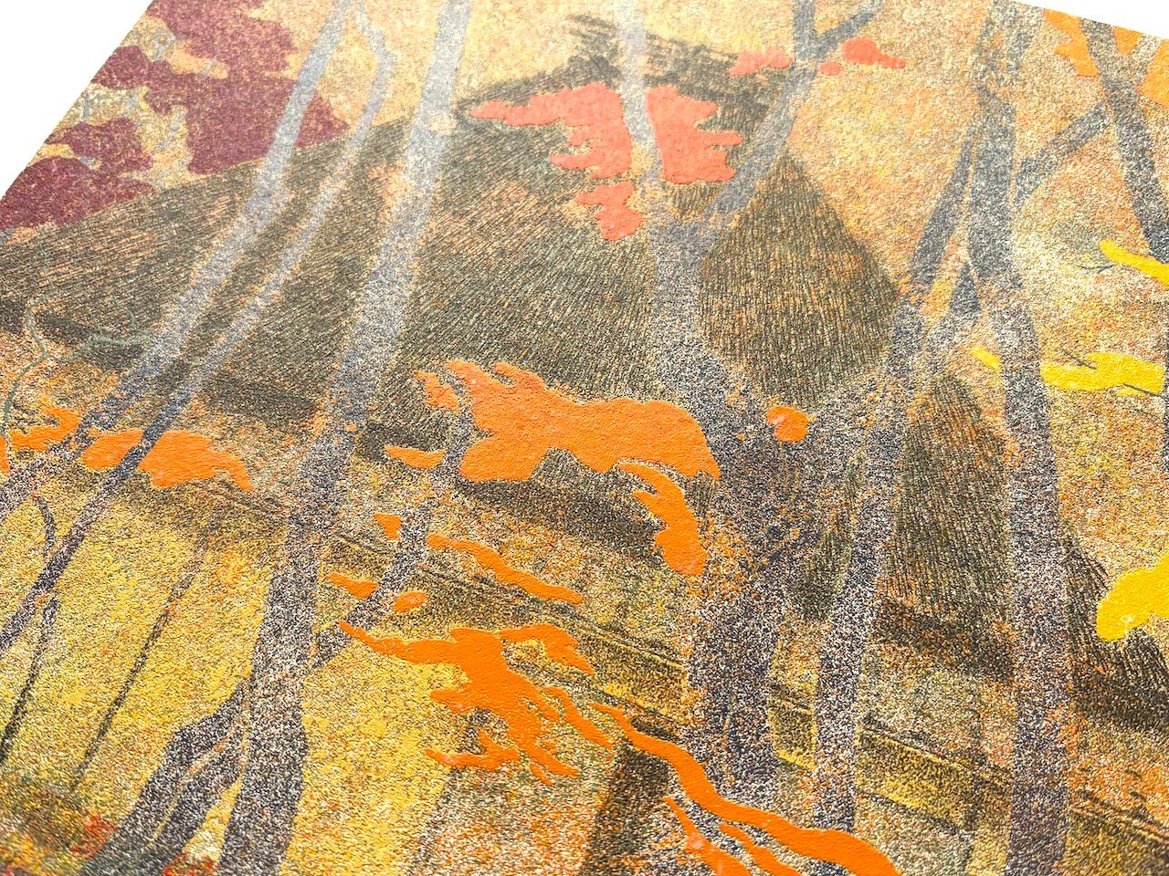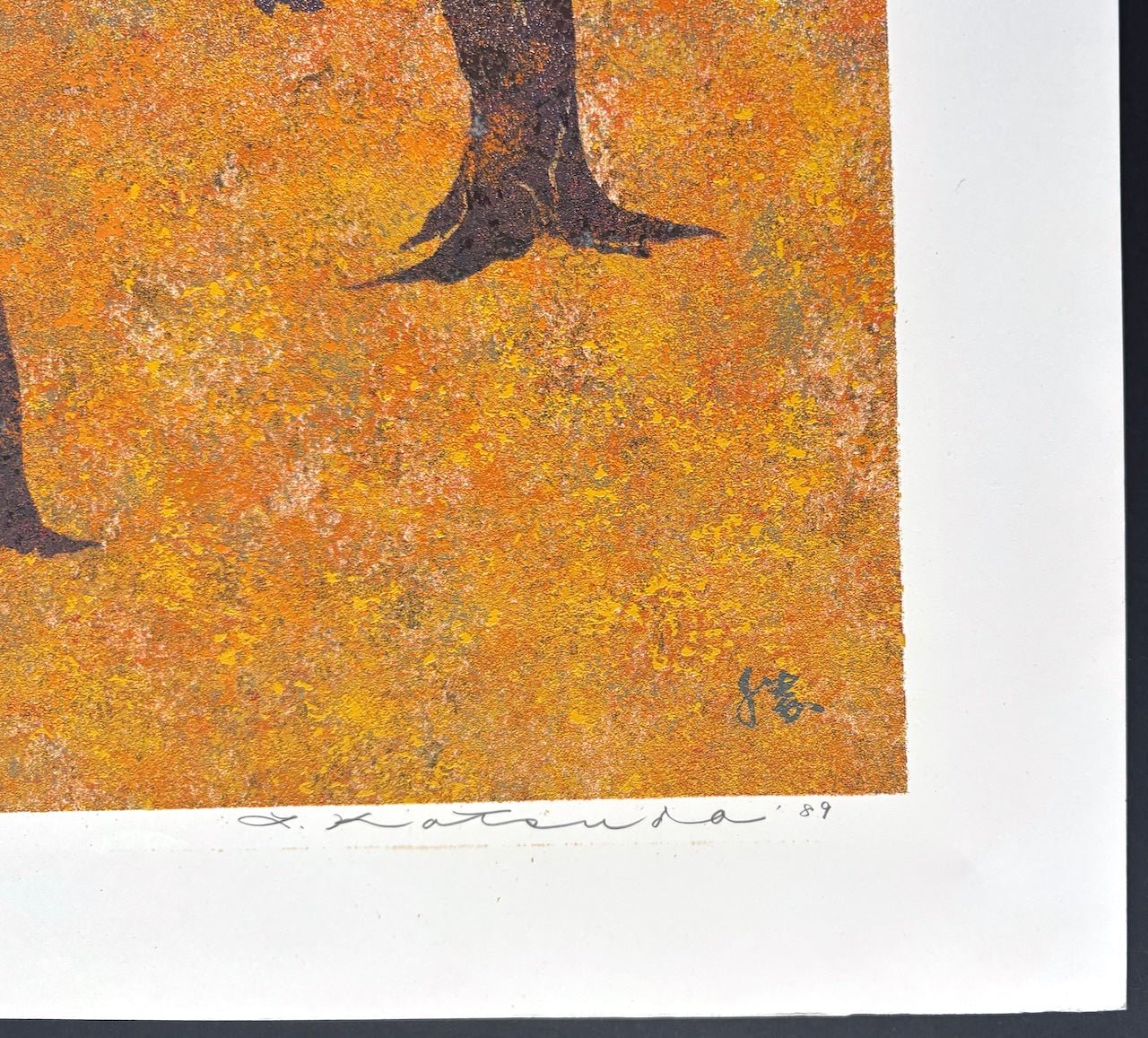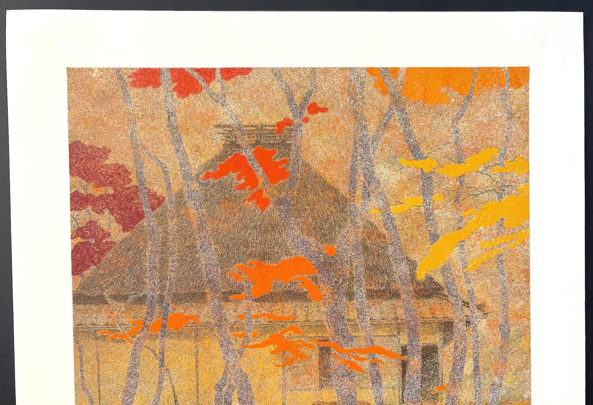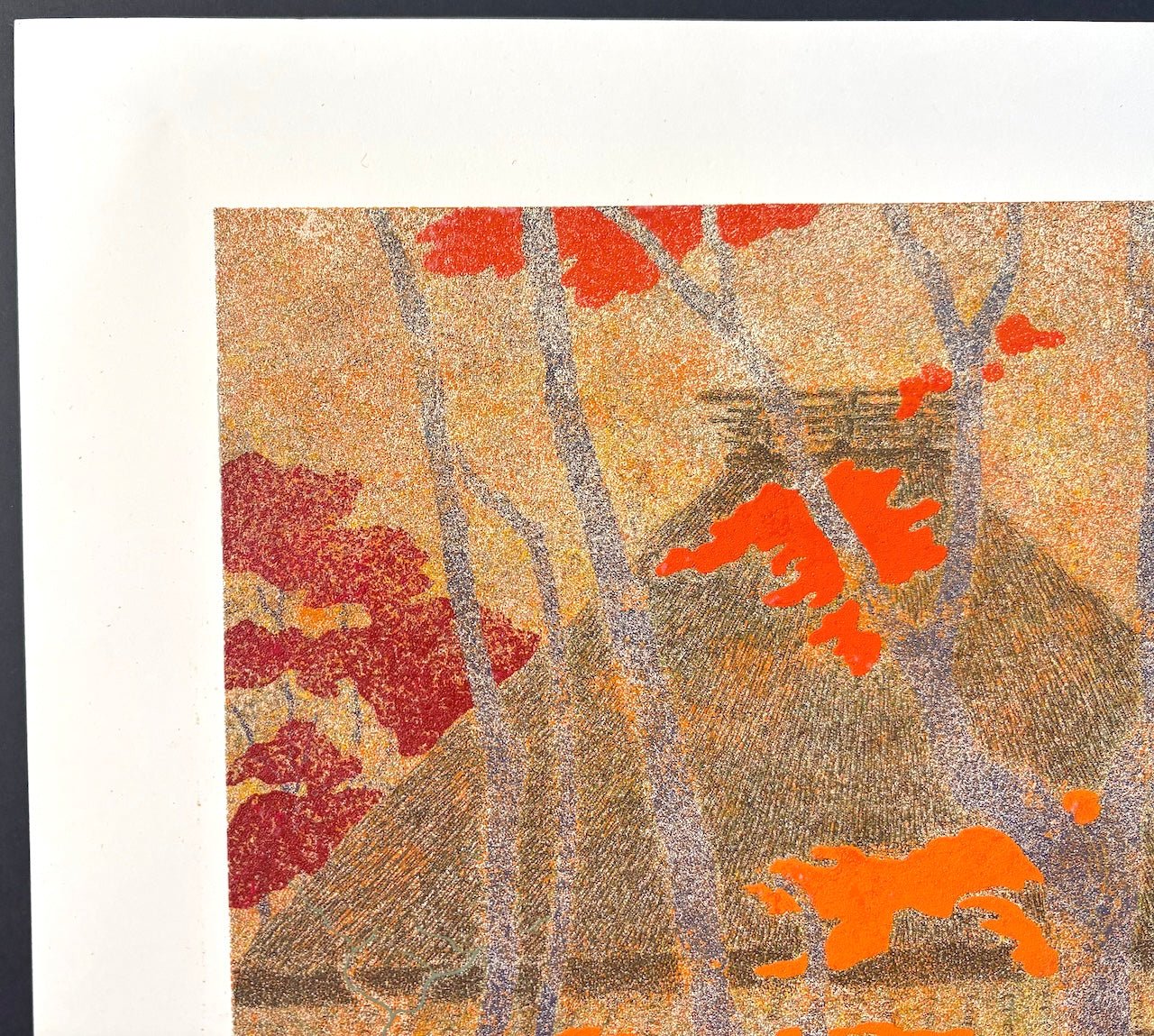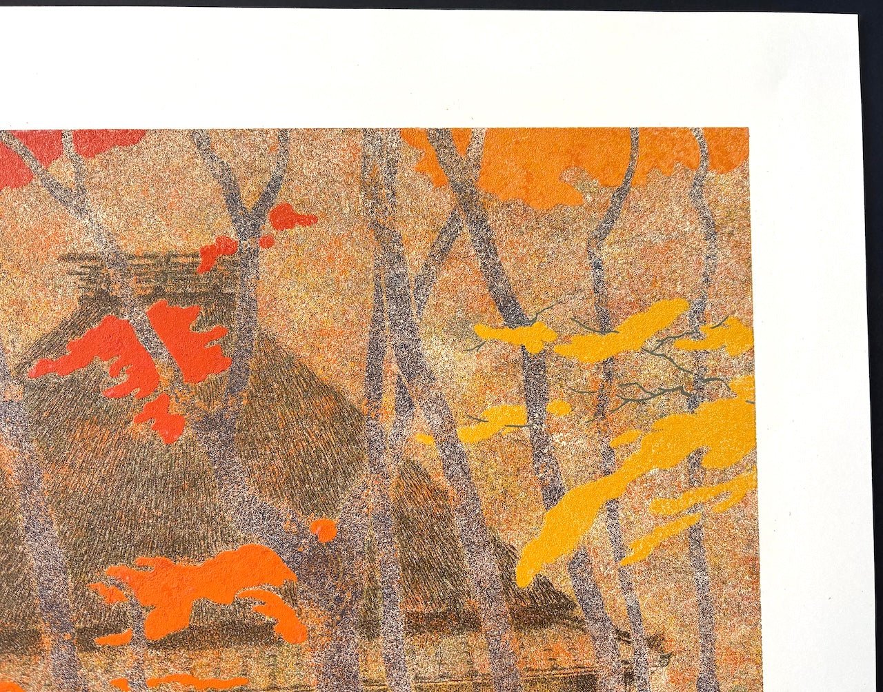 The breathtaking large-format serigraph Gio-ji Temple in Autumn by Yukio Katsuda (b. 1941) beautifully captures the serene autumn scenery of Gio-ji Temple in Kyoto. I visited Gio-ji during the height of the foliage season and was completely breathless and speechless at its beauty. Maple trees throughout the temple grounds glow in vibrant shades of red and orange, while a delicate carpet of fallen leaves resting on the moss creates a magical, almost otherworldly scene. The quiet beauty of this landscape brings a deep sense of peace and calm to the viewer.