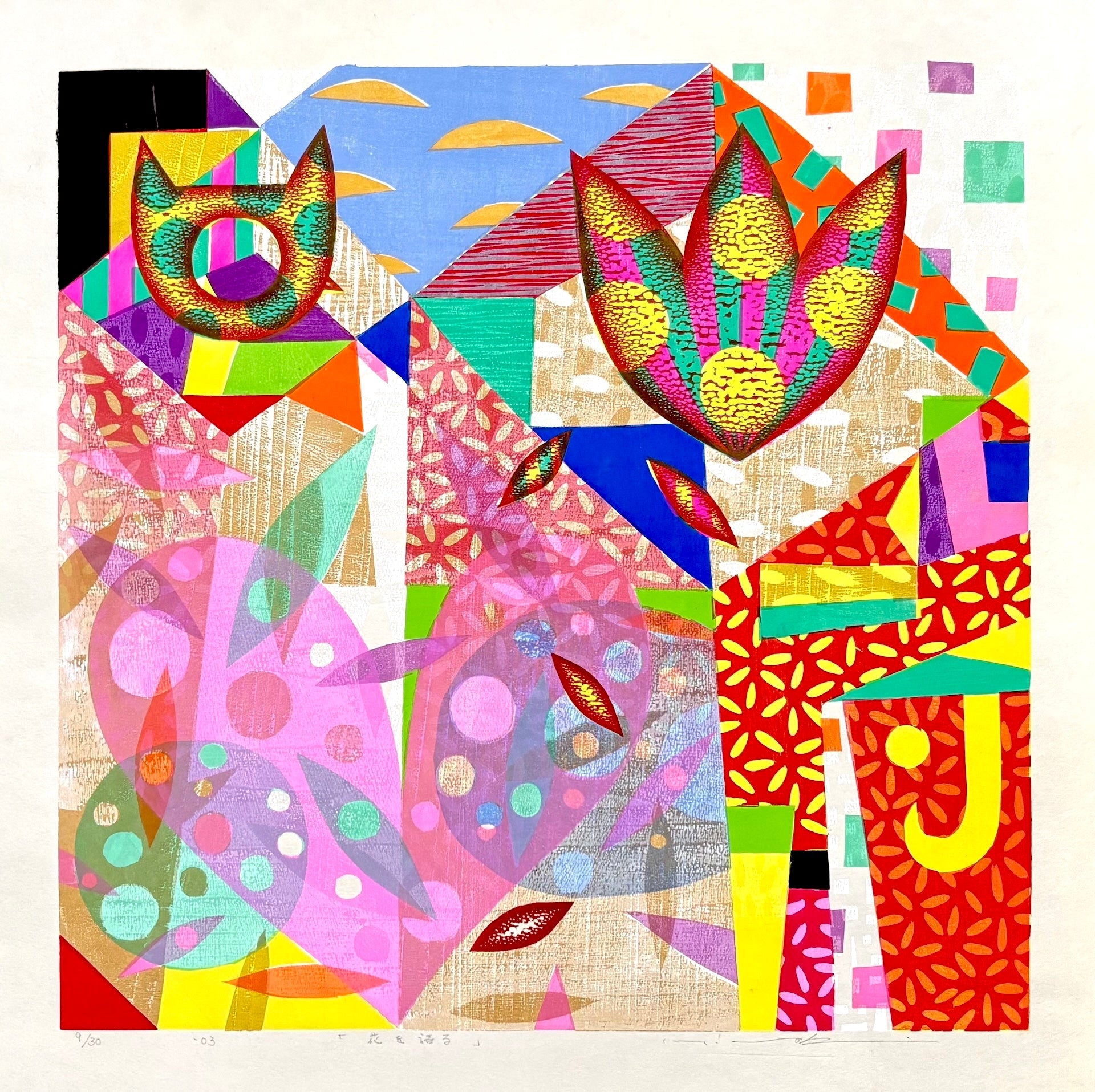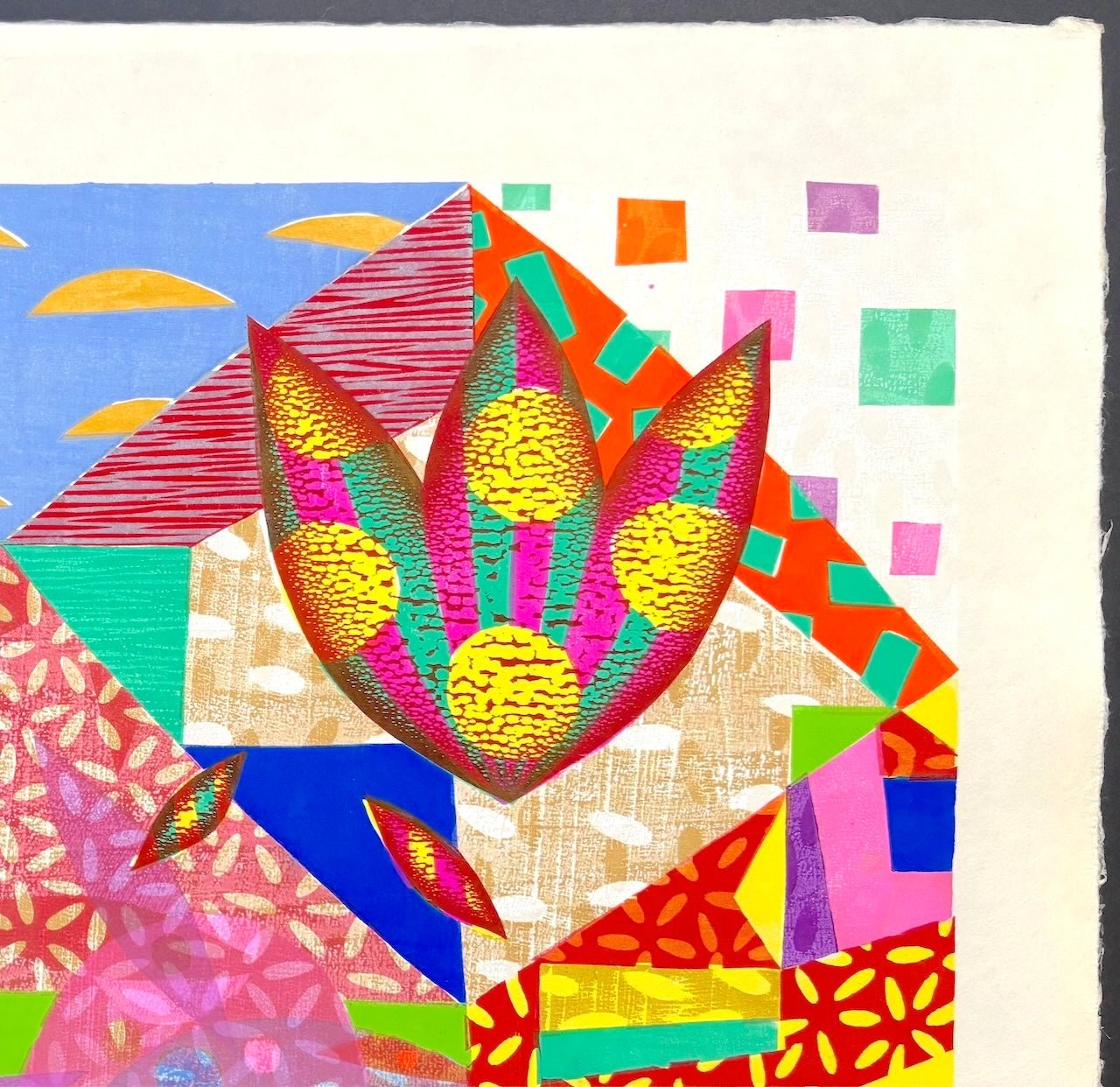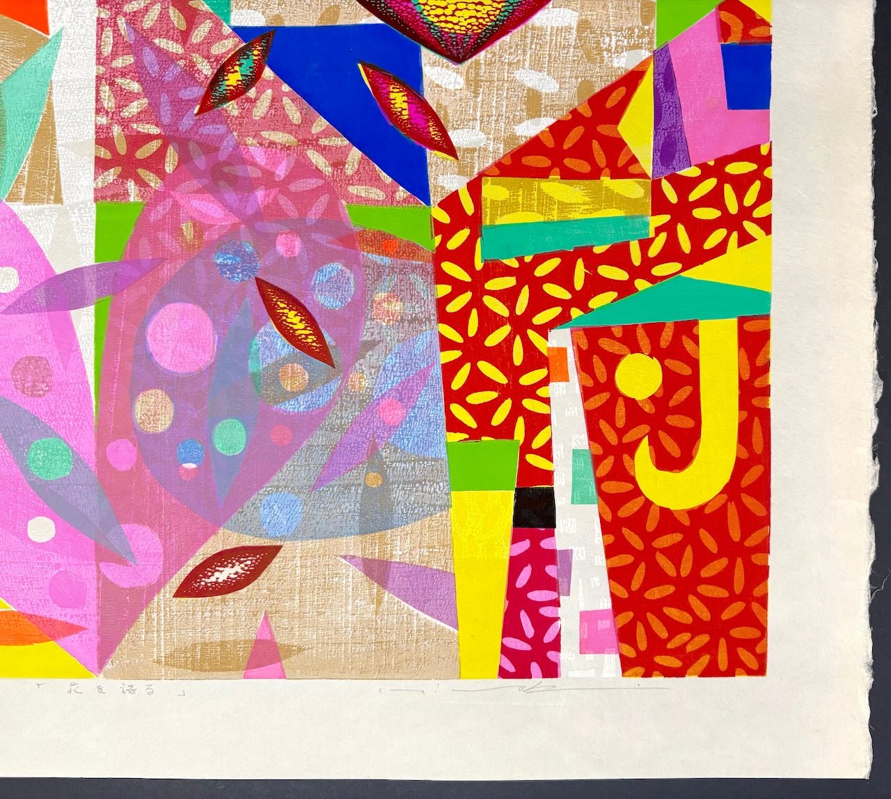 The magnificent woodblock print 'Hana wo Kataru' (Speaking Flowers) by Mitsuru Hiraki (b. 1958) presents a festive harmony of vibrant hues and variations in color that immediately draw the viewer’s eye. This large-format work radiates positive energy and joy, speaking for itself as a truly beautiful and uplifting piece.