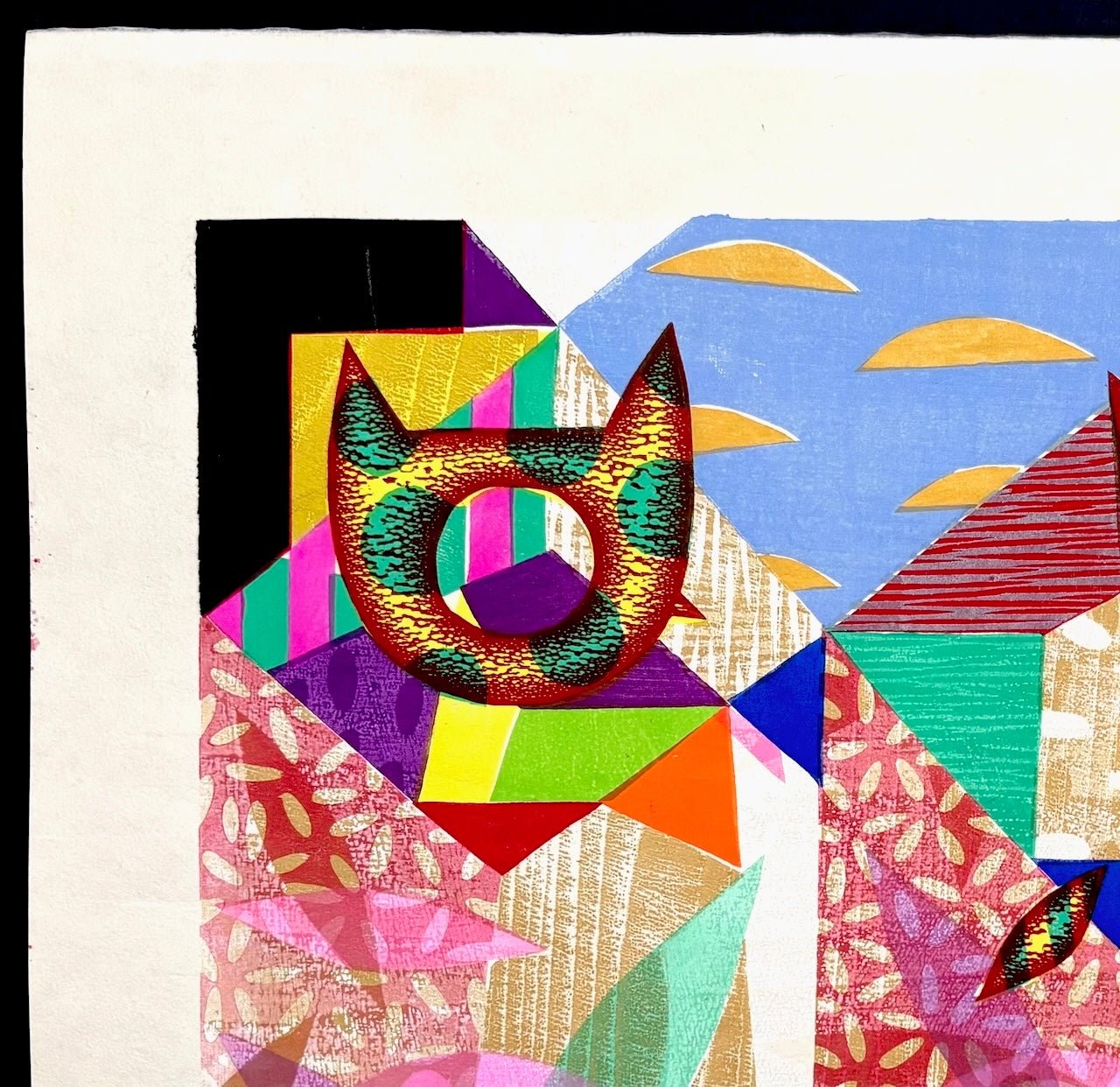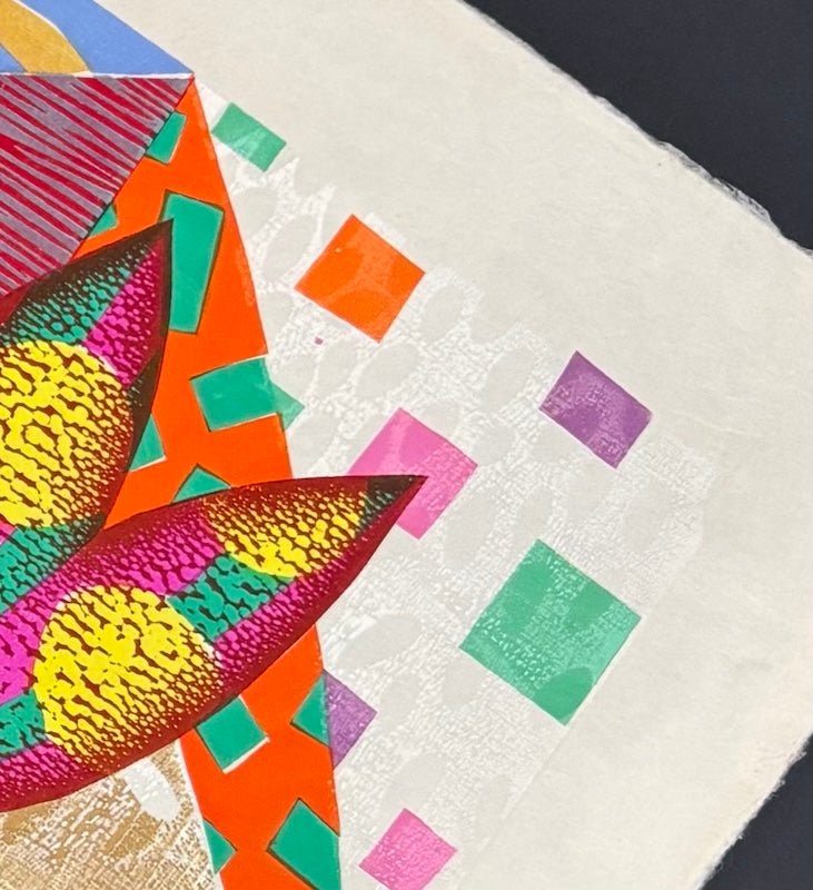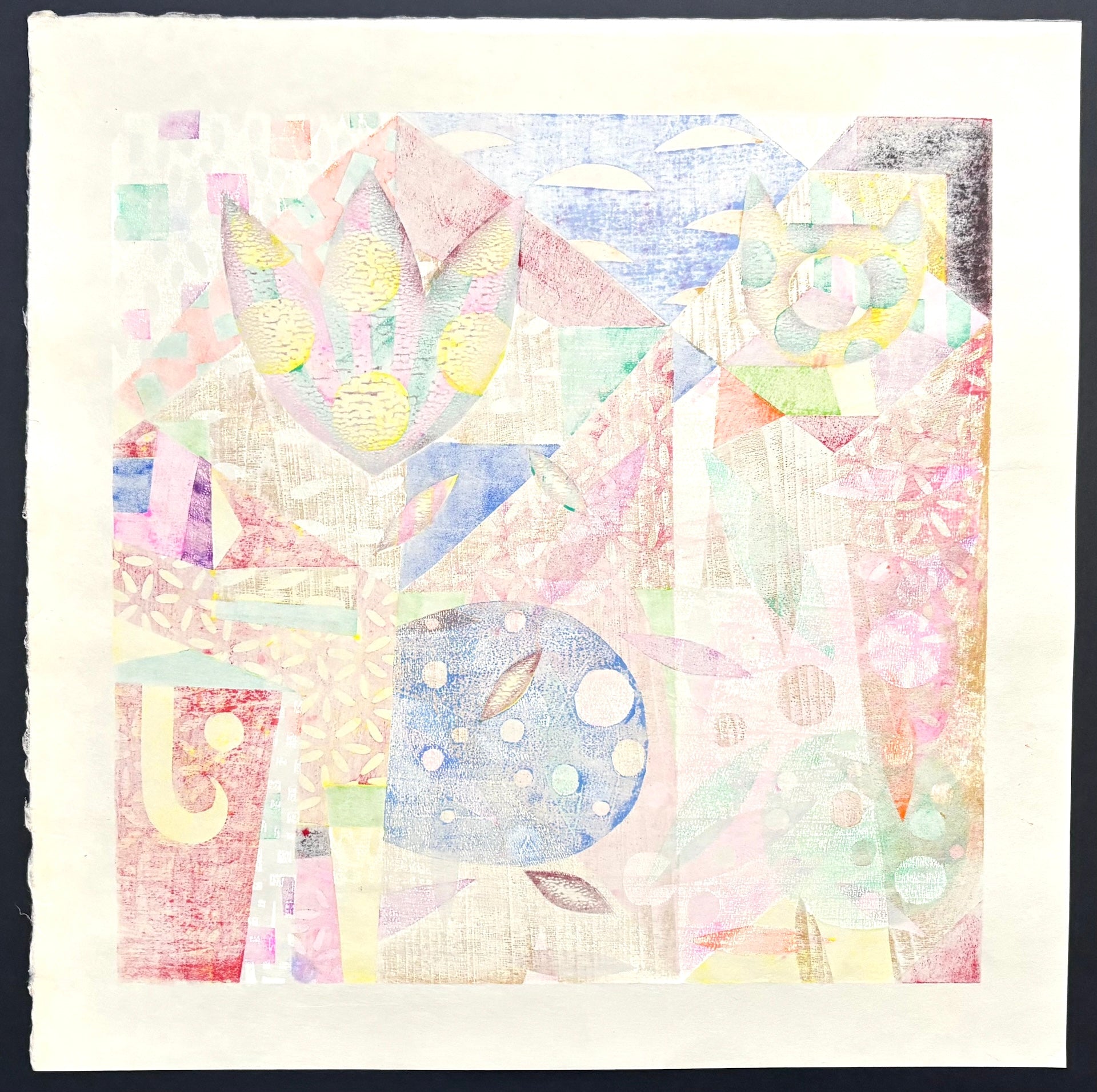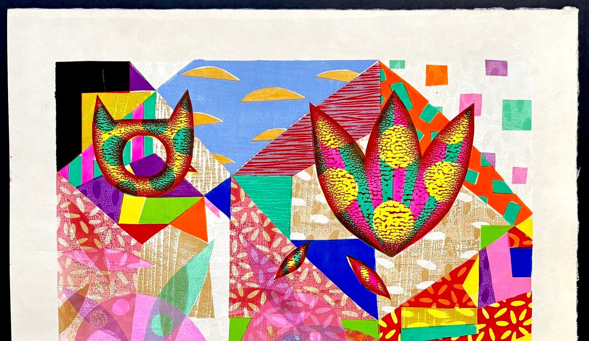 The magnificent woodblock print 'Hana wo Kataru' (Speaking Flowers) by Mitsuru Hiraki (b. 1958) presents a festive harmony of vibrant hues and variations in color that immediately draw the viewer’s eye. This large-format work radiates positive energy and joy, speaking for itself as a truly beautiful and uplifting piece.