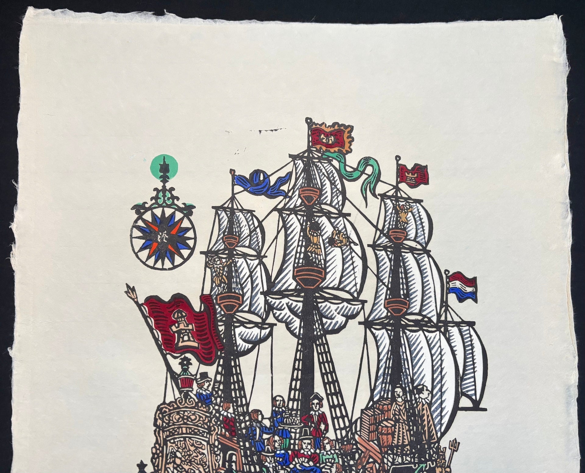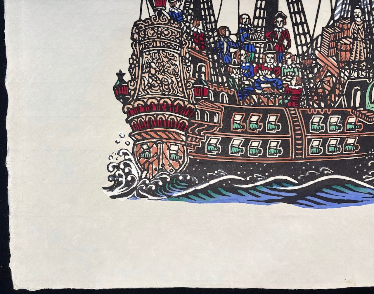 The remarkable woodblock print “Nanban-sen” (Nanban Ship) is by Sumio Kawakami (1895–1972). This large-format print is a later impression from the original blocks carved in 1939, printed with a single black block and then hand-colored. The image is exotic and visually striking, with rich, well-balanced colors.