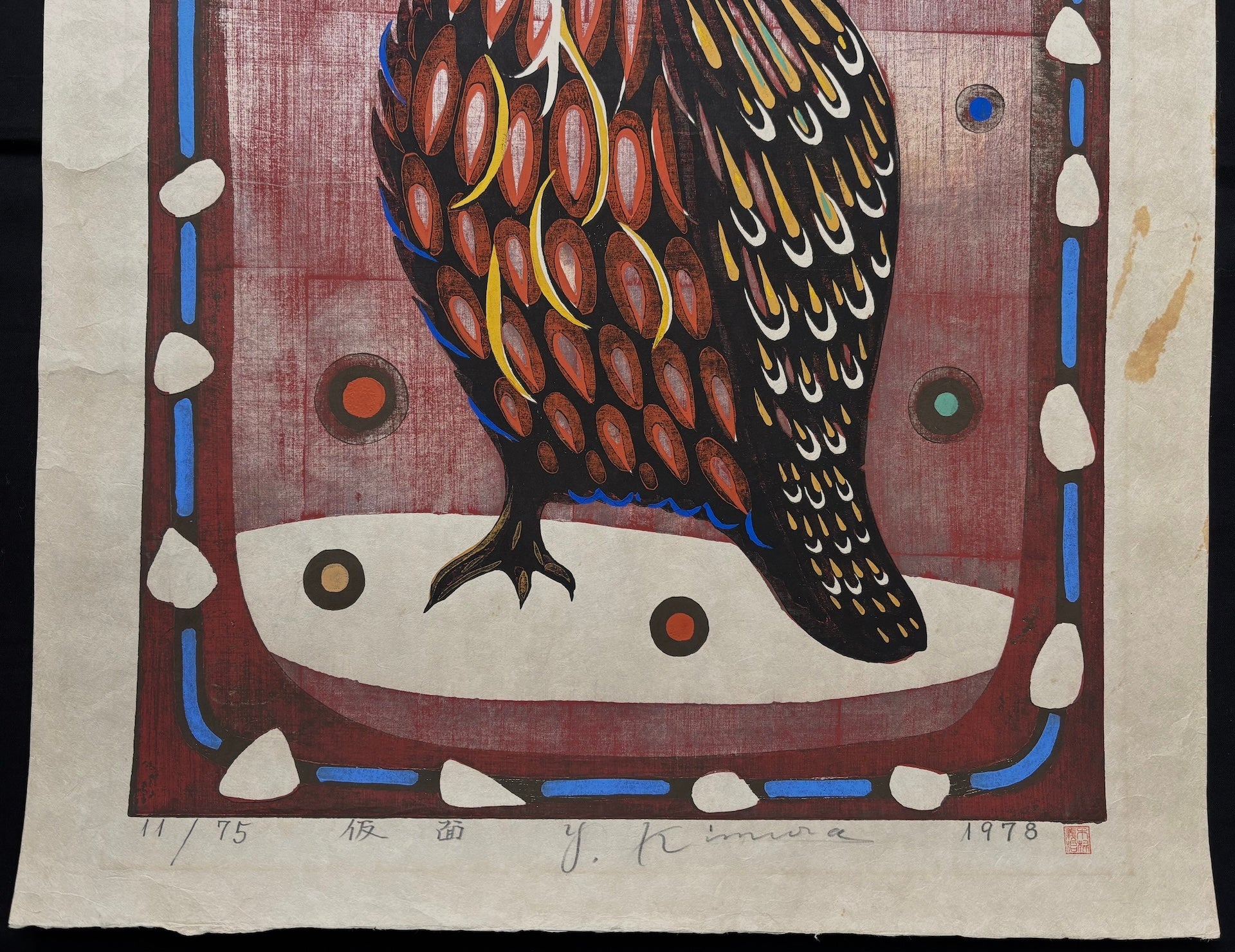 An extra-large and captivating woodblock print, "Kamen" (Mask), by Yoshiharu Kimura (b. 1934). This mesmerizing piece features a majestic owl set against an exotic, metallic background that shimmers with mystery and allure. The print speaks its own poetic language—deeply evocative and profoundly artistic. We were instantly drawn to the enchanting colors and harmonious composition.