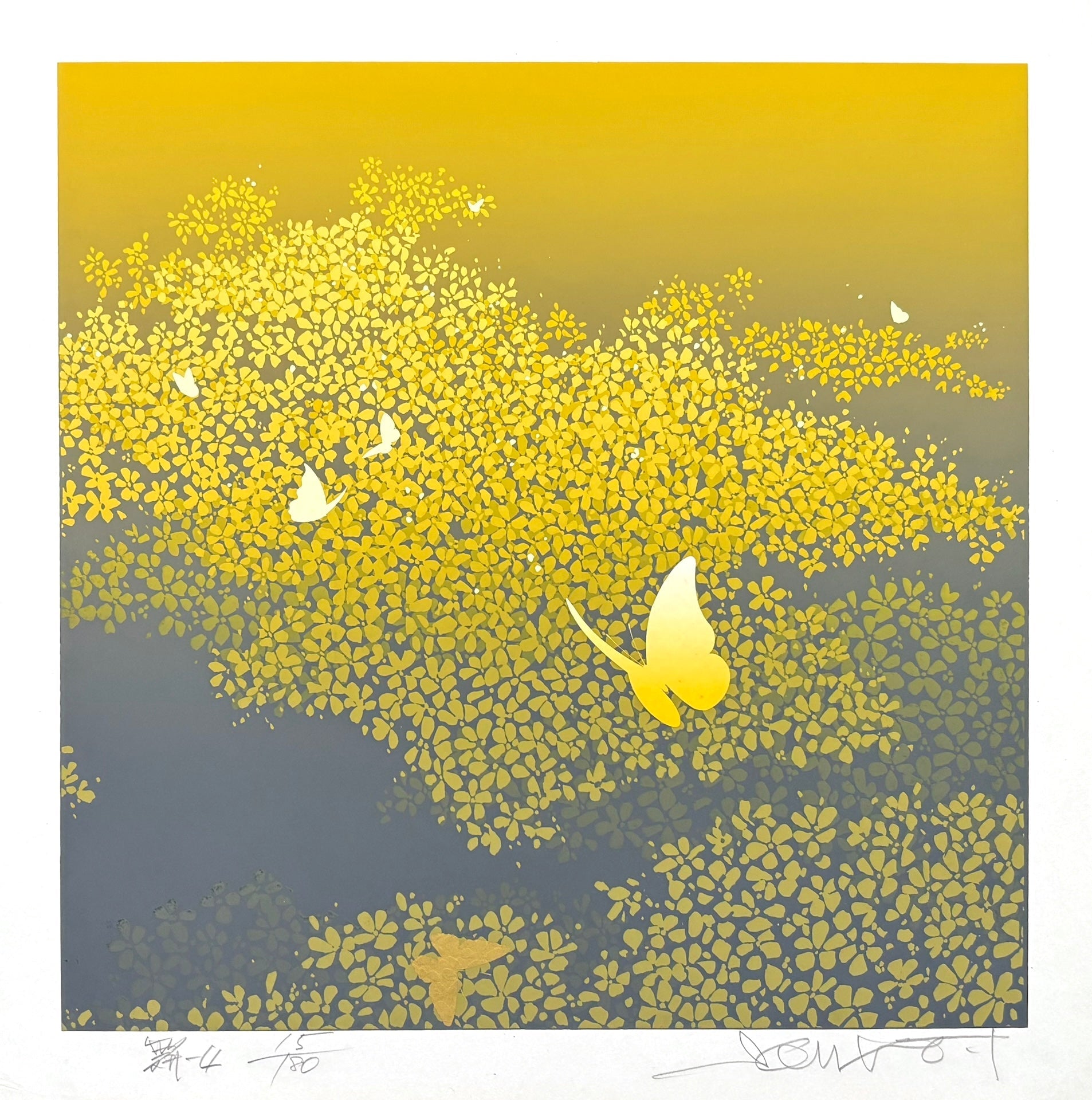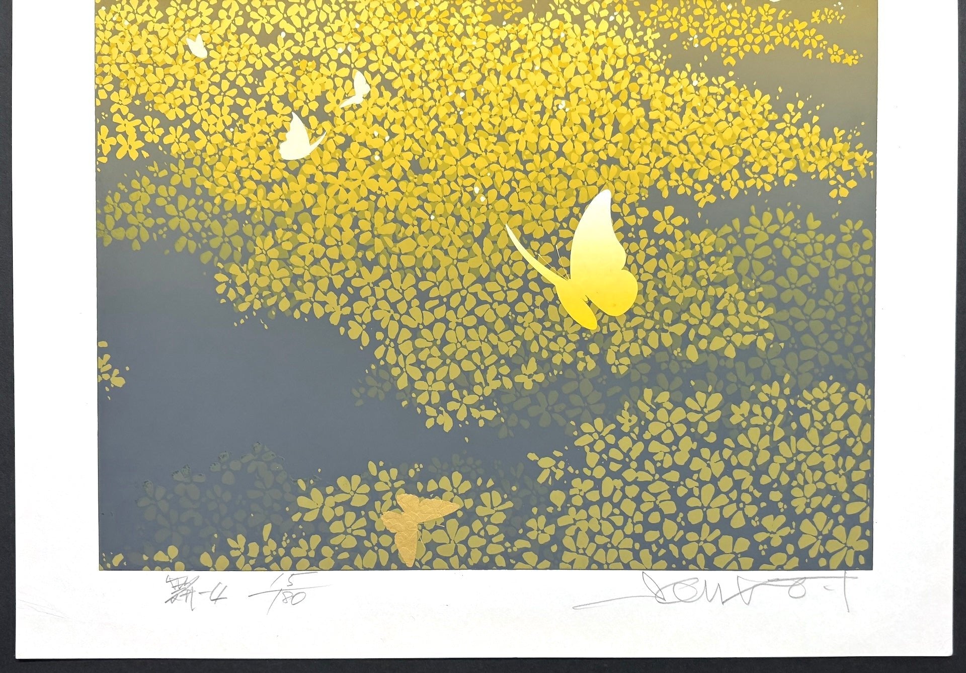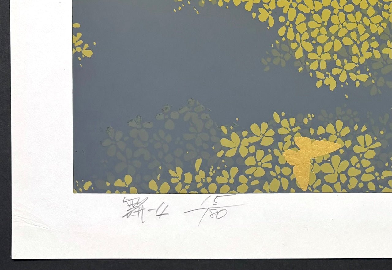 The breathtaking silkscreen print 'Mai-4' (Dance -4) is by Soho Ikegami (b.1940). This print captures a gentle ballet of butterflies drifting above a field of delicate flowers. Their weightless movement creates a scene of quiet harmony, evoking a feeling of calm and tenderness. Subtle, nuanced shading deepens the atmosphere, allowing the artwork’s serene beauty to softly unfold.