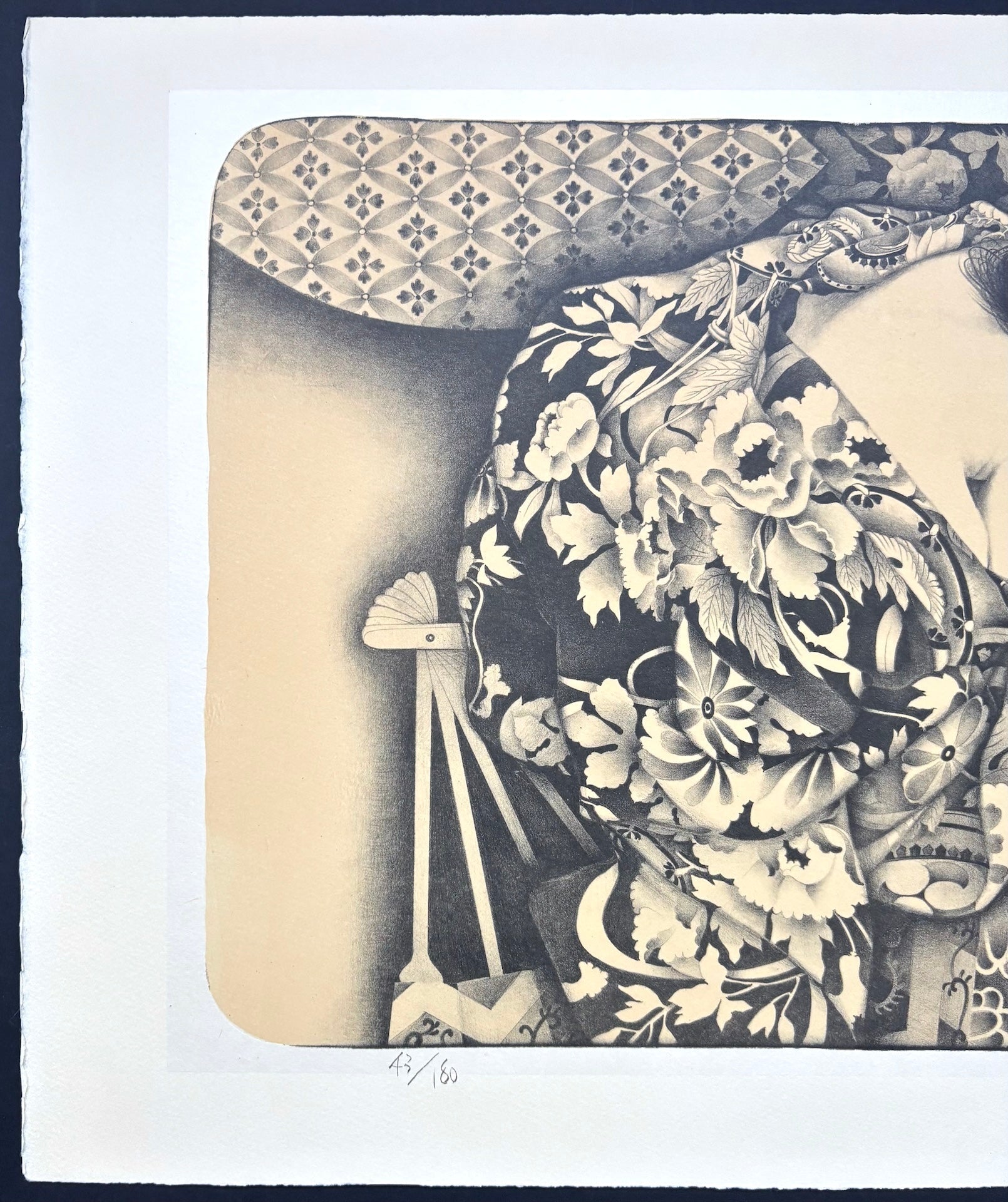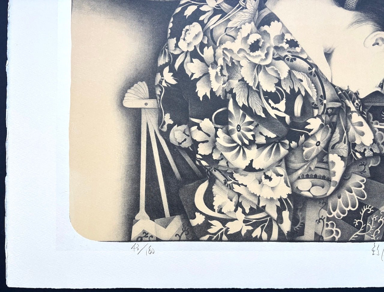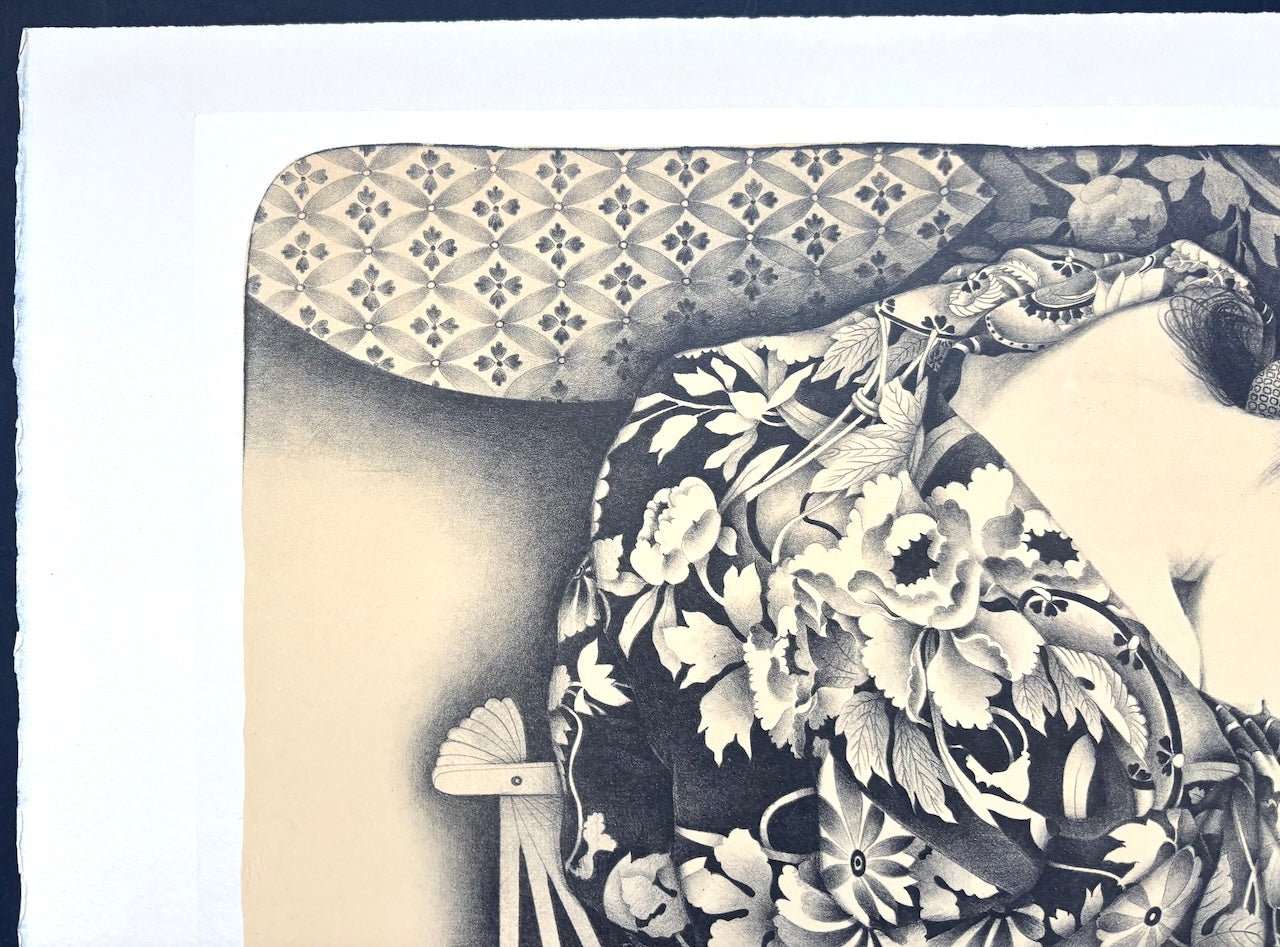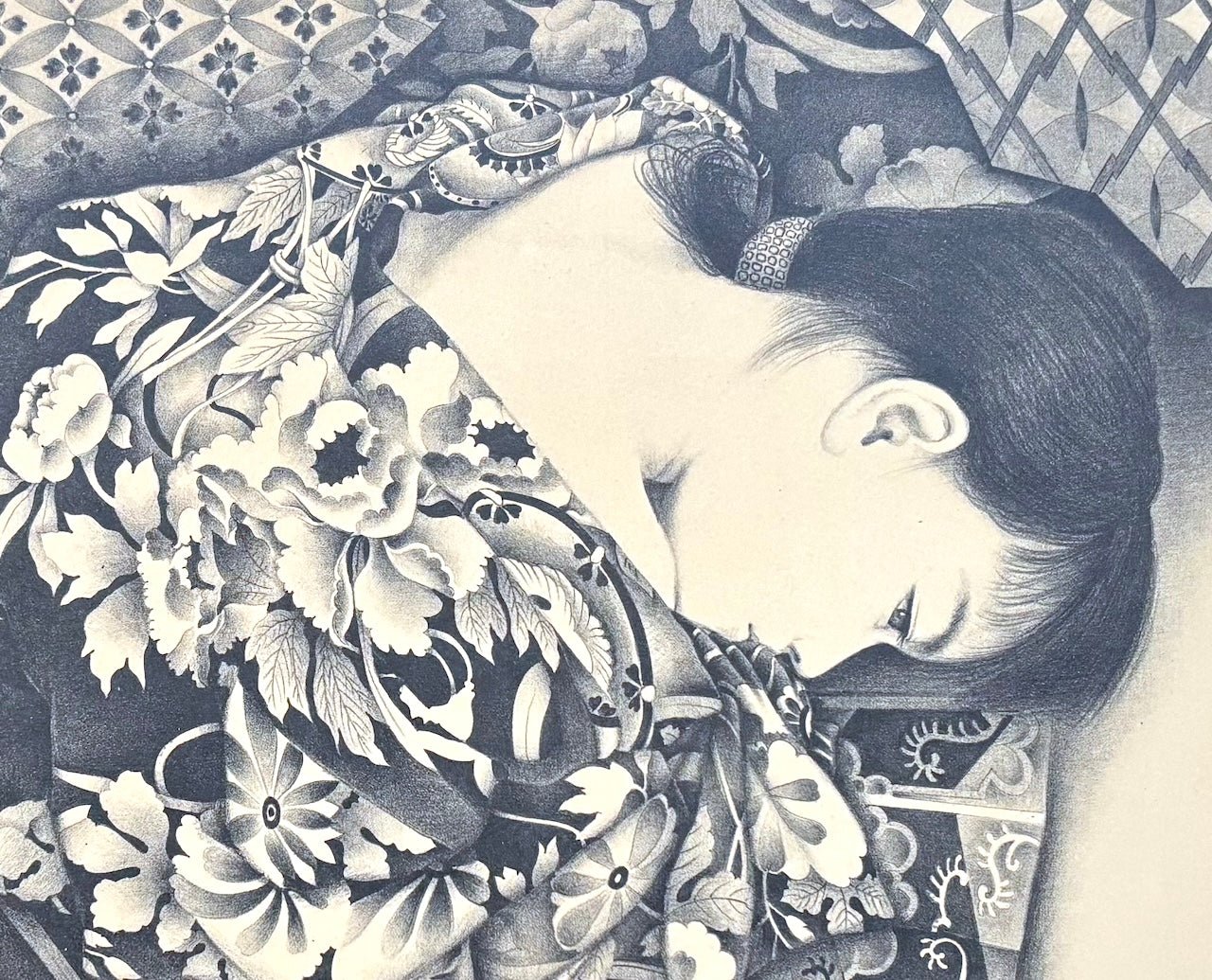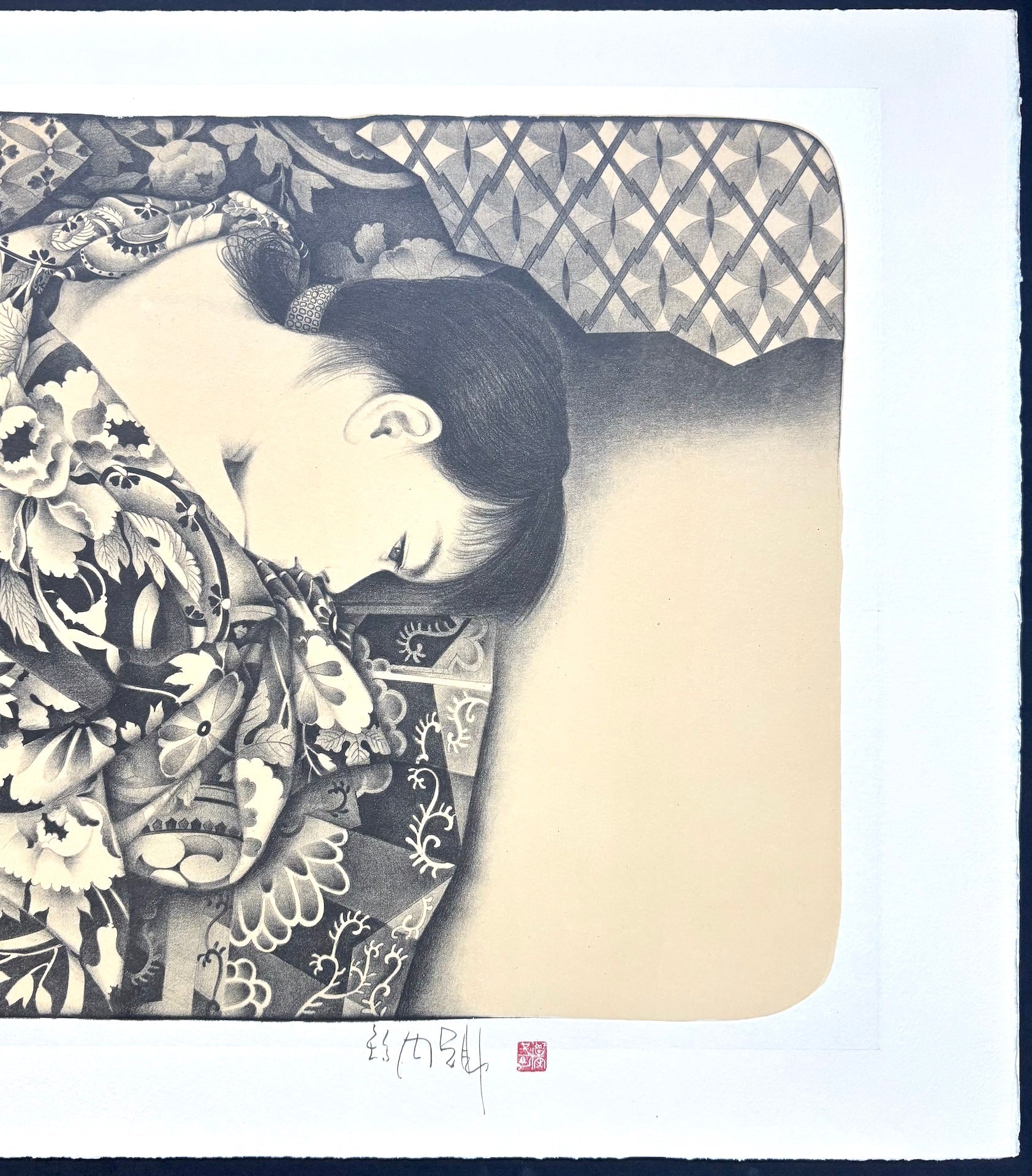 A beautiful lithograph, “Hito (Human Being),” is by Kyosuke Chinai. The composition portrays a young girl wearing a kimono adorned with a bold peony pattern, quietly lost in thought. The restrained palette of black and beige tones gently envelops the figure, creating a warm atmosphere and an air of quiet refinement. It is a truly beautiful work.