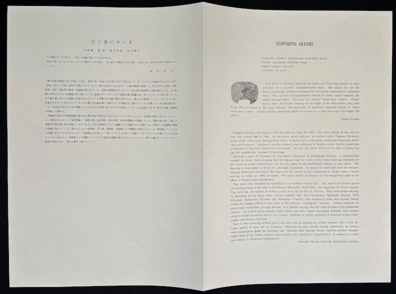 The beautiful woodblock print “Flowering Grasses” is by Kuninao Utagawa (1793–1854). The print is in a horizontal round-fan (uchiwa-e) format, depicting the moon and flowering grasses in autumn. The cultivated chrysanthemums in three colors enhance the tender, seasonal atmosphere. This is a graceful and refined Japanese design featuring the classic “moon-viewing” (tsukimi) theme. In Japan, it is a tradition to arrange autumn flowers in a vase and enjoy the full moon.