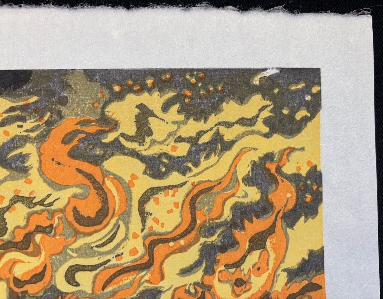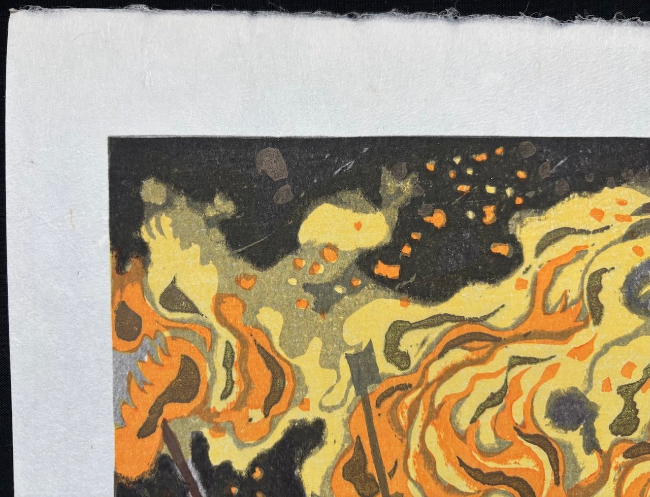 The remarkable woodblock print 'Takisan-ji Oni matsuri' (Takisan-ji Temple Demon Festival) is by Fumio Kitaoka (1918–2007) and was printed in 1977. This print beautifully captures the energy and excitement of the Takisan-ji Oni Matsuri (Fire Festival) in Aichi Prefecture, immersing the viewer in the power of the fire as if they are right there amidst the celebration Takisan-ji Oni Matsuri (Takisan-ji Temple Demon Festival) is a celebration of peace and abundant harvest that has continued for 800 years since the Kamakura period.