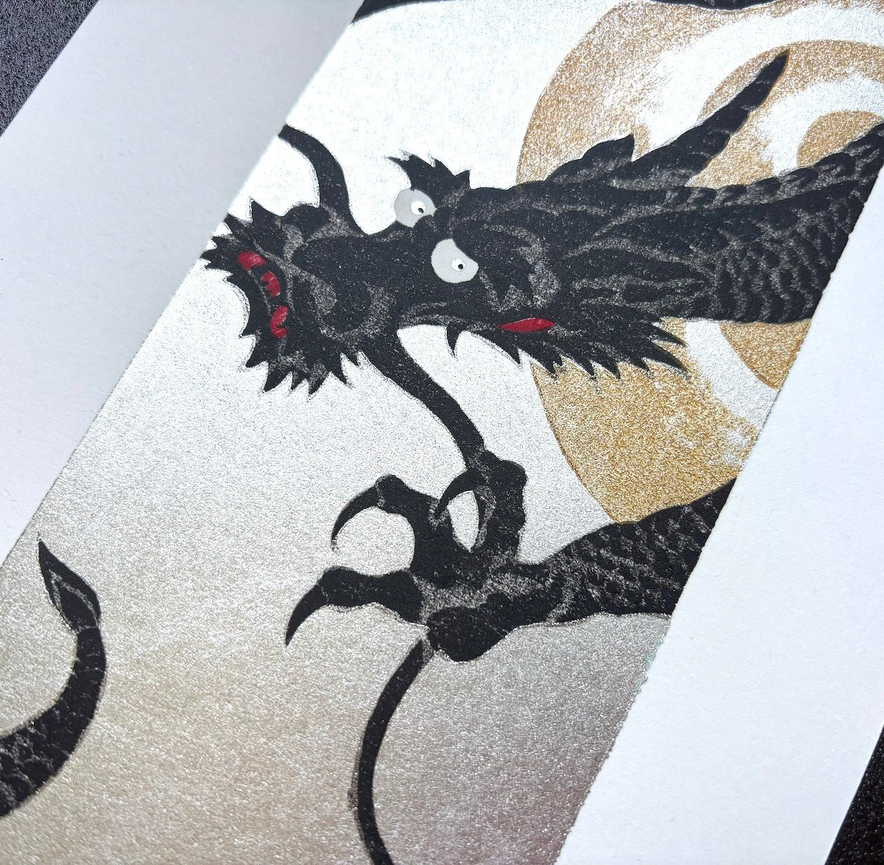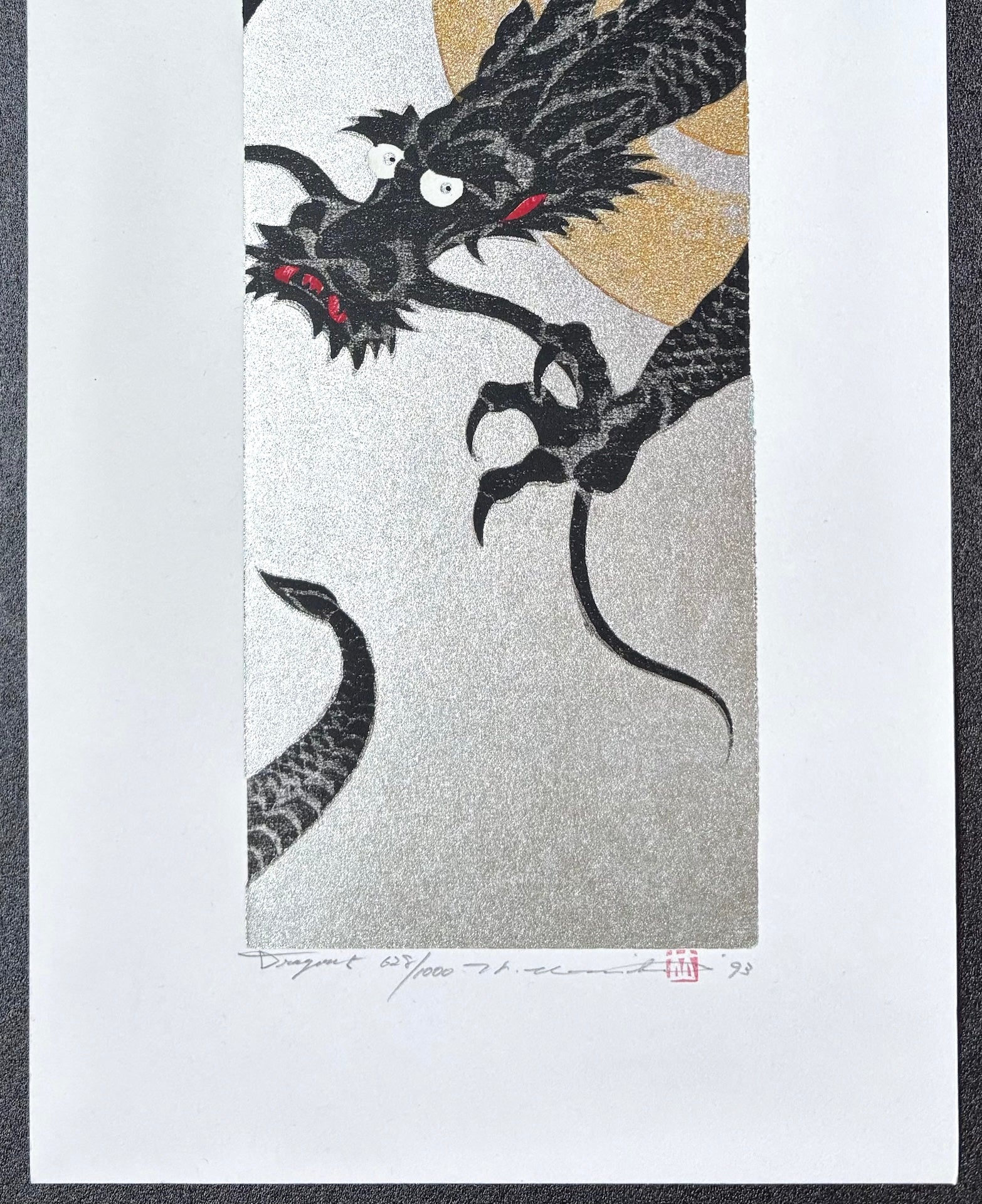 The striking woodblock print 'Dragon 5' by Hajime Namiki features a bold black dragon set against a shimmering silver background. The powerful contrast of colors immediately captures the eye, while the dragon’s face is rendered with remarkable expression, adding a sense of character and vitality to the work.