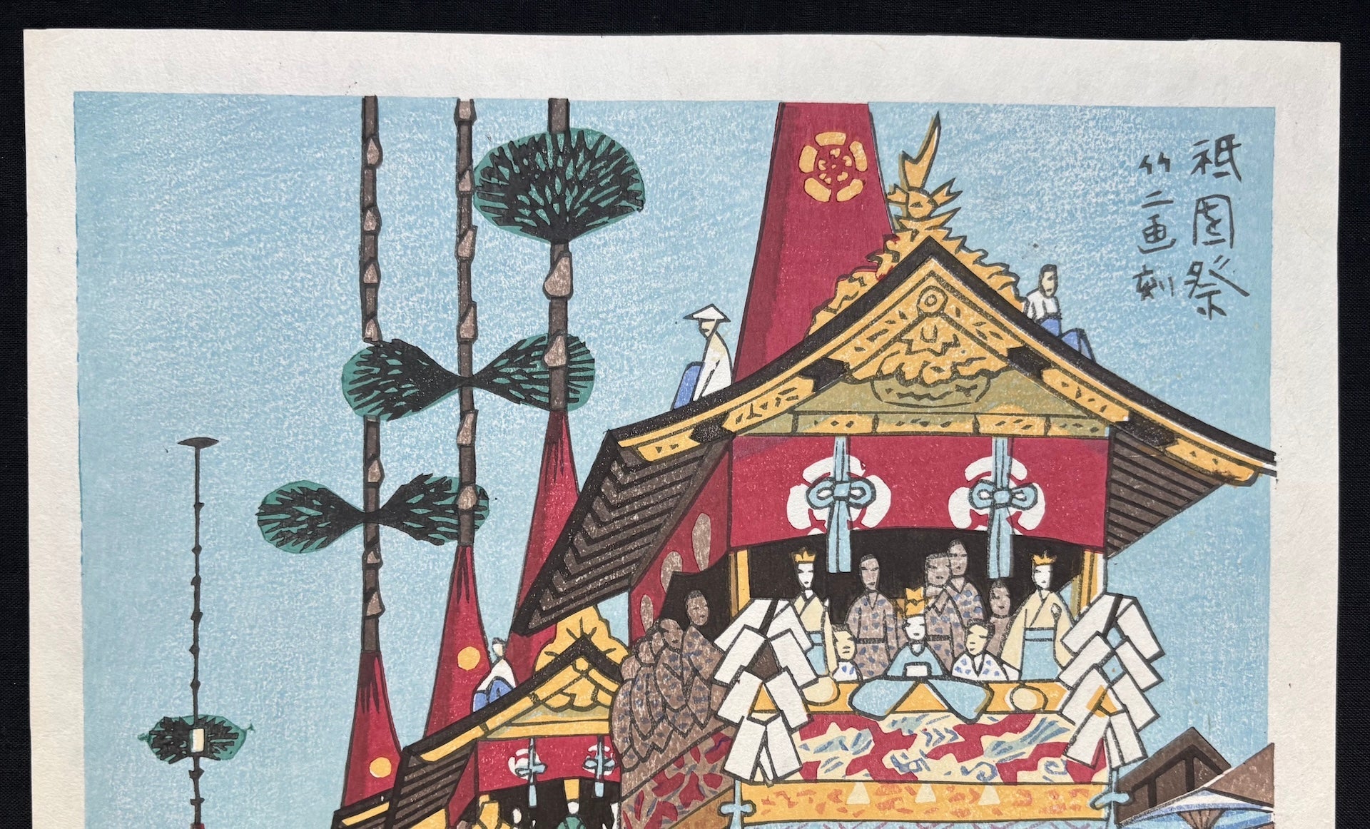 The cheerful woodblock print "Gion Matsuri" (Gion Festival, Kyoto) is by Takeji Asano, from his well-known "Kyoraku Gyoji" (Events of Kyoto) series. This print captures Kyoto's most iconic festival, which draws visitors from around the world. The focal point is a Yamaboko float—an essential highlight of the Gion Festival. Asano enriches the scene with an array of colorful umbrellas beneath the float, enhancing the vibrancy and creating a visually stunning composition. Titled "Gion Matsuri" (Gion Festival) and "Takeji ga, koku" (Drawn and carved by Takeji) in the upper right corner of the image.