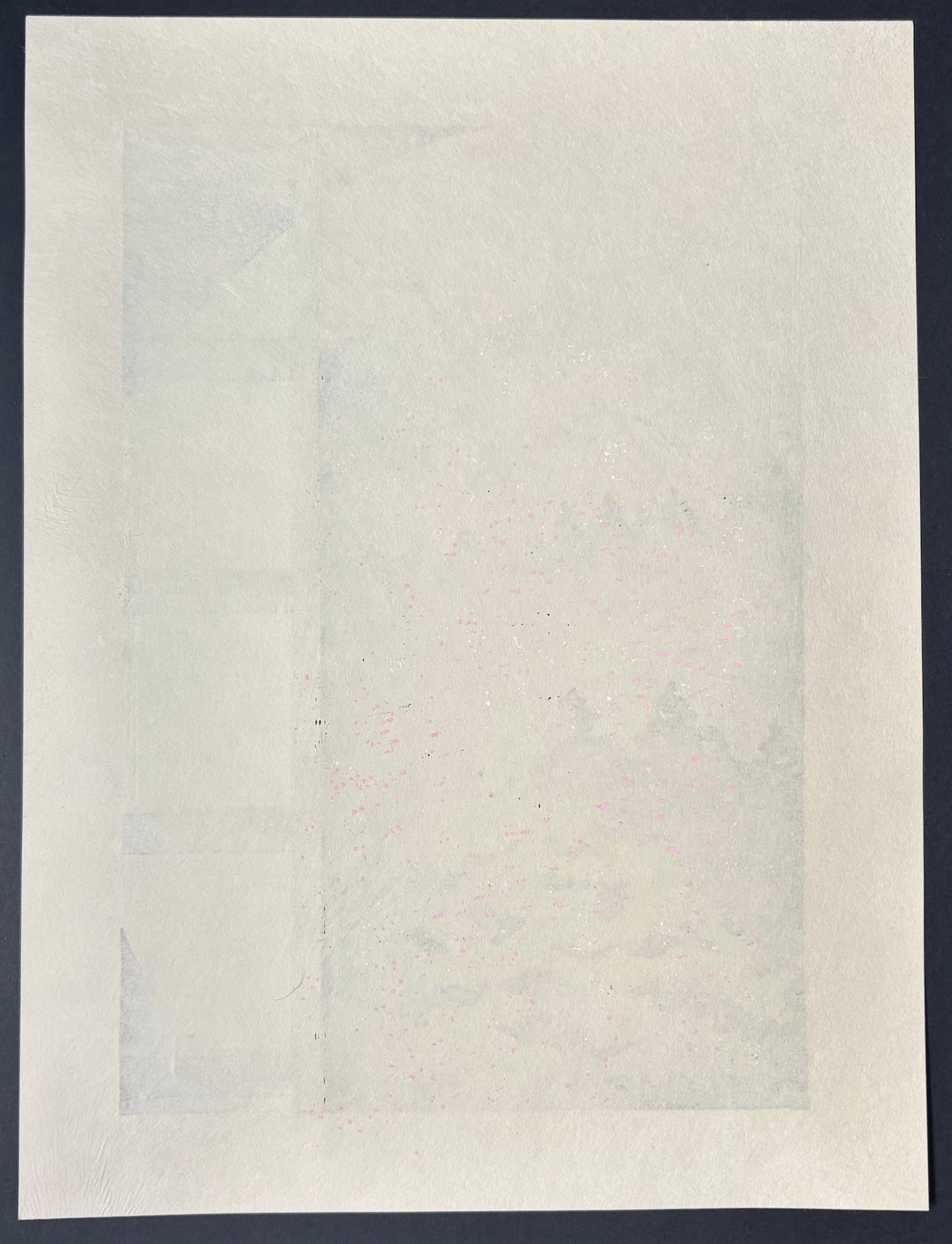 The breathtaking woodblock print 'Higashiyama Shunkei' (Spring Scenery of Higashiyama, Kyoto) is by Masao Ido (1945–2016). This stunning work captures the beauty of Higashiyama in spring, filled with blooming weeping cherry blossoms. The composition evokes the moment of opening a shoji screen window to reveal a magnificent view of blossoms set against the mountains beyond. The circular window, reflected as a soft silhouette on the shoji screen, adds a distinctive touch of Kyoto’s traditional elegance and quiet charm.