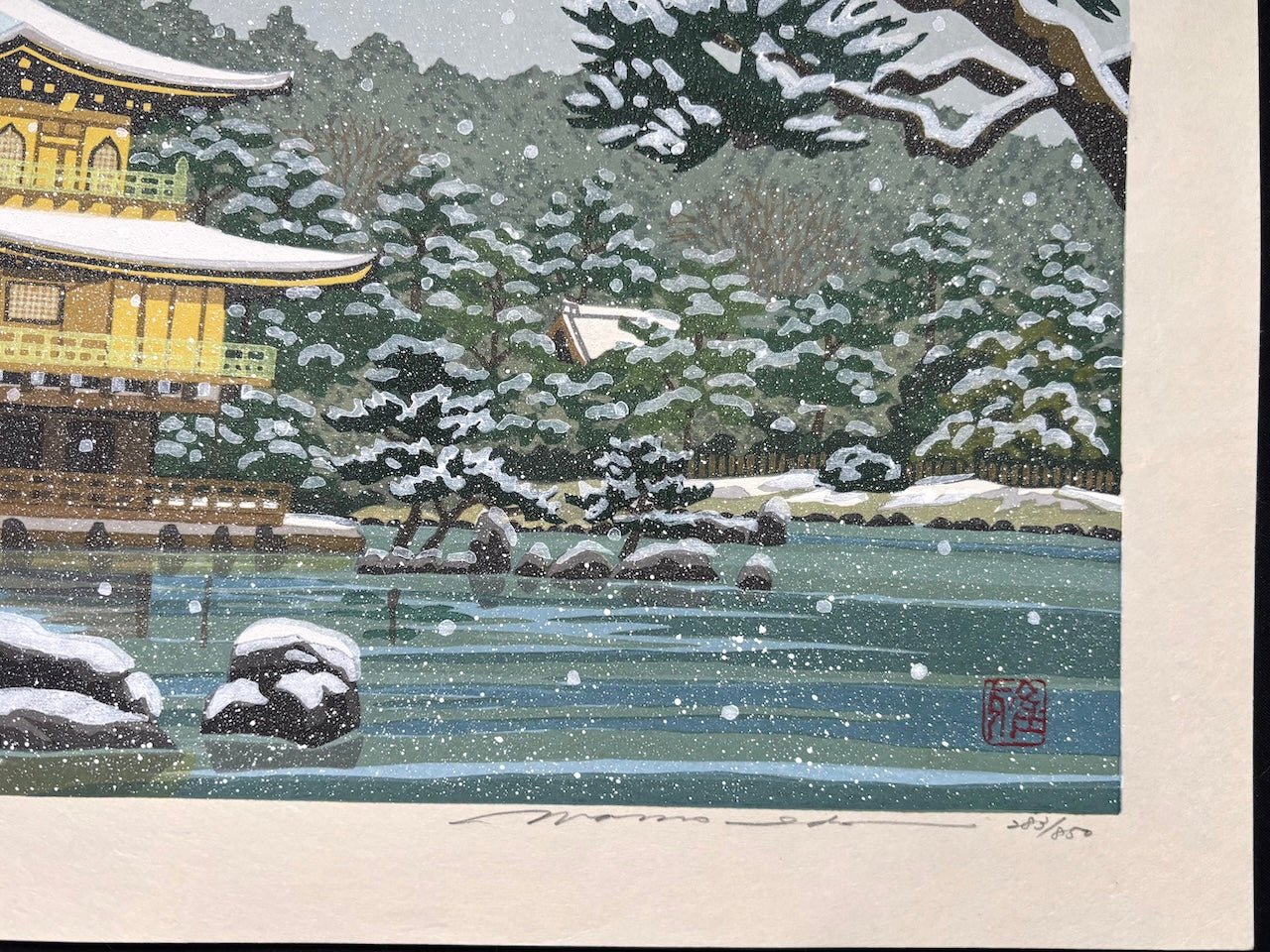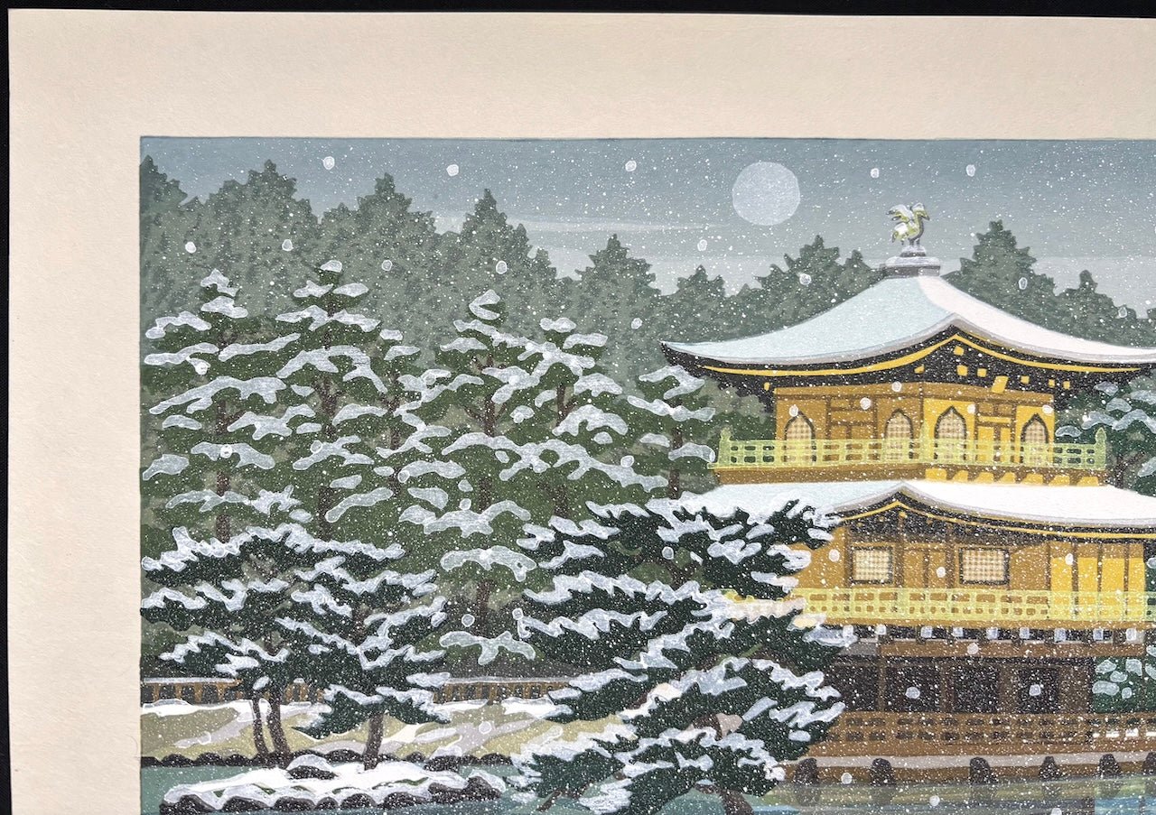 The breathtaking woodblock print “Kinkaku-ji no Fuyu” (Golden Pavilion in Winter, Kyoto) is by Masao Ido (1945–2016). This print beautifully captures a romantic winter scene of the Golden Pavilion, Kyoto’s iconic landmark, blanketed in snow and radiating serene beauty. The moon rising behind the pavilion enhances the snowy landscape, adding to its tranquil charm. The composition and details are truly exquisite.