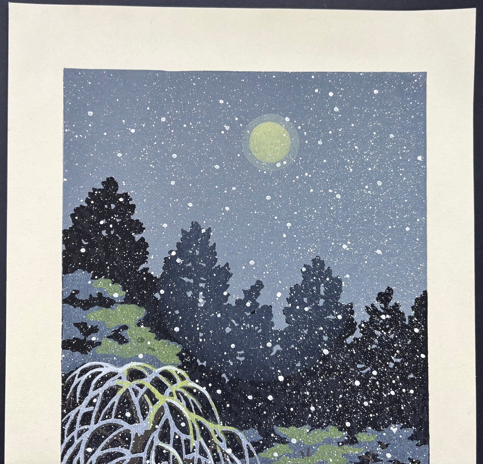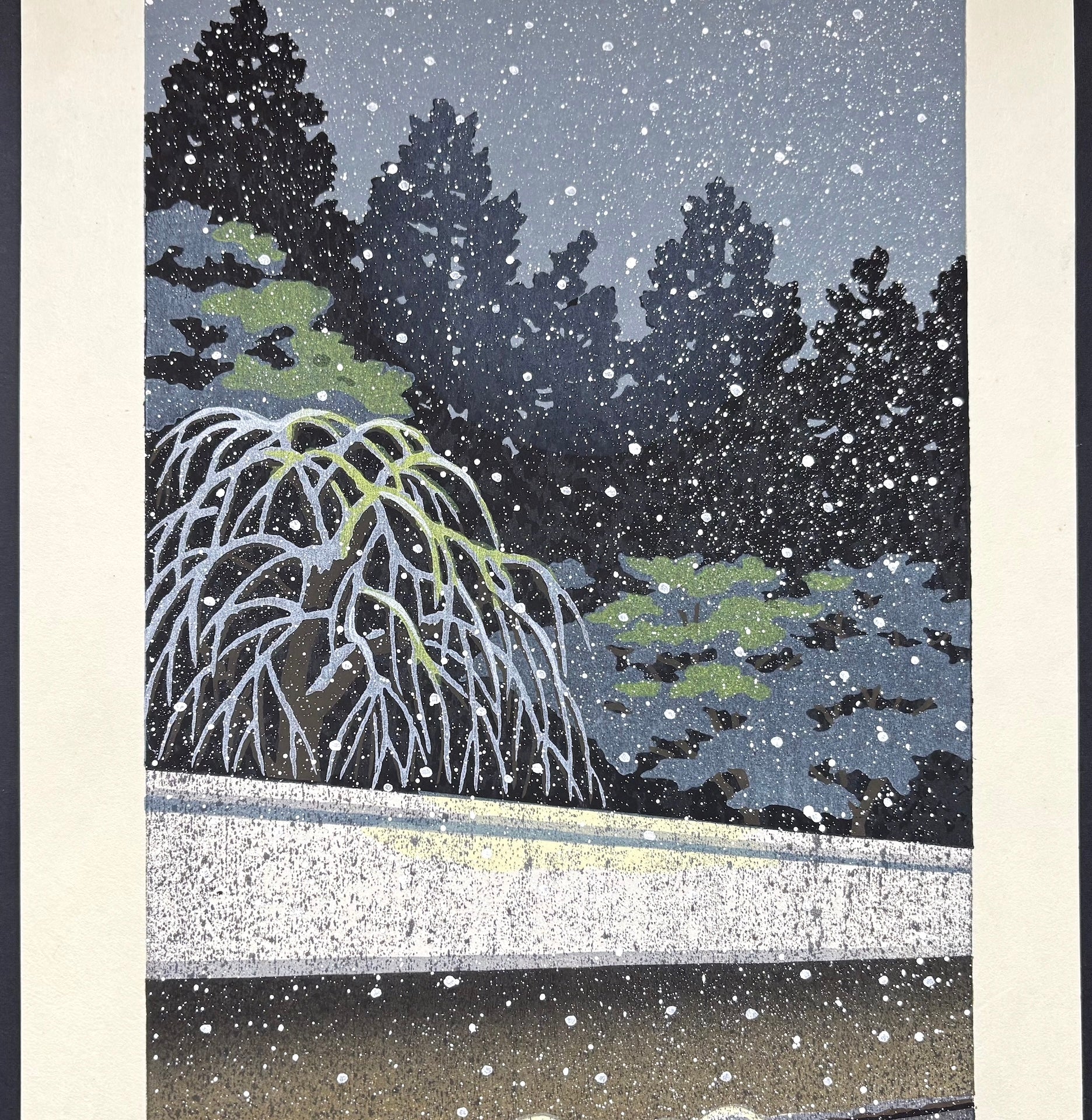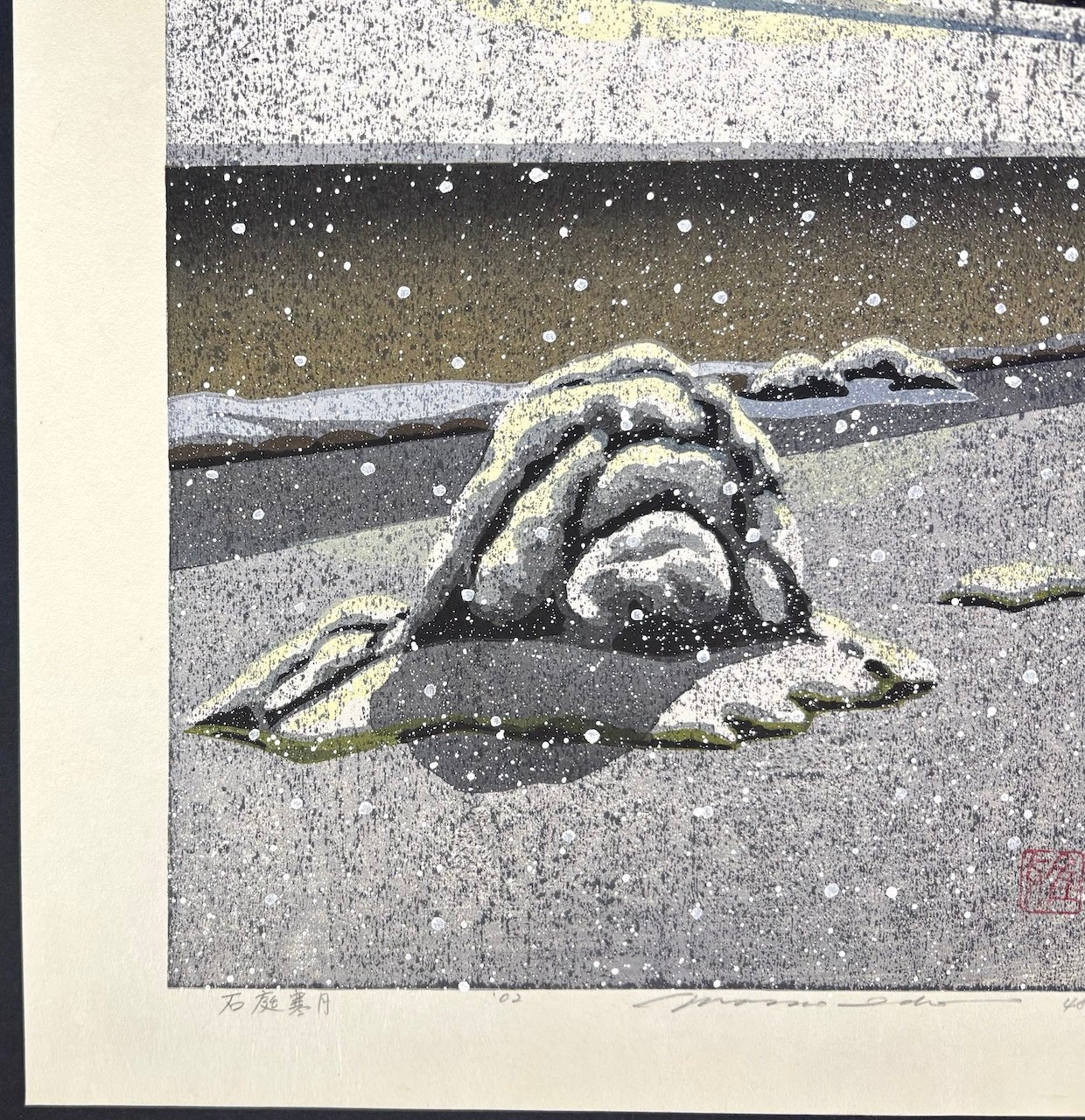 The stunning woodblock print 'Sekitei Kangetsu' (Stone Garden and Cold Moon) is by Masao Ido (1945–2016). This large, vertically oriented, breathtaking night scene depicts the stone garden of Ryōan-ji Temple in Kyoto, bathed in the pale light of a cold moon and gently blanketed in snow. Soft snowflakes fall quietly, filling the scene with profound stillness and a serene, contemplative atmosphere.