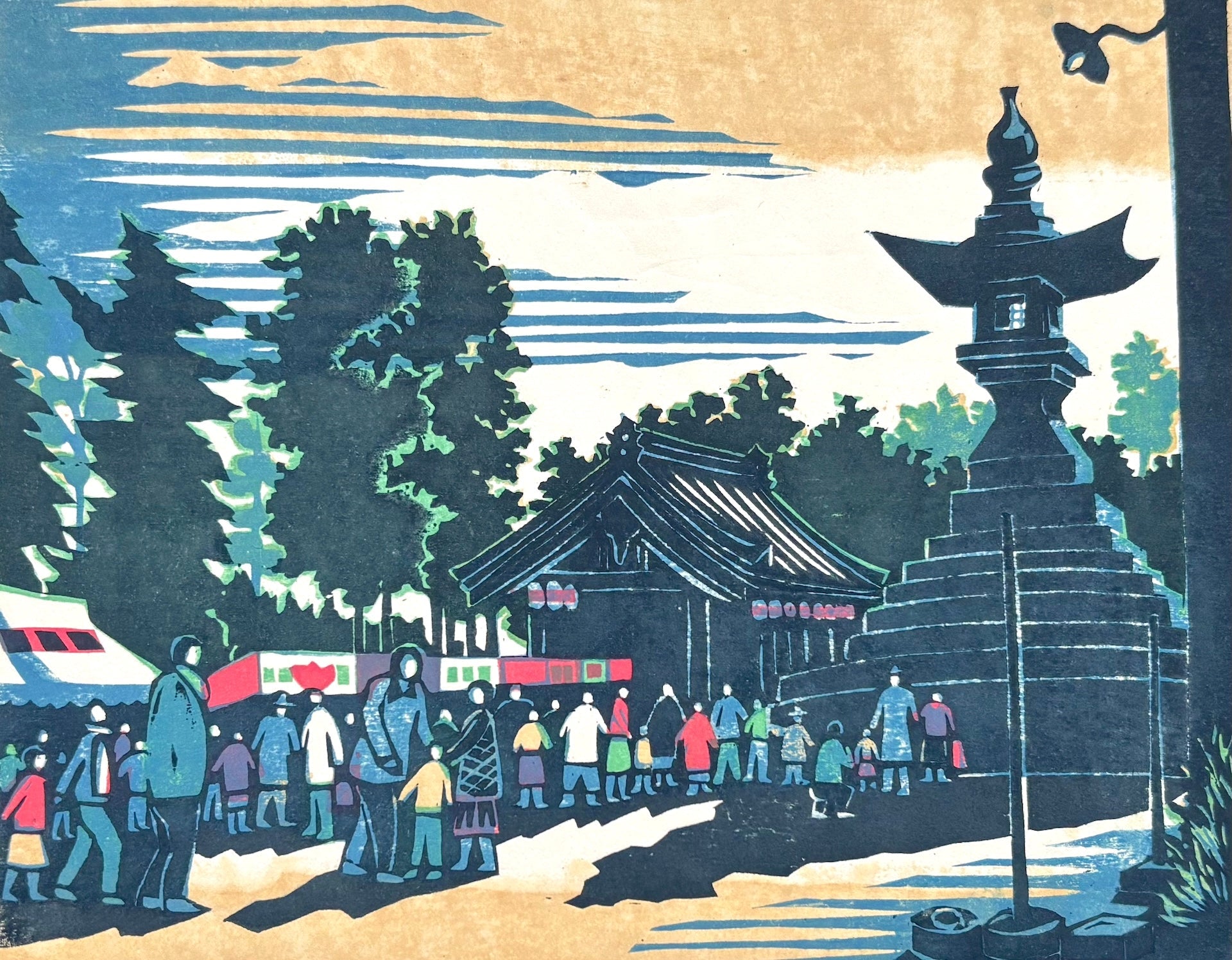 The beautiful small woodblock print ’Scenery of Kibitsuhiko Shrine, Okayama’ is by Osamu Ueda (b. 1947). Kibitsuhiko Shrine, located in Ichinomiya, Okayama Prefecture, is dedicated to Kibitsuhiko-no-Mikoto, who is believed to be the model for Momotarō, a beloved hero of Japanese folklore.