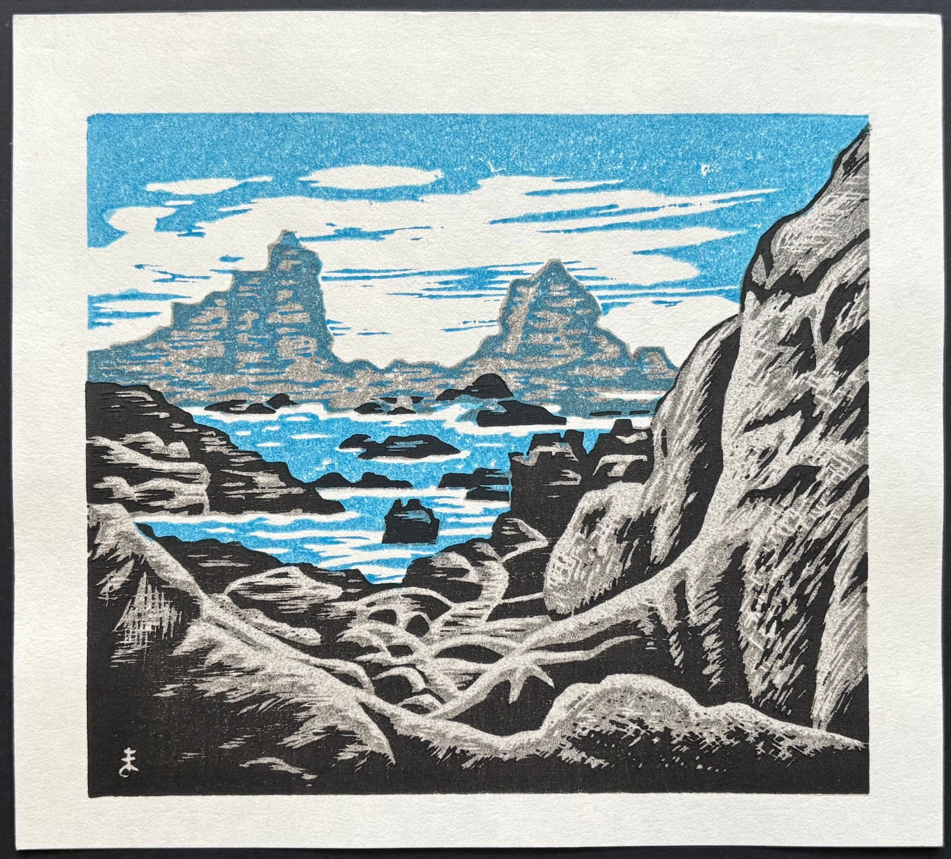 This small print depicts a midsummer seascape, where the vibrant blue sky and sea create a beautiful contrast with the rugged rocks.