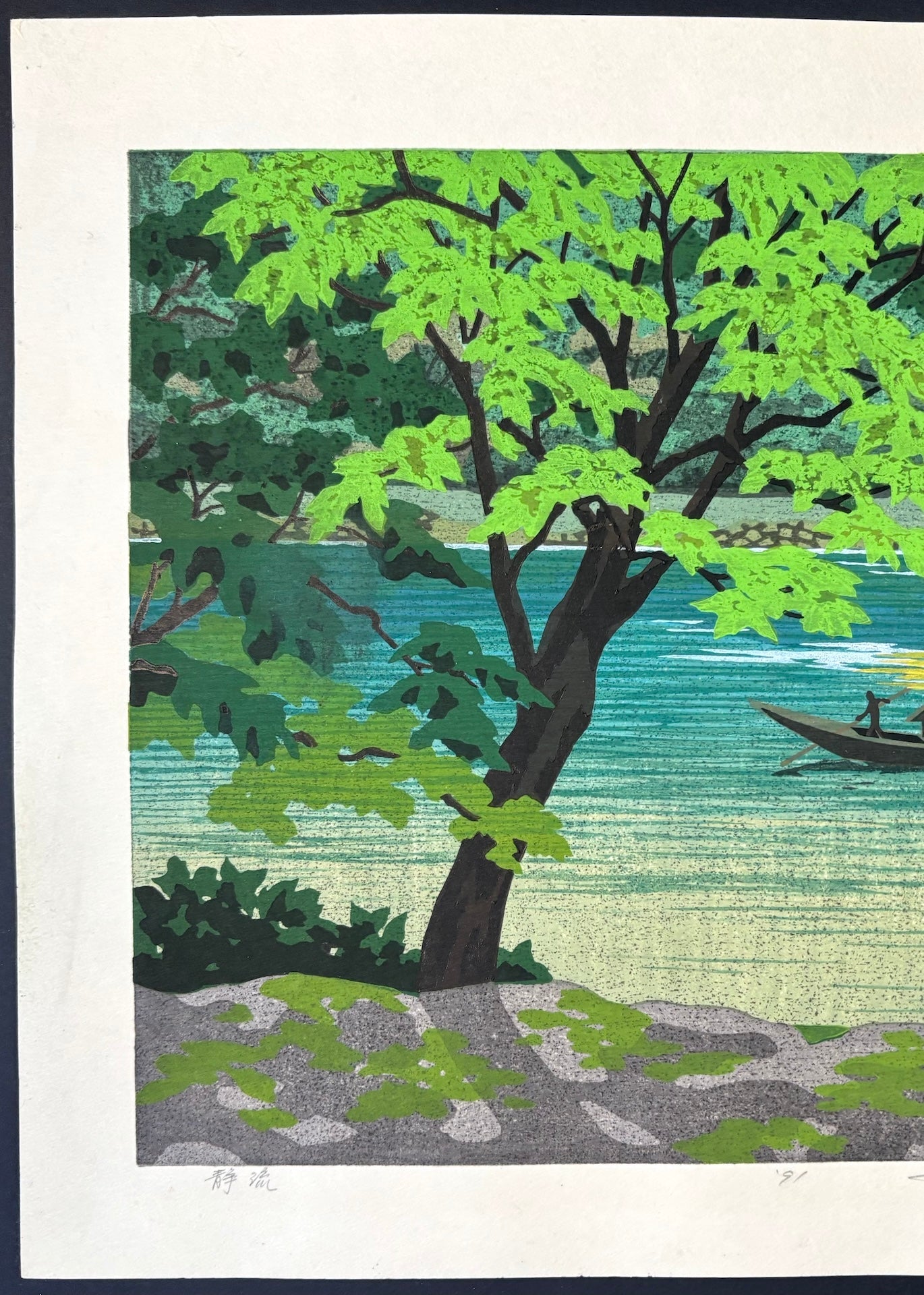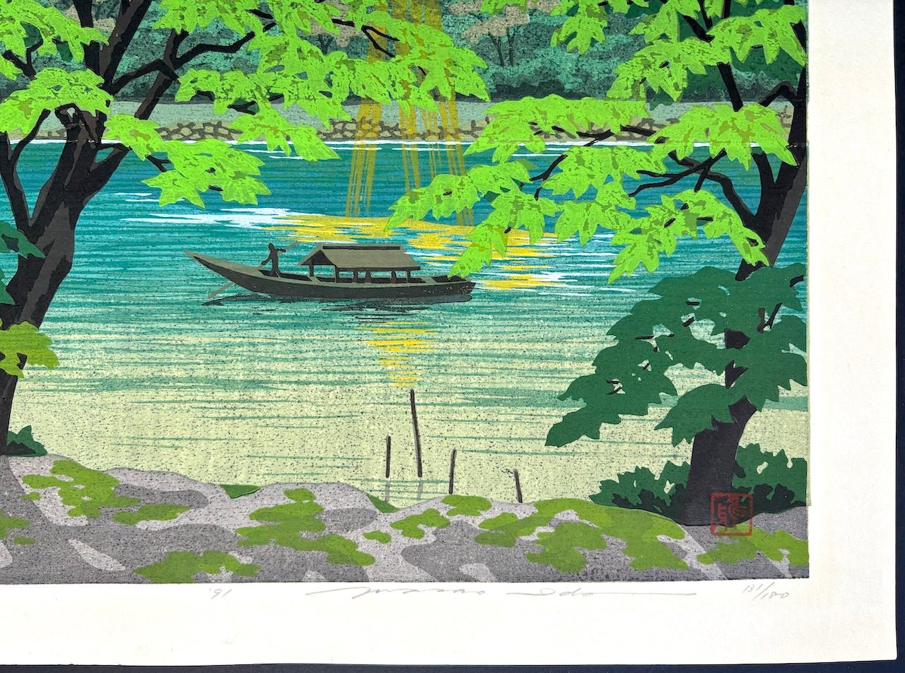 The serene woodblock print Seiryū (Clear Stream, Kyoto) by Masao Ido depicts a peaceful summer view of Arashiyama, Kyoto. The fresh greenery is beautifully expressed in gentle shades of green, and soft sunlight highlights a single drifting wooden boat, creating a calm and soothing atmosphere. The scene feels quiet, relaxing, and serene.