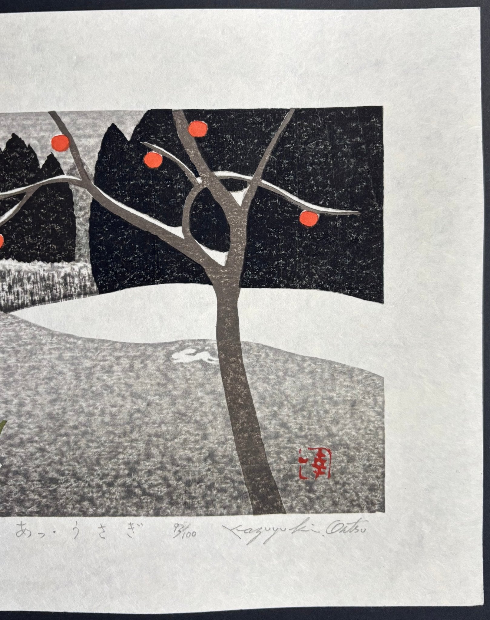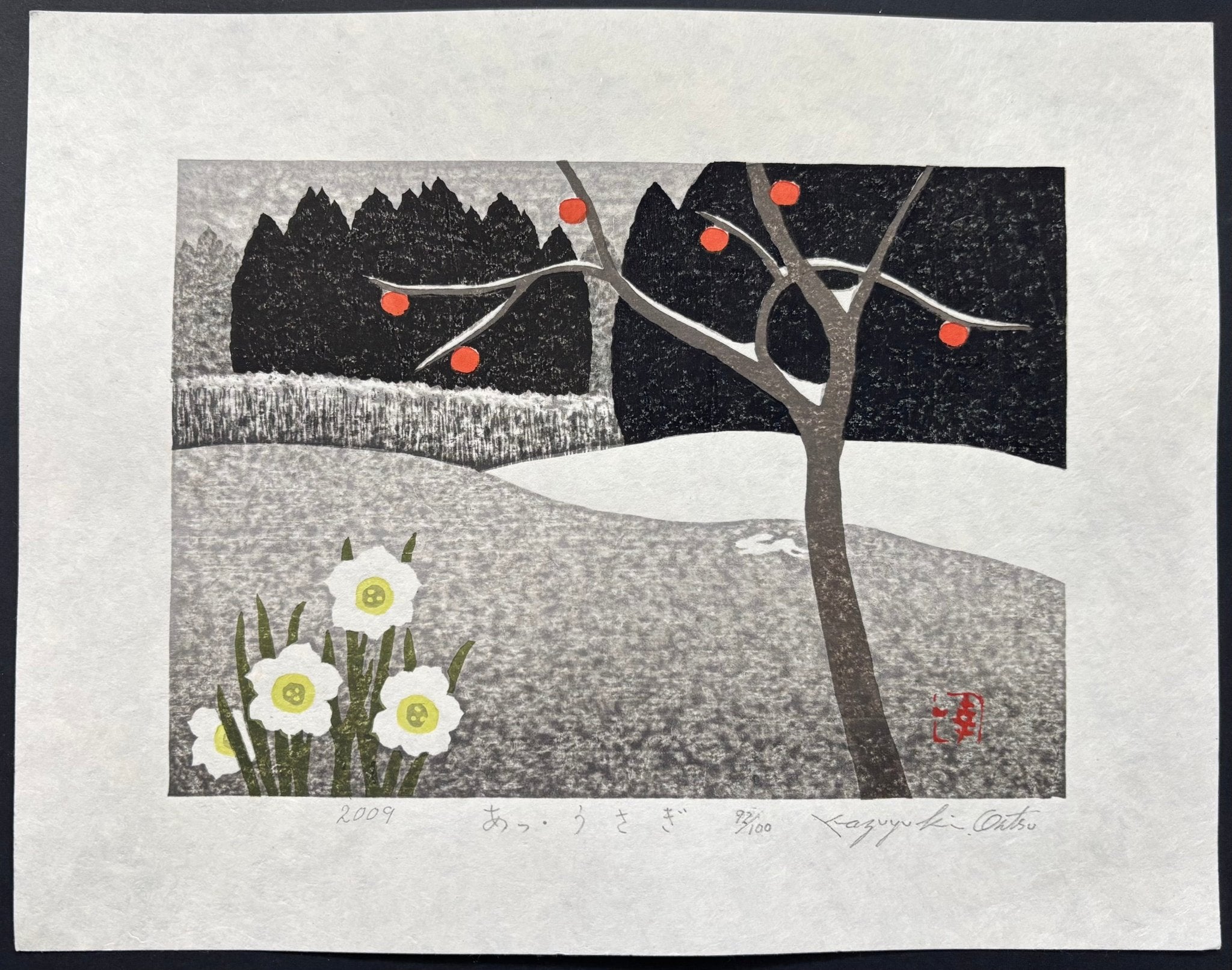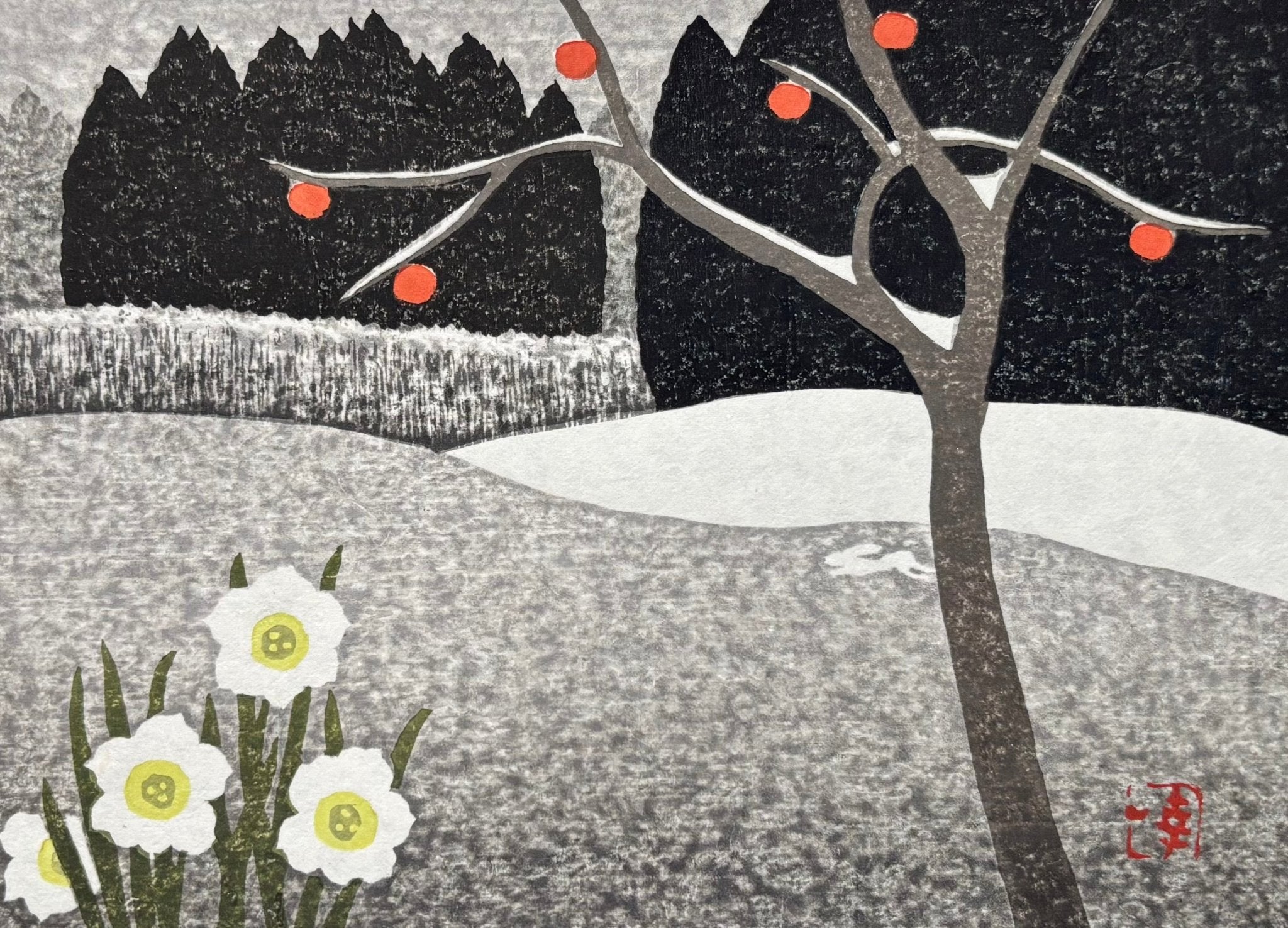 The charming woodblock print “A! Usagi” (Rabbit!) by Kazuyuki Ohtsu captures a fleeting, magical moment. This beloved piece quickly sold out after its release. It portrays the quiet hush of a snowy mountain village, just as a white rabbit unexpectedly dashes across the path—an enchanting encounter that stirs the heart. Soft daffodils and ripened persimmons add gentle bursts of color, enriching the serene beauty of this unforgettable scene.