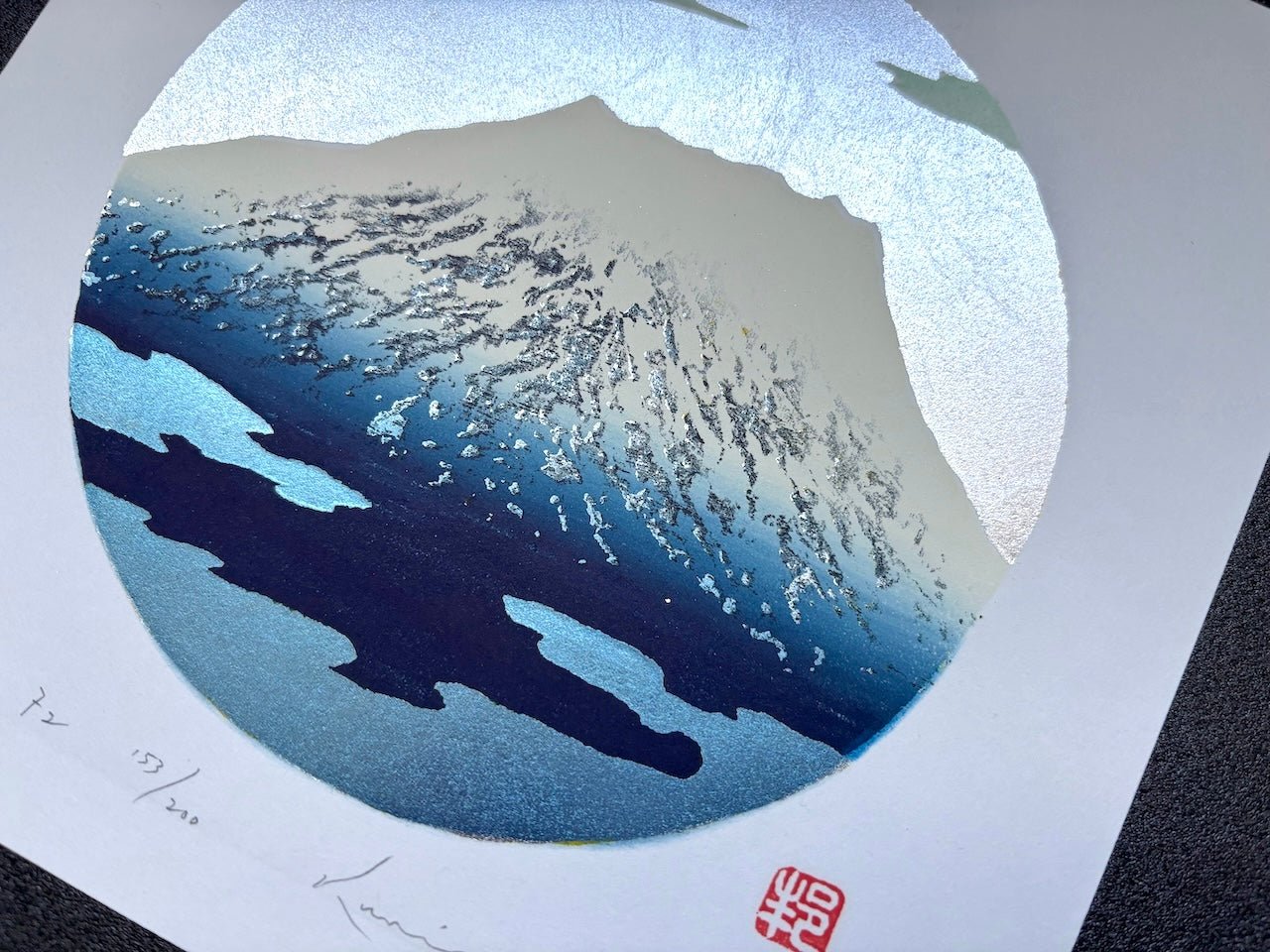 This exquisite woodblock print, “Fuji 72,” by Kunio Kaneko depicts Japan’s iconic Mount Fuji rendered in serene blue tones against a silver background. The artist’s use of soothing color harmonies evokes a tranquil and contemplative atmosphere.