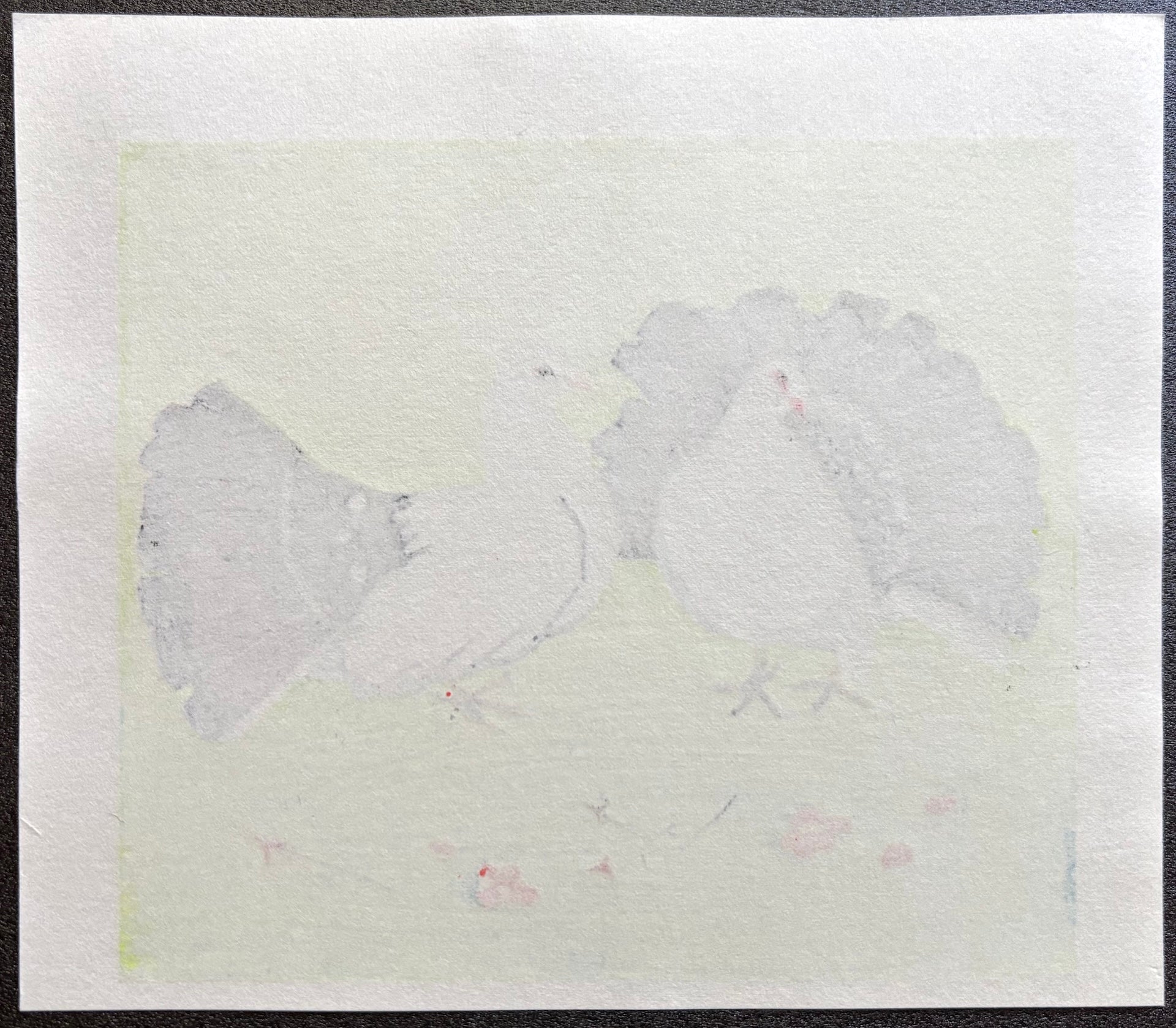 This small print depicts two white doves standing against a vibrant green background. Plum blossoms and pine needles, considered auspicious in Japan, blend seamlessly into the composition, adding to its beauty.