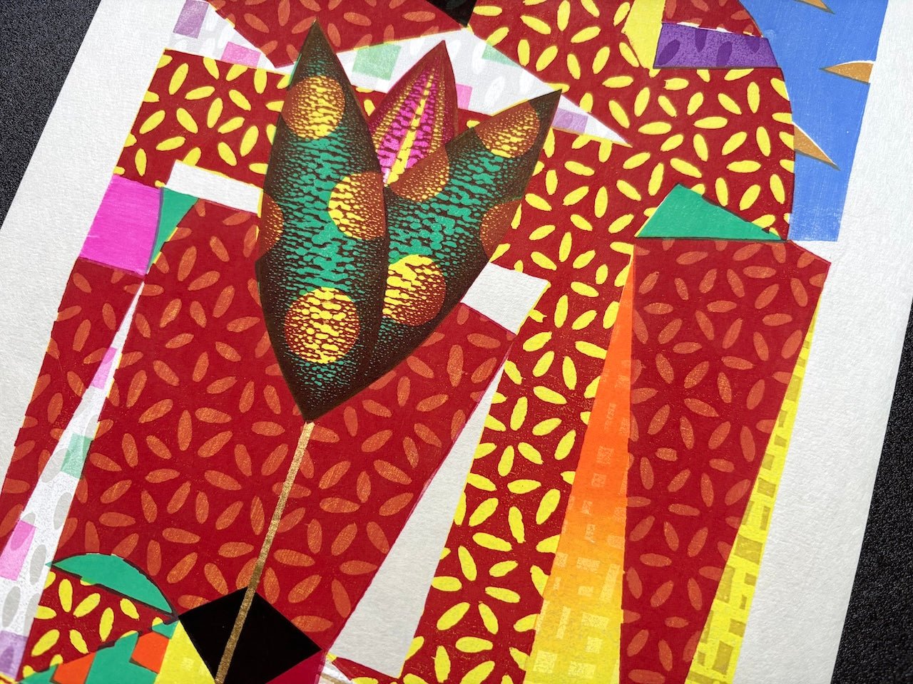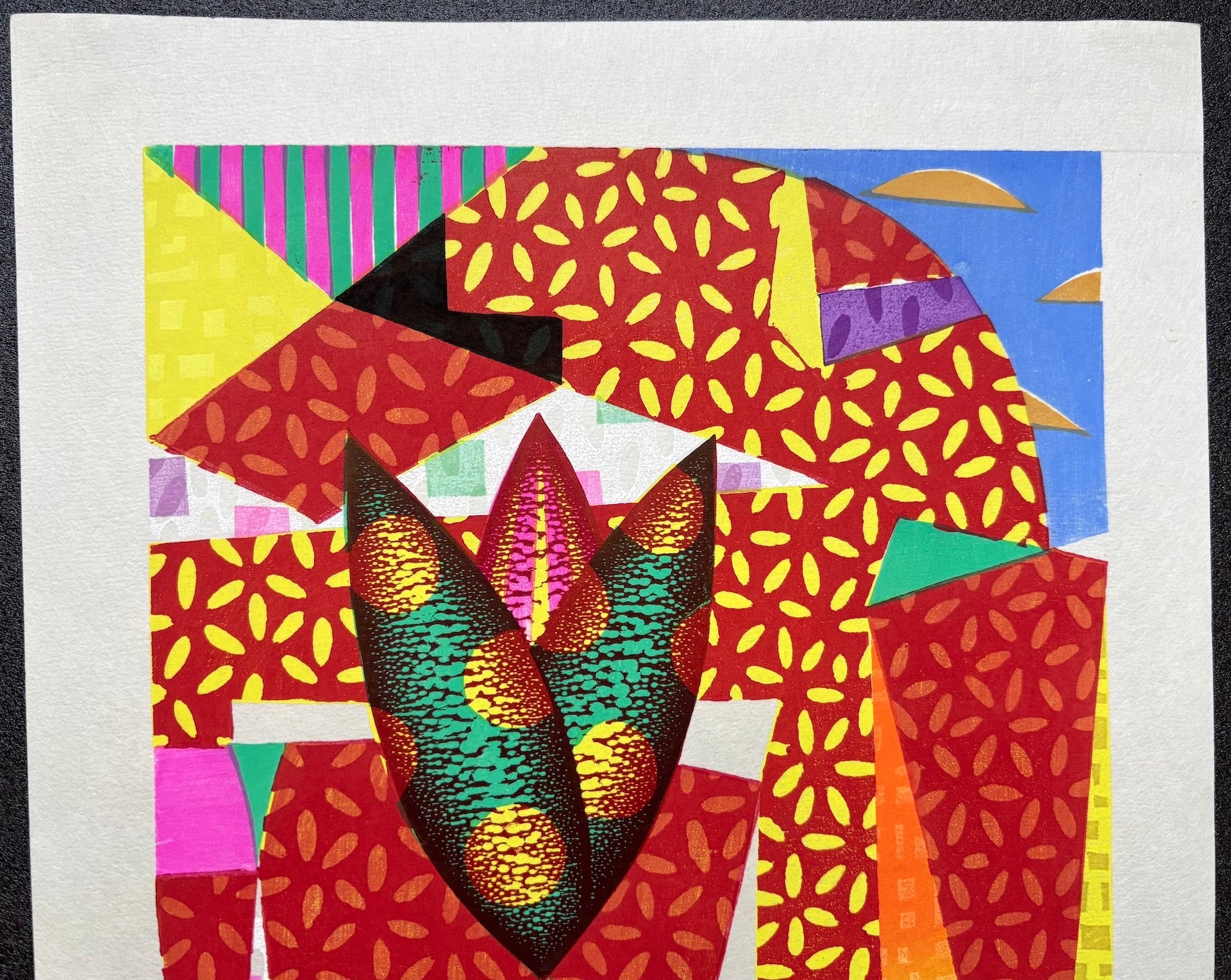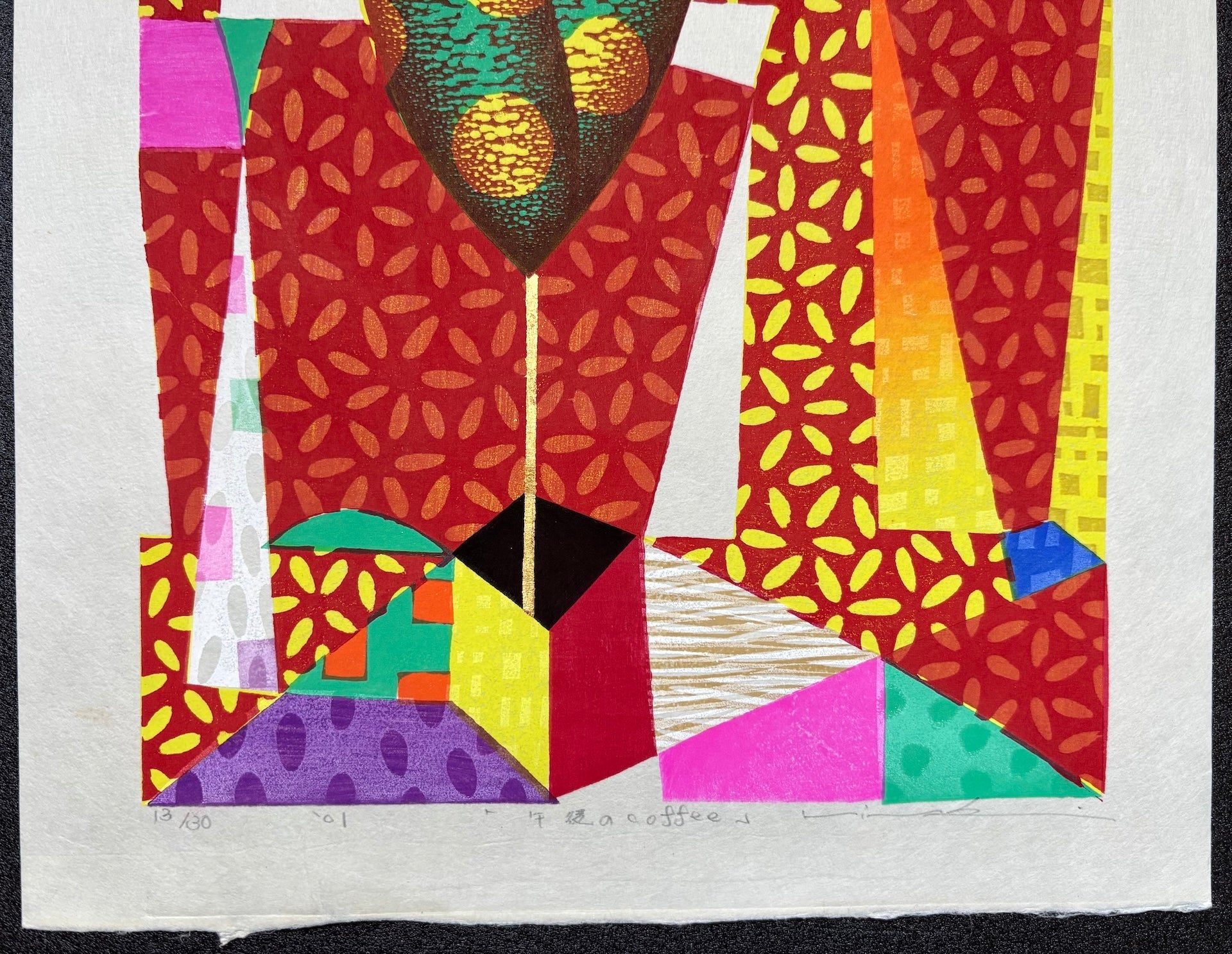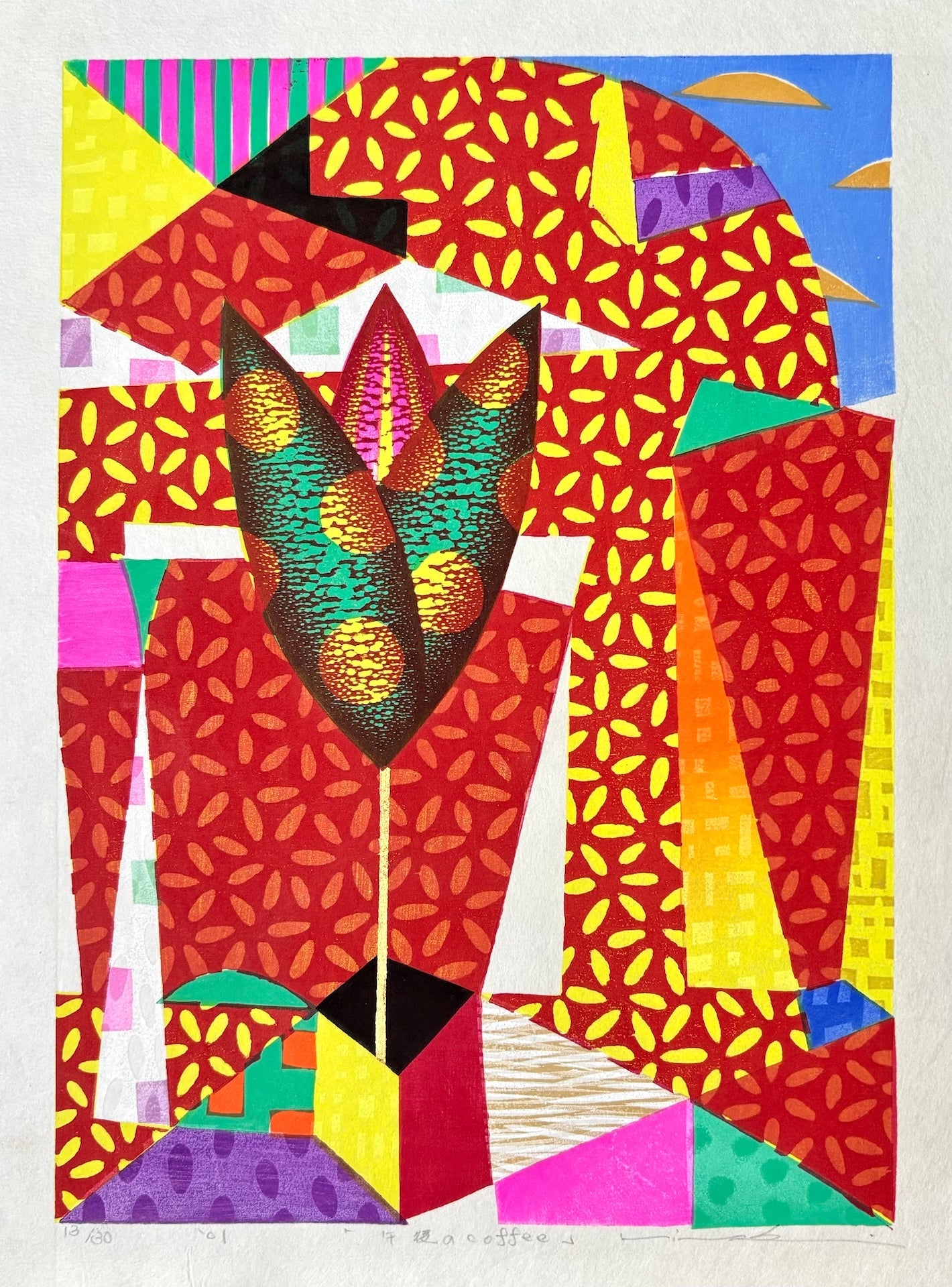 The vibrant woodblock print “Gogo no Coffee” (Afternoon Coffee) by Mitsuru Hiraki (b. 1958) features bold colors and a playful, puzzle-like design reminiscent of pop art. Its lively composition radiates energy, making it a striking piece that instantly captures attention and brightens any room. Limited edition of only 30 sheets.