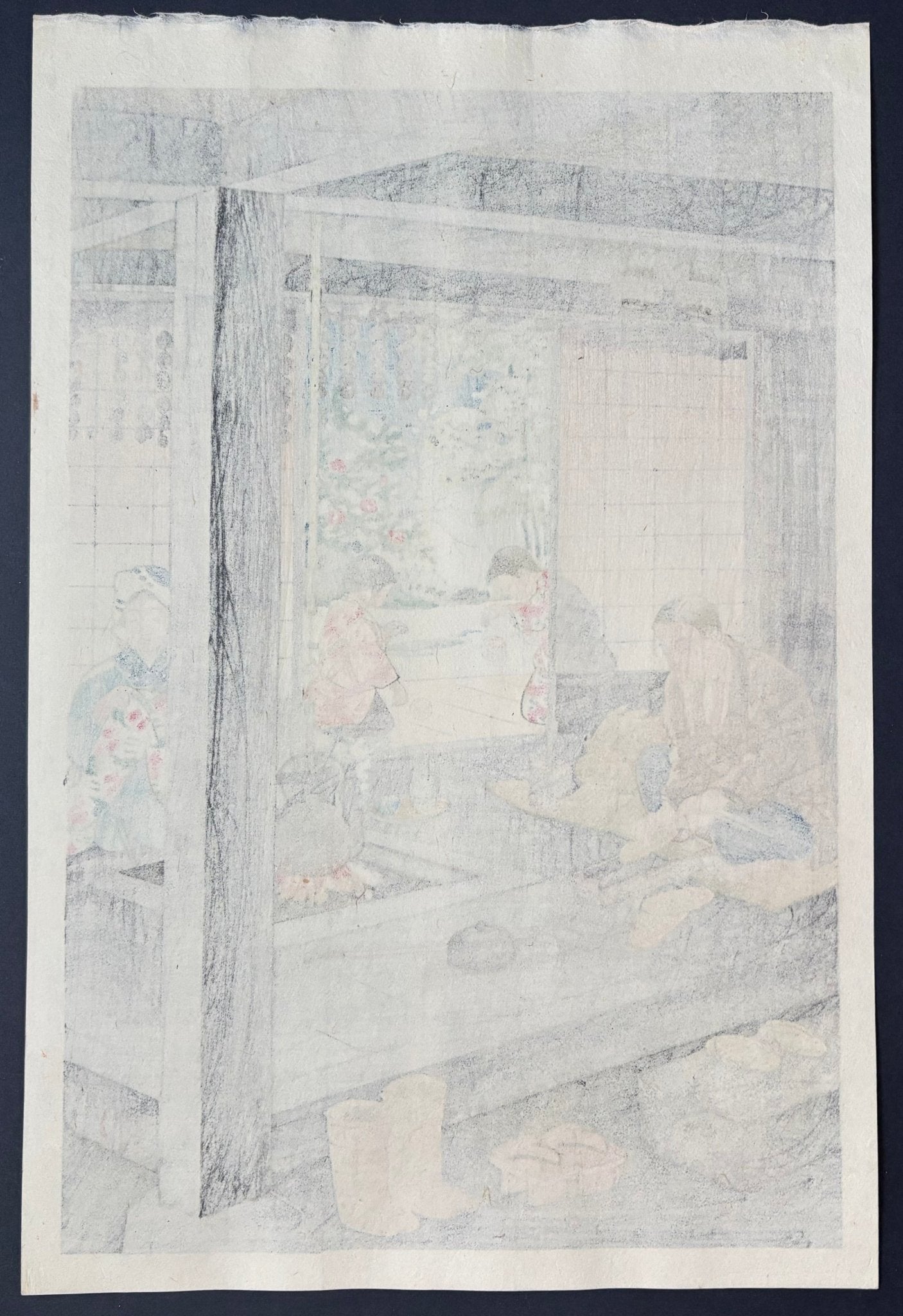 Published by Kyoto Hanga-in, the print bears the carver’s name, Kikuta, and the printer’s name, Nagae, along with the publisher’s seal in the lower right margin.