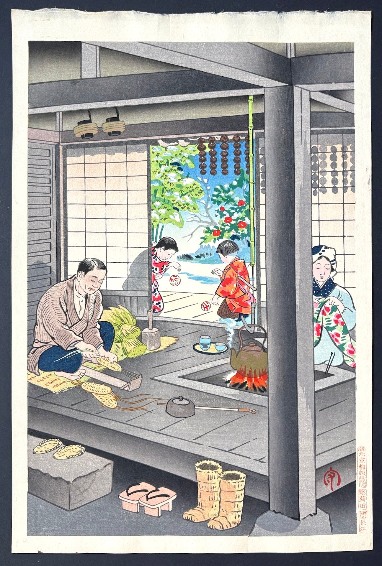 Inside the home, the father is making straw sandals while the mother sews beside the irori, a traditional sunken hearth. Nearby, the children play mari asobi, a classic girls’ ball game, creating a lively yet intimate family atmosphere. Beyond the shōji doors, strings of persimmons hang to dry, adding a seasonal touch and evoking everyday life in old Japan. This charming scene beautifully reflects the simplicity and warmth of traditional Japanese family life.