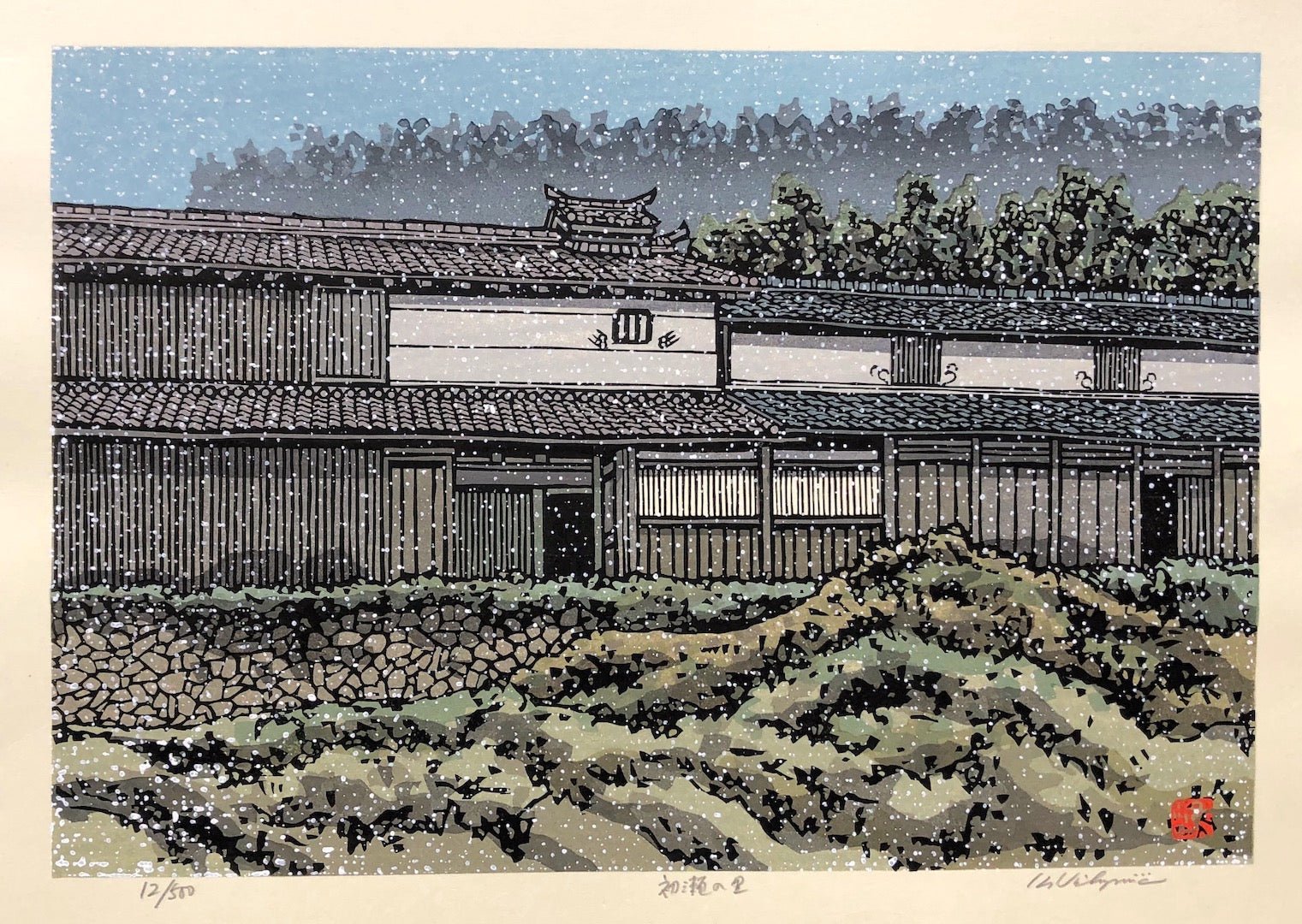 The very romantic snow print "Hase no Sato" (Snow at Hase Village, Nara) is by Katsuyuki Nishijima. This beautiful snow print brings a very peaceful atmosphere.
