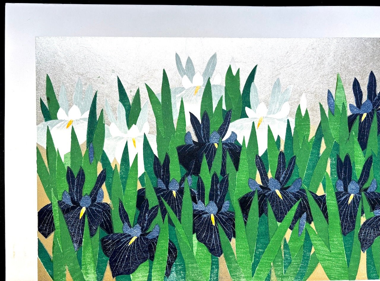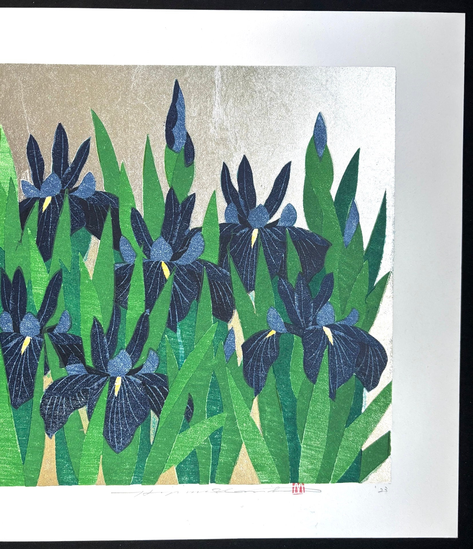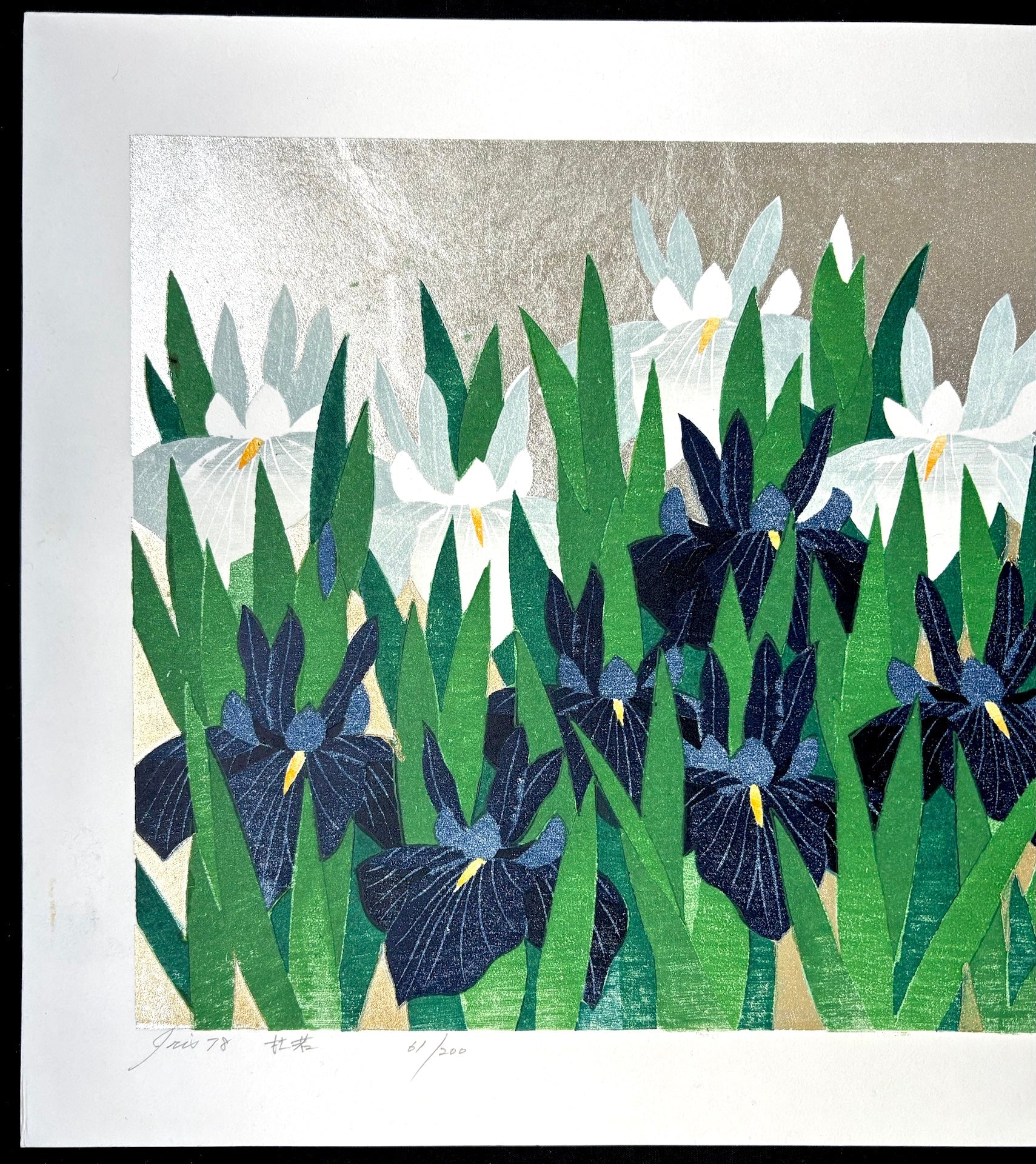 The striking large print 'Iris 78, Kakitsubata' by Hajime Namiki beautifully captures the elegance of the iconic iris flower, known in Japanese as Kakitsubata. Set against a shimmering silver background, the blossoms radiate with vibrant color and graceful form, hallmarks of Namiki’s style. The work feels both bold and serene, inviting the viewer to linger on its beauty.