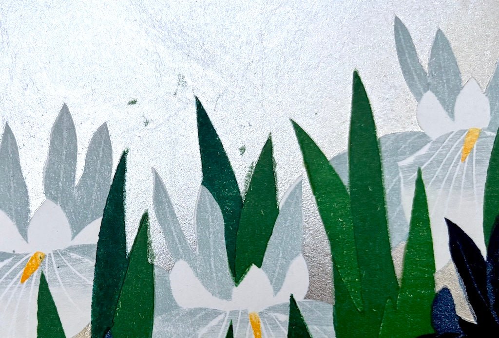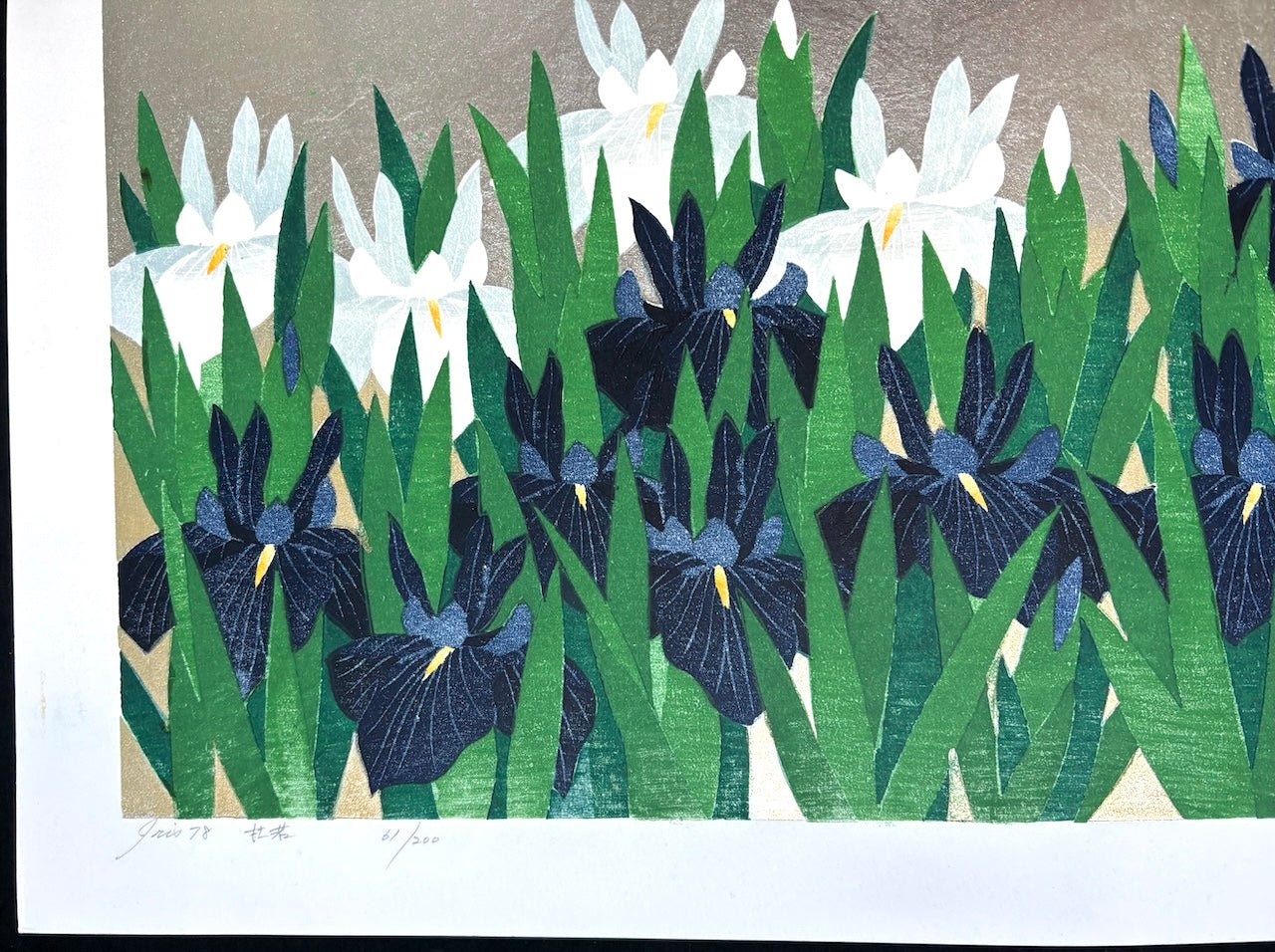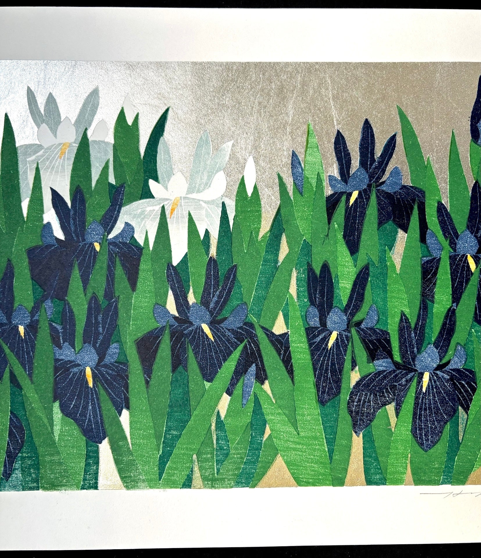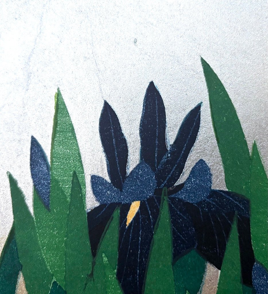 The striking large print 'Iris 78, Kakitsubata' by Hajime Namiki beautifully captures the elegance of the iconic iris flower, known in Japanese as Kakitsubata. Set against a shimmering silver background, the blossoms radiate with vibrant color and graceful form, hallmarks of Namiki’s style. The work feels both bold and serene, inviting the viewer to linger on its beauty.