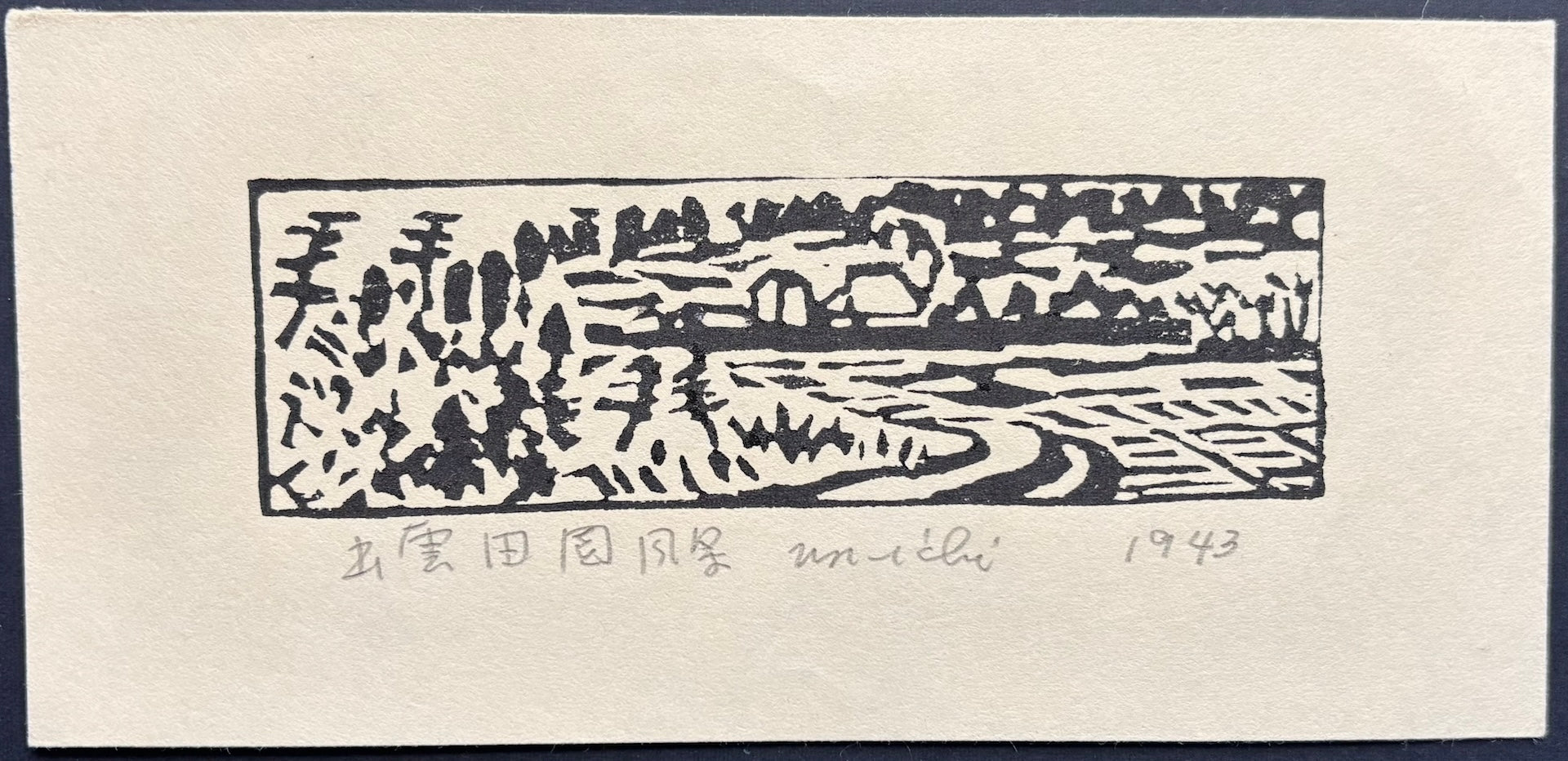 The small, horizontal woodblock print “Izumo Denen Fukei” (Izumo Rice Field Landscape) is by Unichi Hiratsuka (1895–1997). This print depicts a tranquil rural landscape in Izumo, Shimane Prefecture. The expansive rice fields, rendered in a panoramic view despite the print’s small size, create a beautiful composition. The print is hand-signed, titled, and dated in pencil along the bottom margin, as shown.