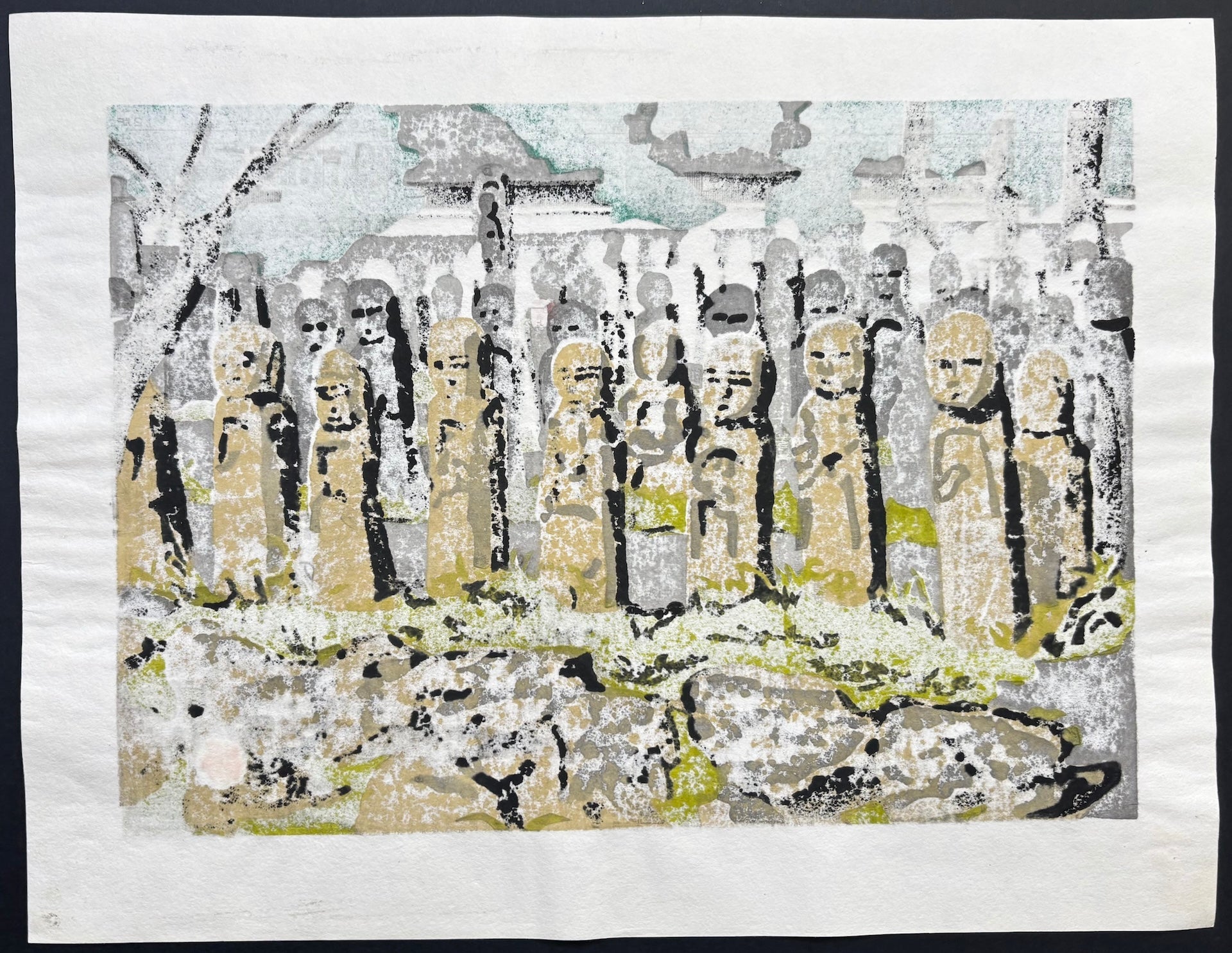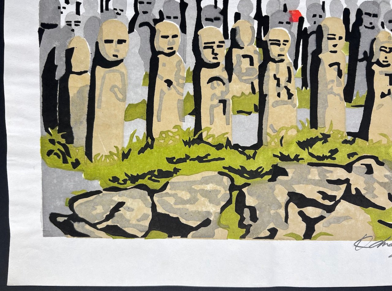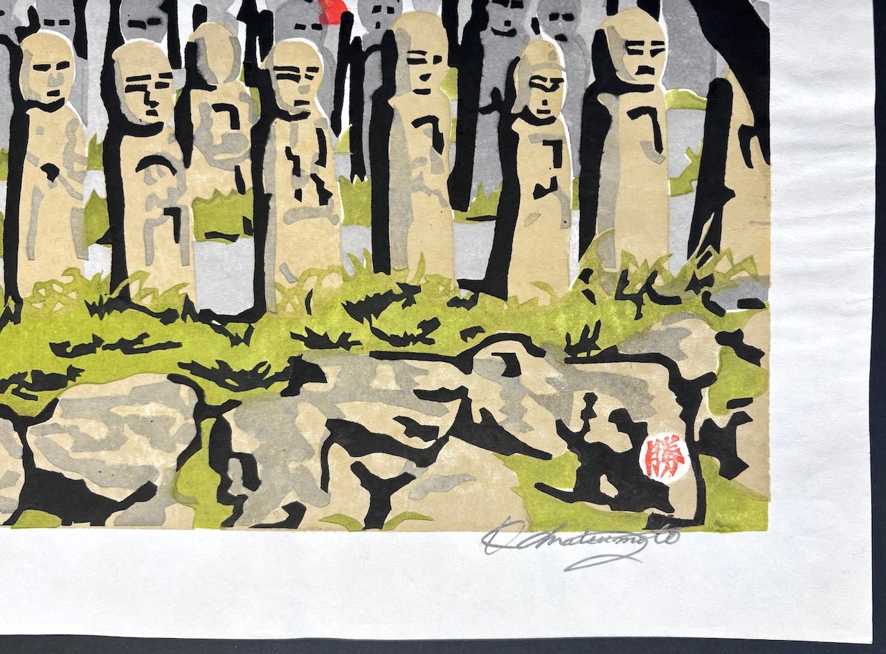 The serene woodblock print 'Jizo Statues Scenery' is by Katsu Matsumoto. This print depicts a corner of a temple where numerous Jizo statues are lined up, creating a tranquil and contemplative atmosphere. The artist’s red seal, “Katsu,” appears in the lower right corner of the image, and the work is hand-signed “K. Matsumoto” on the bottom margin.