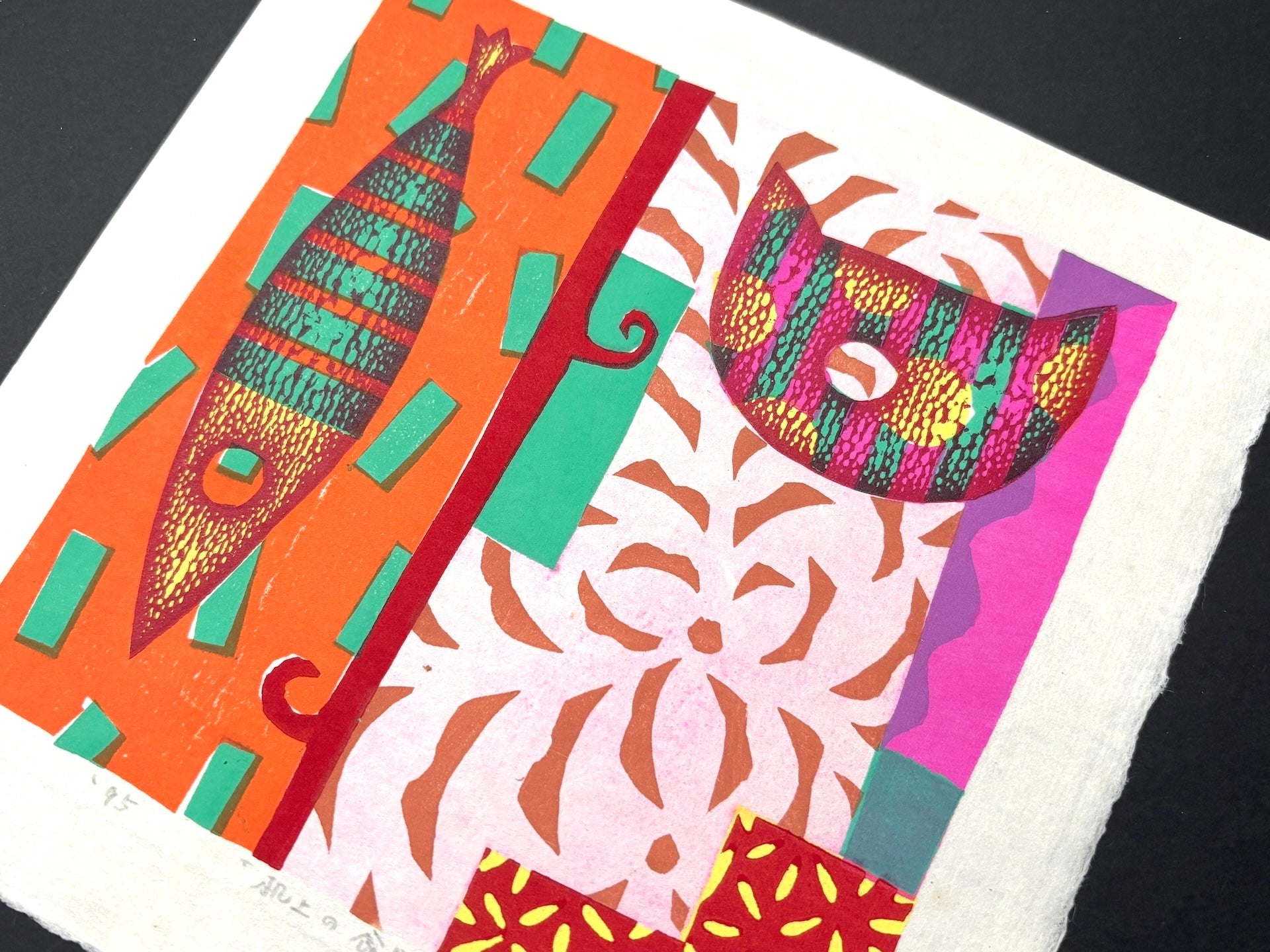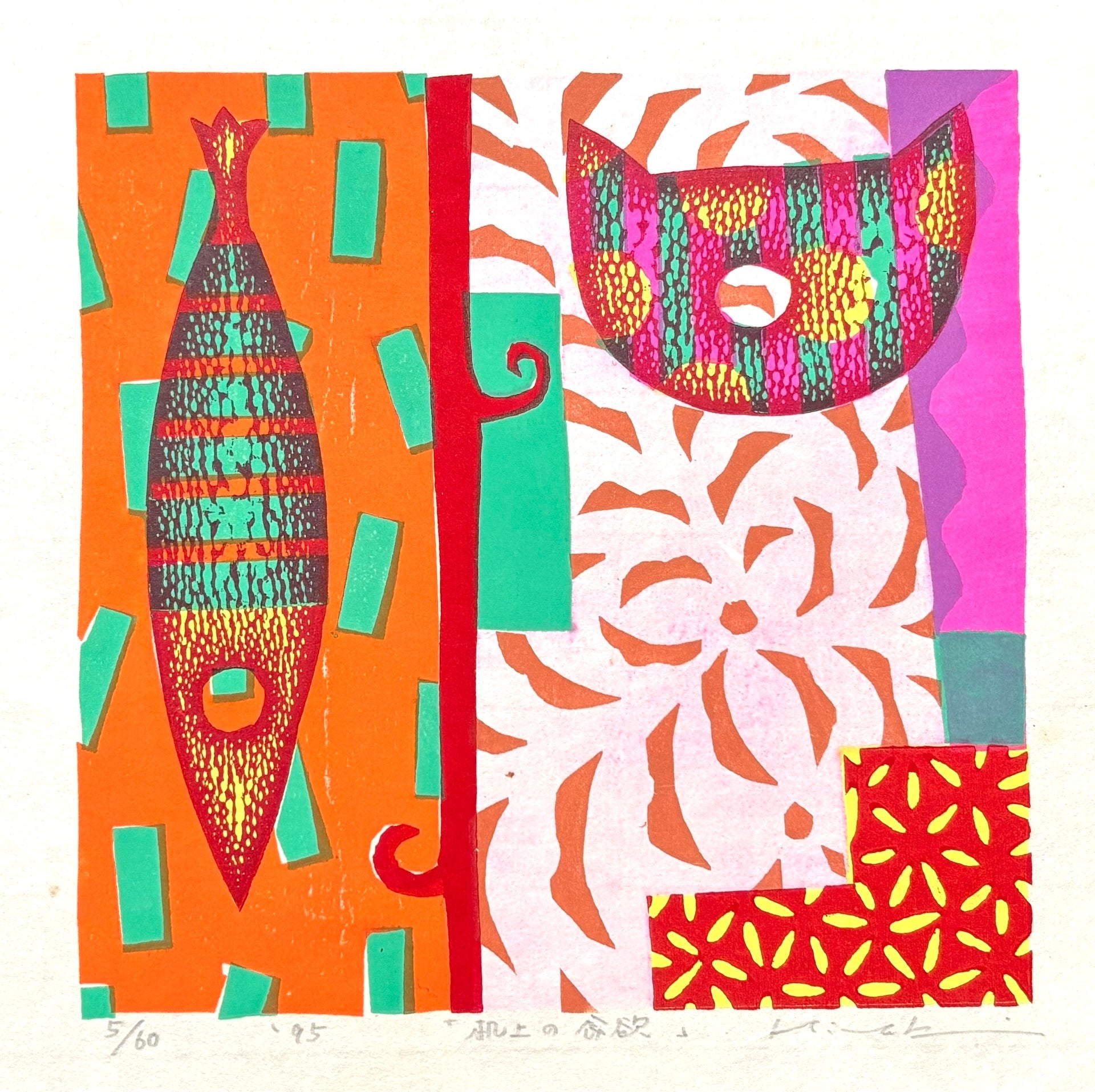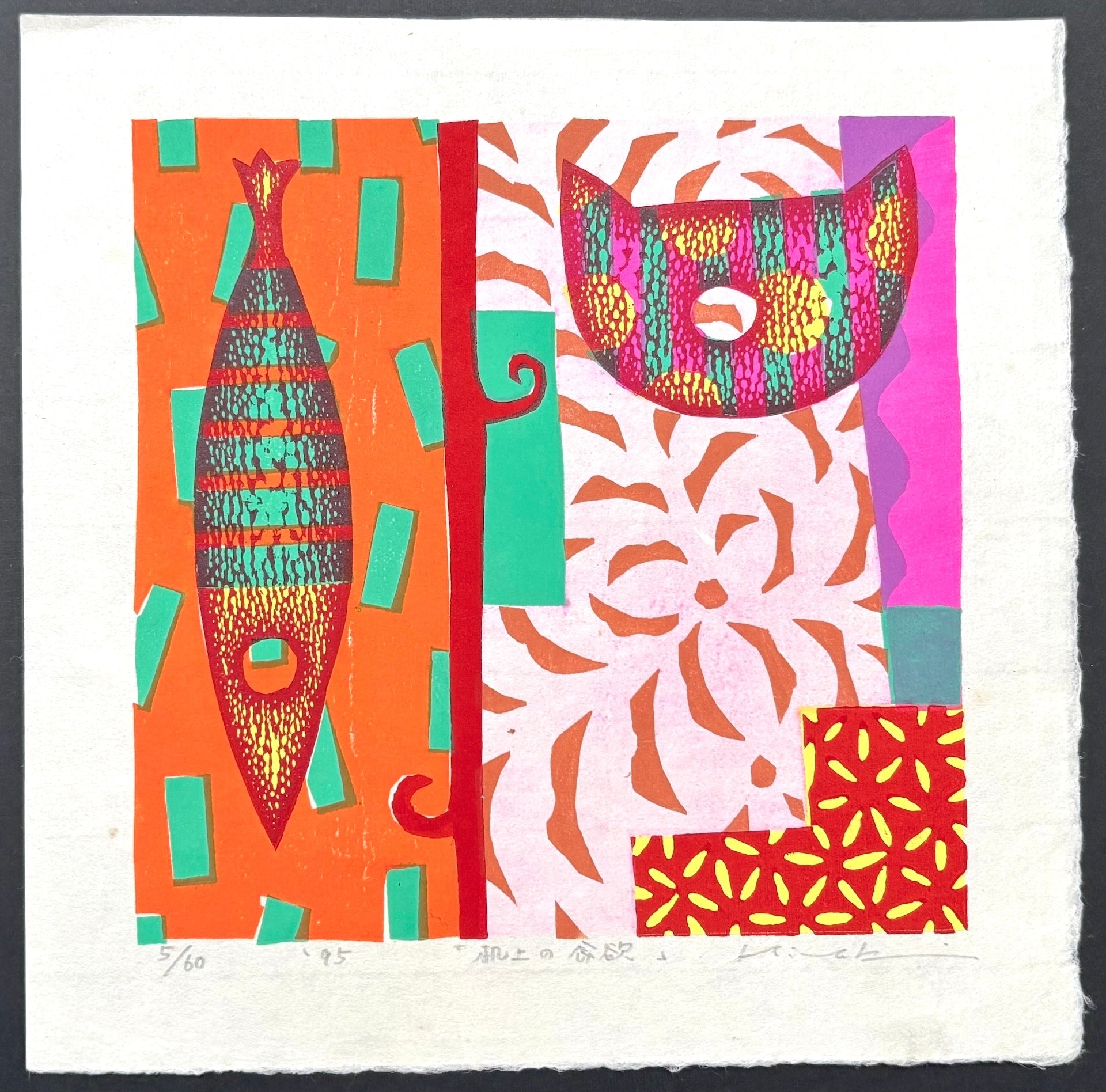 The charming woodblock print “Kijō no Shokuyoku” (Appetite at the Desk) is by Mitsuru Hiraki (b. 1958). Works from this period of the artist’s career belong to a series that focuses on houses and their surroundings, exploring small discoveries and quiet surprises found in everyday life. Hiraki’s ability to transform familiar scenes into something uniquely magical is truly captivating. With its pop-inspired design and vibrant colors, this print would make a delightful and distinctive accent for any room.