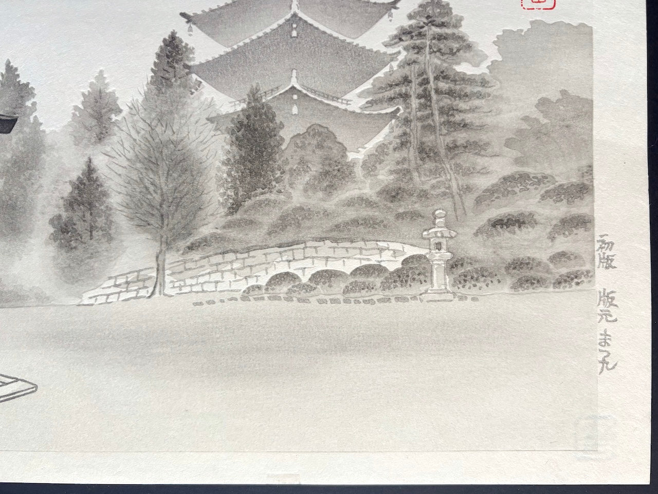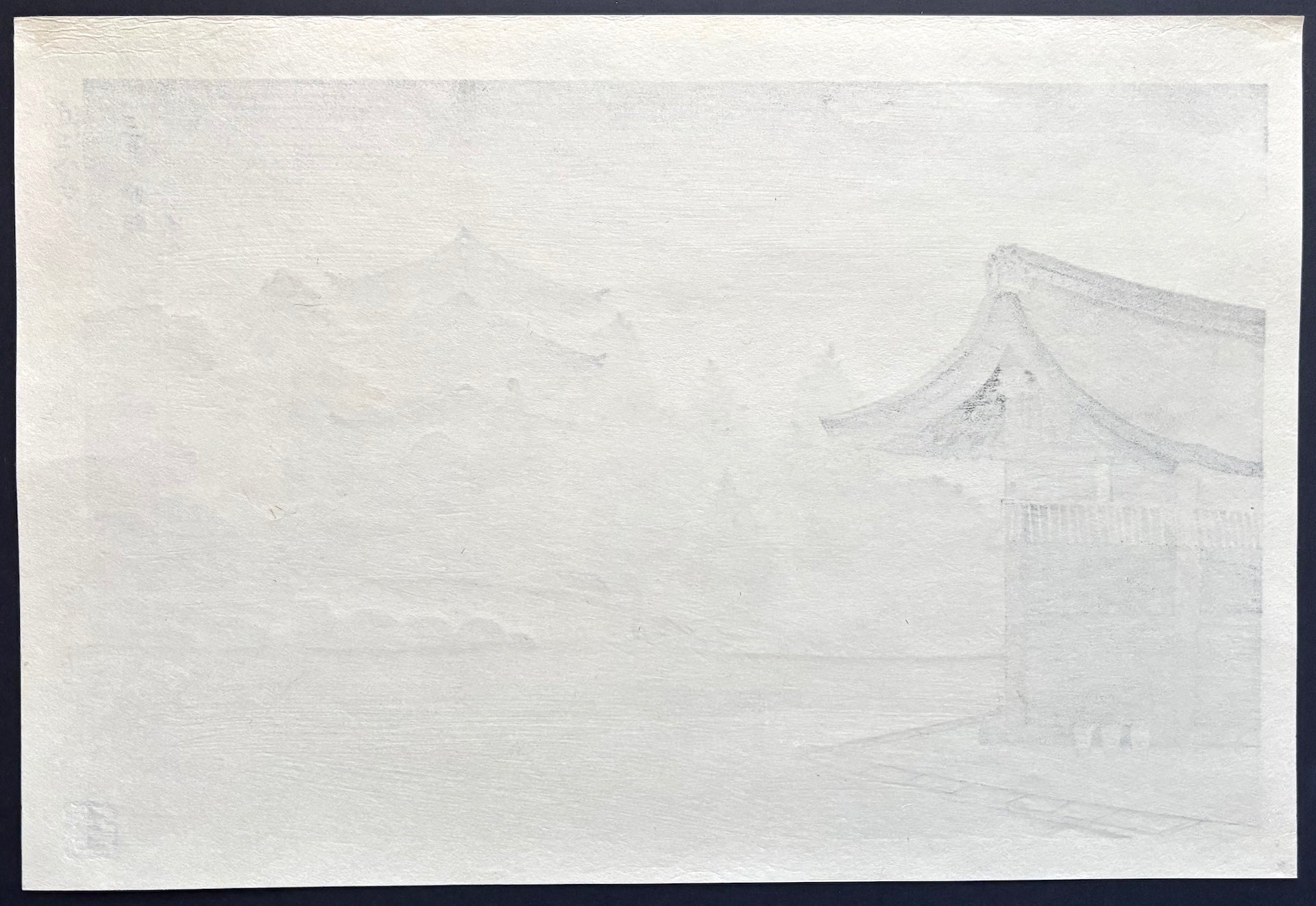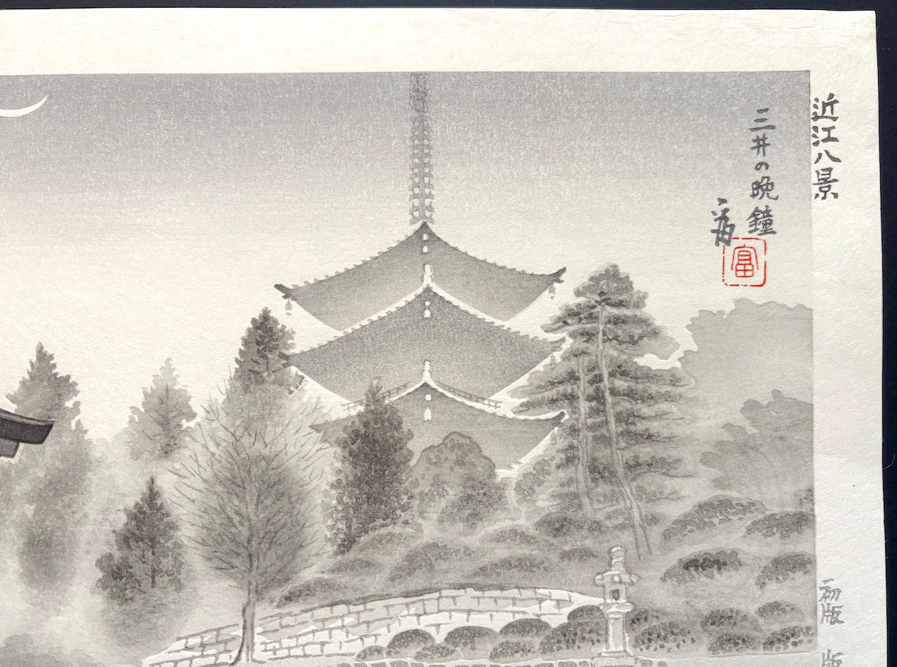 The serene woodblock print “Mii no Banshō” (Evening Bell of Mii-dera Temple), from Tokuriki’s rare and highly regarded series “Ōmi Hakkei” (Eight Views of Ōmi Province), is by Tomikichiro Tokuriki (1902–2000). This is a hand-signed, limited-edition print.