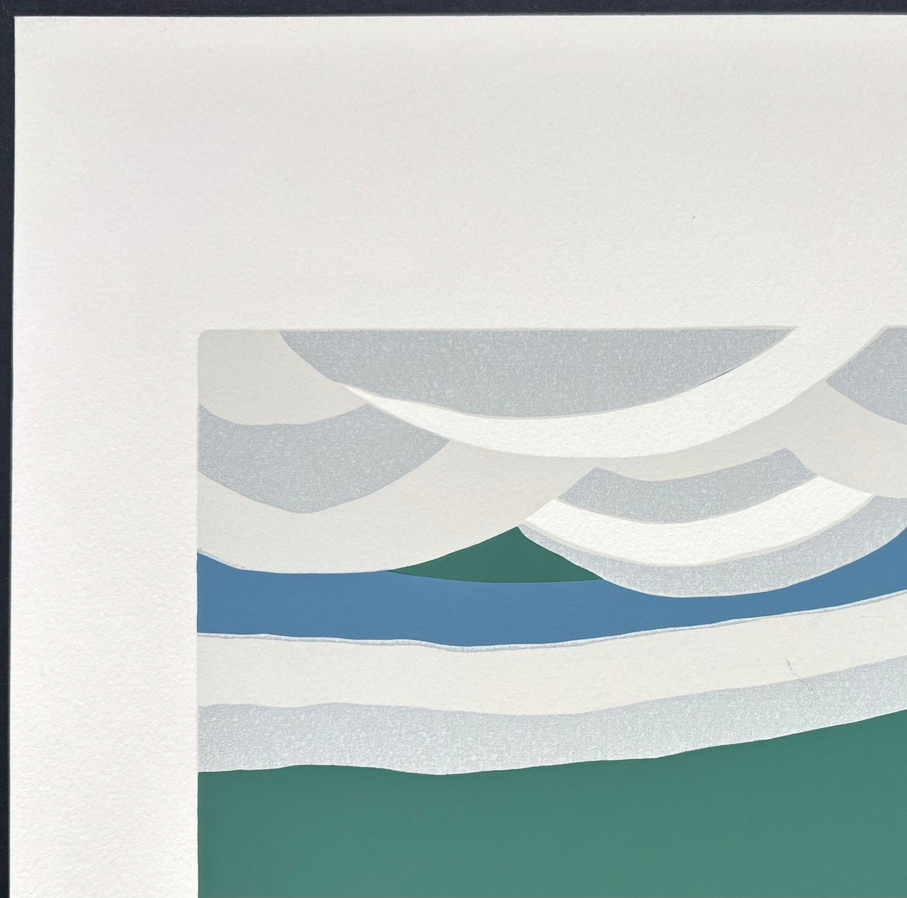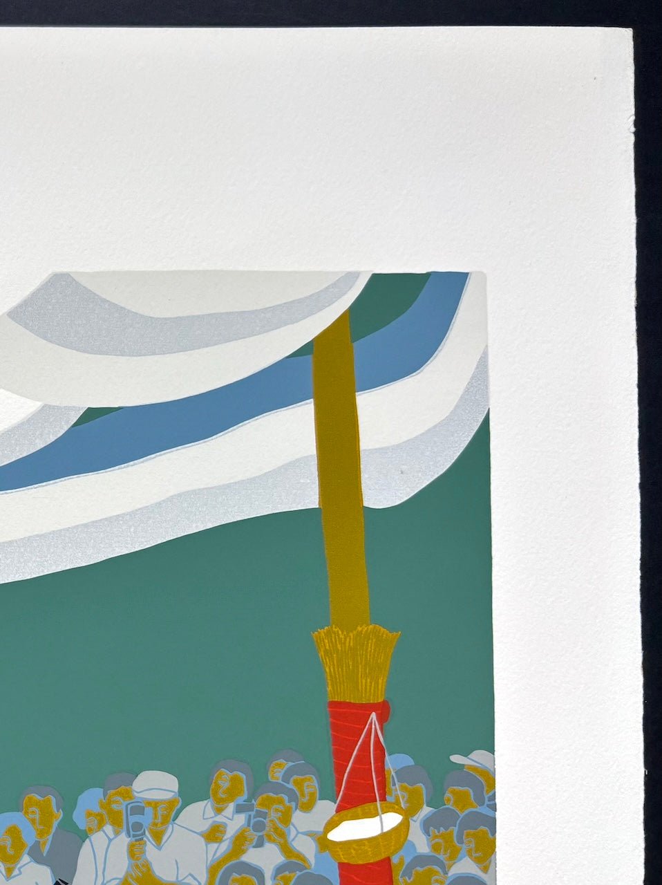 The charming silkscreen print “Nobukata Sumo” (Nobukata Sumo Festival, Ibaraki) is by Masaaki Tanaka (b. 1947). This engaging work depicts local children participating in sumo wrestling as part of the long-standing Nobukata Sumo Festival. The festival is said to have originated over 300 years ago during the Edo period, when it was held to celebrate the peaceful resolution of a dispute over fishing grounds in the Itako City area and was dedicated to Kashima Yoshida Shrine.