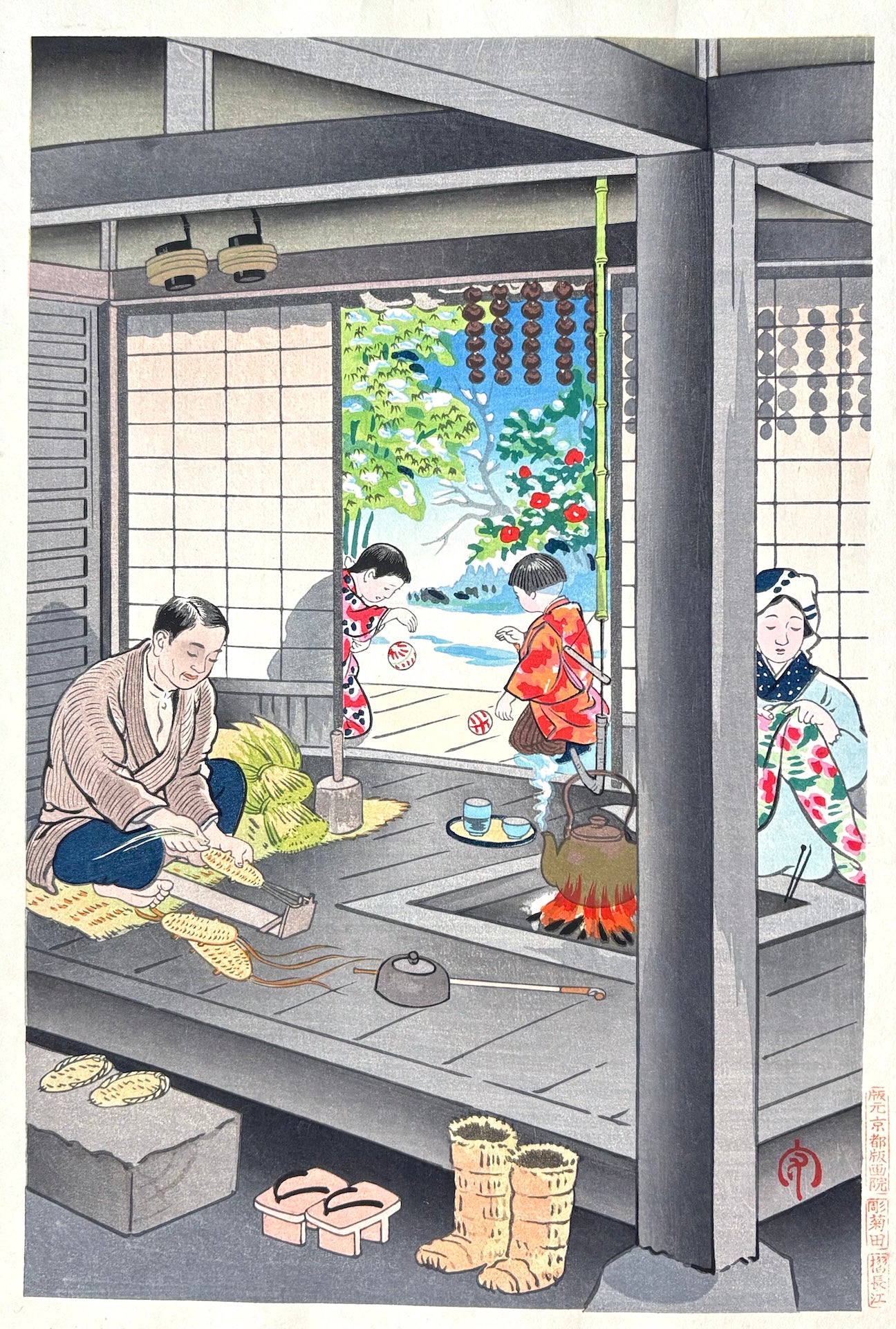 Inside the home, the father is making straw sandals while the mother sews beside the irori, a traditional sunken hearth. Nearby, the children play mari asobi, a classic girls’ ball game, creating a lively yet intimate family atmosphere. Beyond the shōji doors, strings of persimmons hang to dry, adding a seasonal touch and evoking everyday life in old Japan. This charming scene beautifully reflects the simplicity and warmth of traditional Japanese family life.