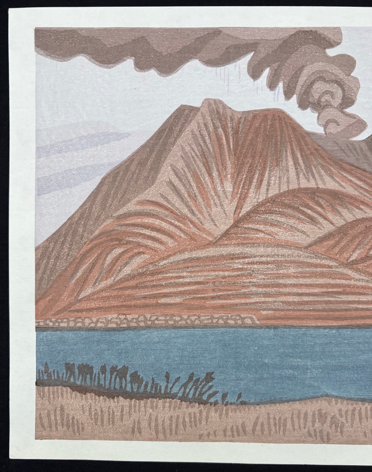 The remarkable woodblock print “Sakurajima” by Takeji Asano captures a striking view of the volcano. Sakurajima, the most active volcano in Japan, is located in Kagoshima Prefecture and is considered a symbol of the region. Amid a tranquil landscape, the volcano remains active, and the contrast between stillness and movement is beautifully expressed through the simple composition.