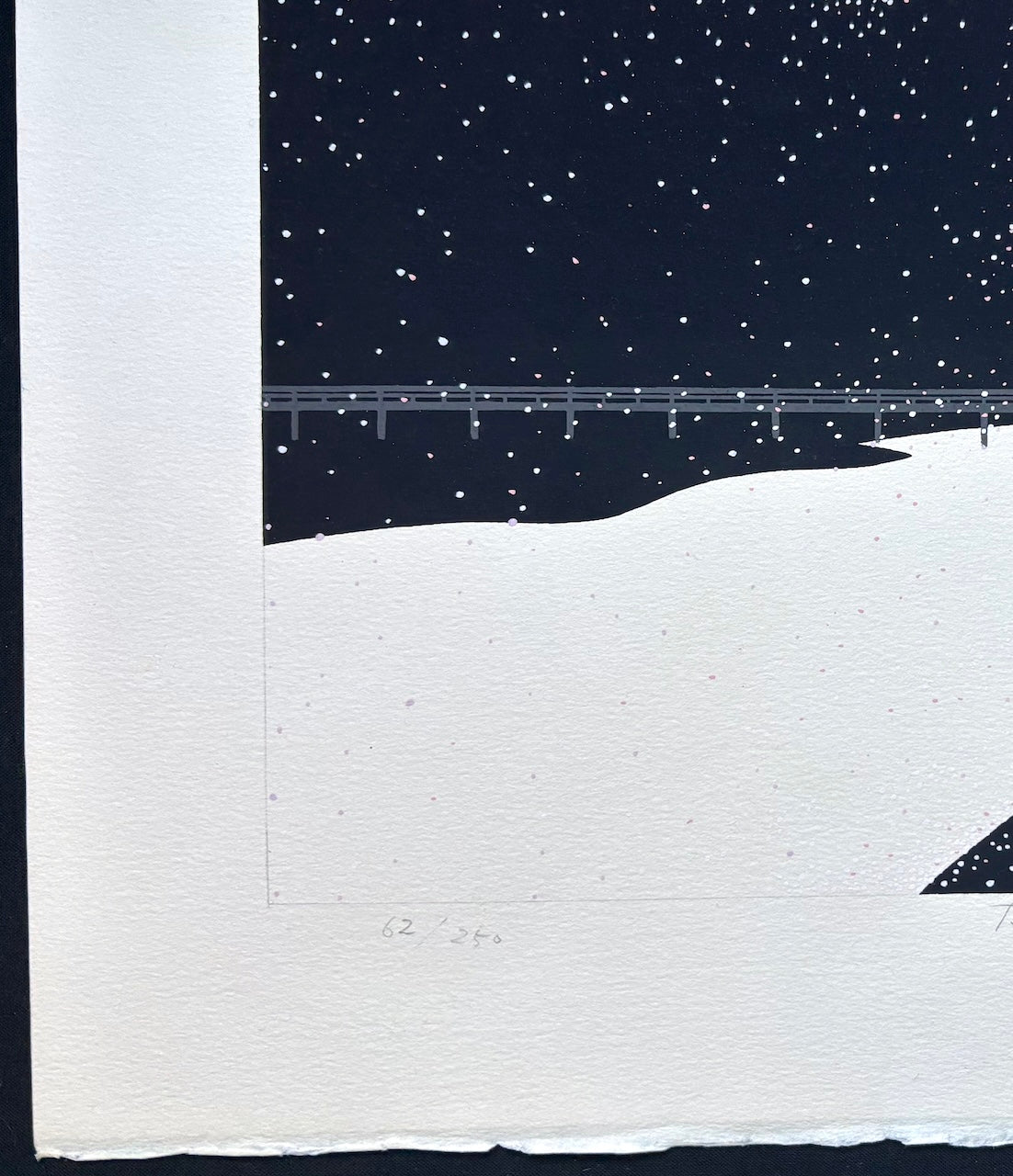 The breathtaking woodblock print Ranzan Shifu (“Purple Wind at Arashiyama”) is by Teruhide Kato (1936-2015). This is an extremely rare, hand-signed limited-edition print featuring a stunning spring night scene in Arashiyama, Kyoto. Cherry blossoms fill the landscape, their pink petals falling dramatically in the breeze. Absolutely beautiful.