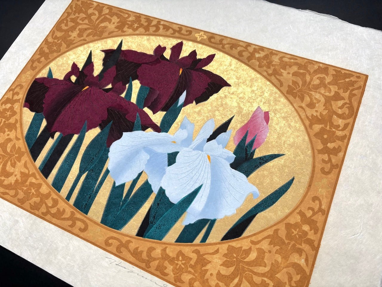 The exquisite print 'Iris 71' by Hajime Namiki, created in 2000, enchants with its vivid colors and striking contrasts. Printed on beautifully textured paper, the work presents a fresh, Western-inspired interpretation of Namiki’s signature iris motif. The bold composition and rich palette give the flower a powerful presence, balancing elegance with a modern sensibility. This unique print is both visually captivating and memorable—a truly stunning example of the artist’s distinctive style.