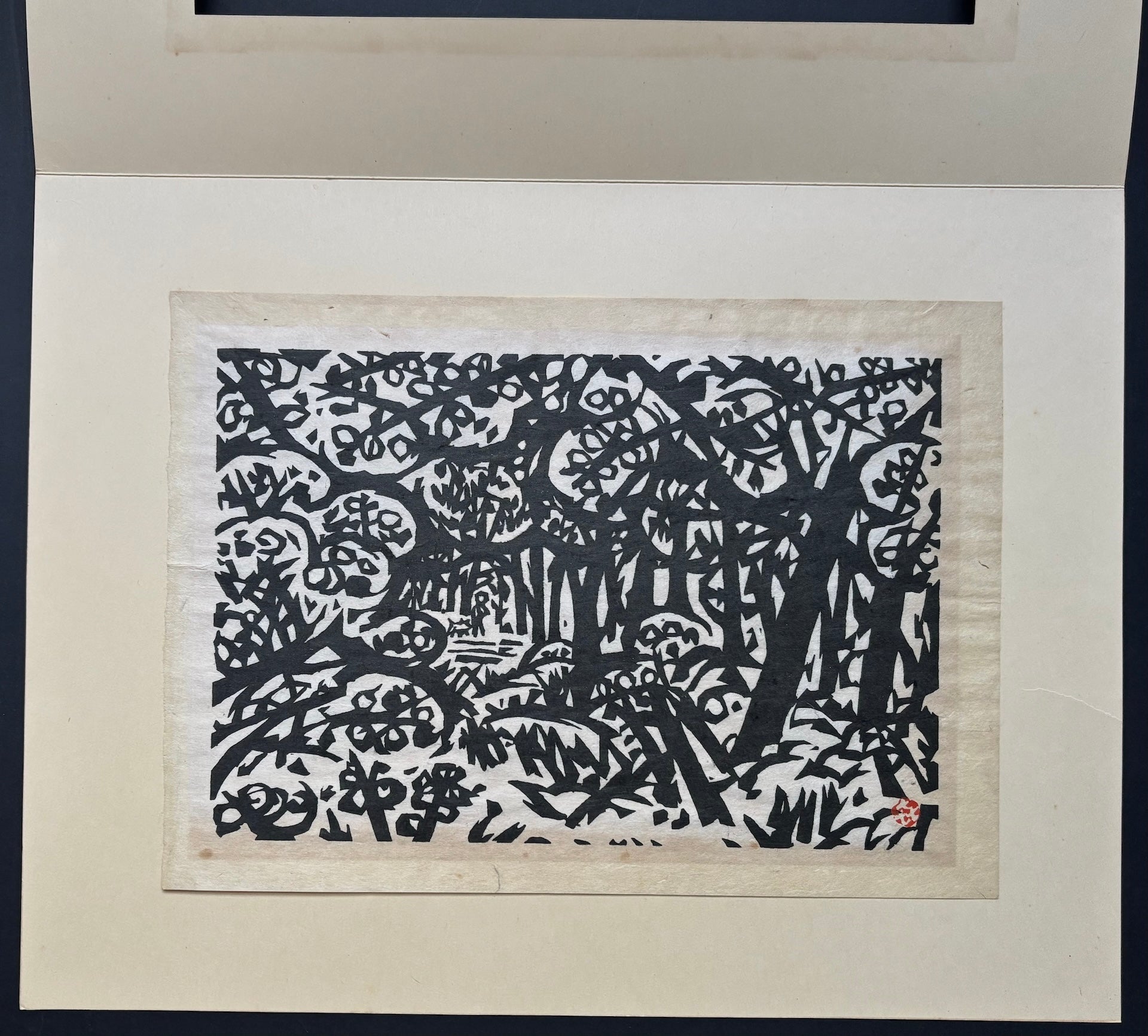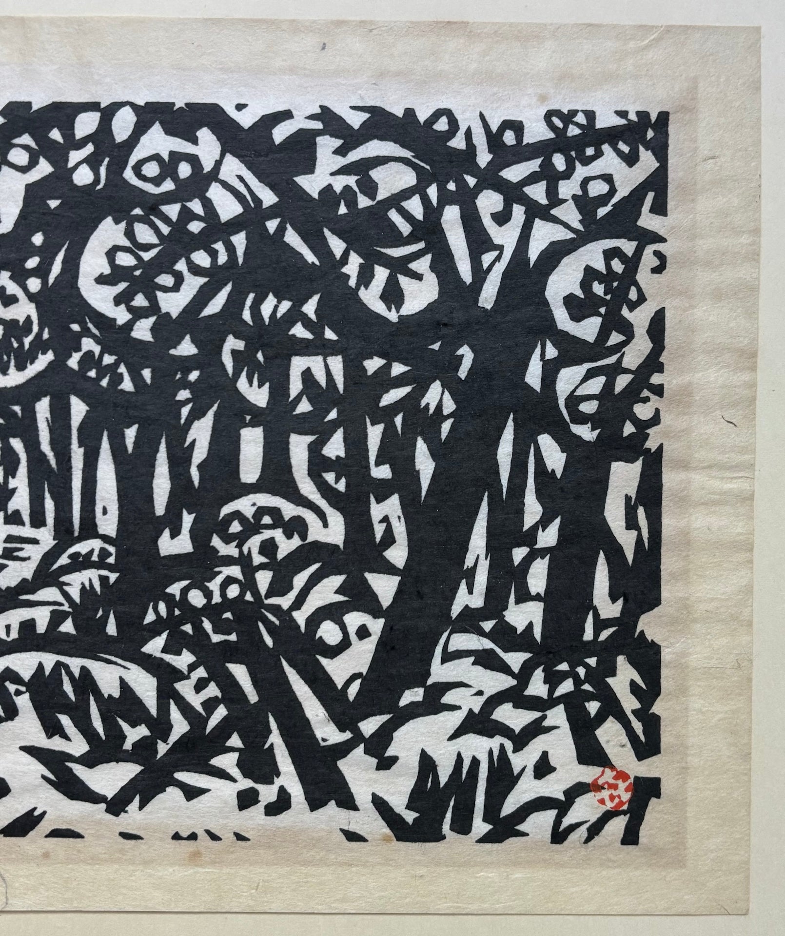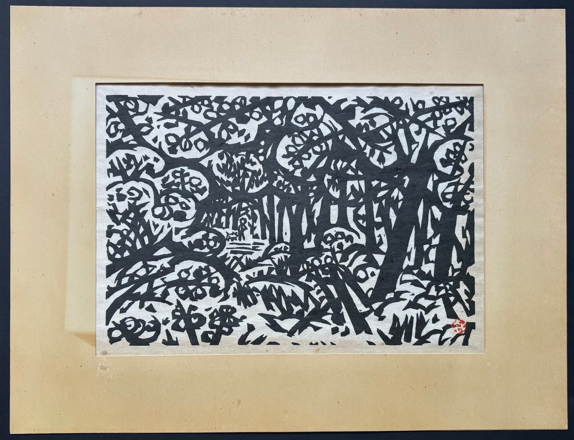 The peaceful black-and-white print “A Walk with a Dog in the Woods” by Kihei Sasajima (1906–1993) captures a quiet moment in nature. A solitary figure walking a dog appears through the gaps in the trees, introducing a gentle sense of movement within the stillness. Rendered in a restrained palette, the scene conveys warmth and simplicity.