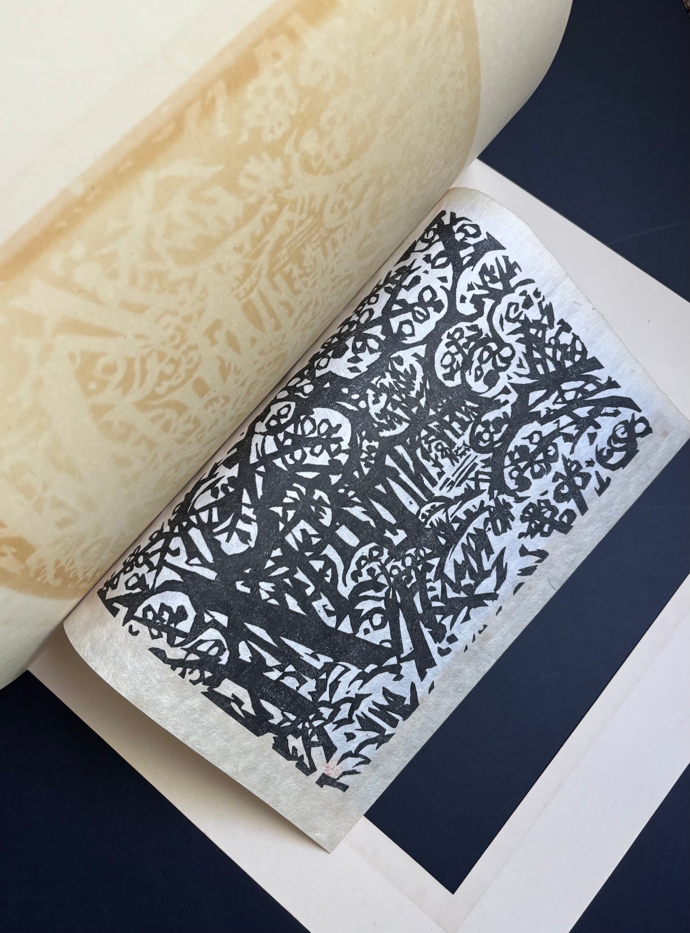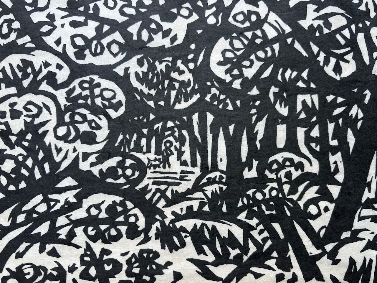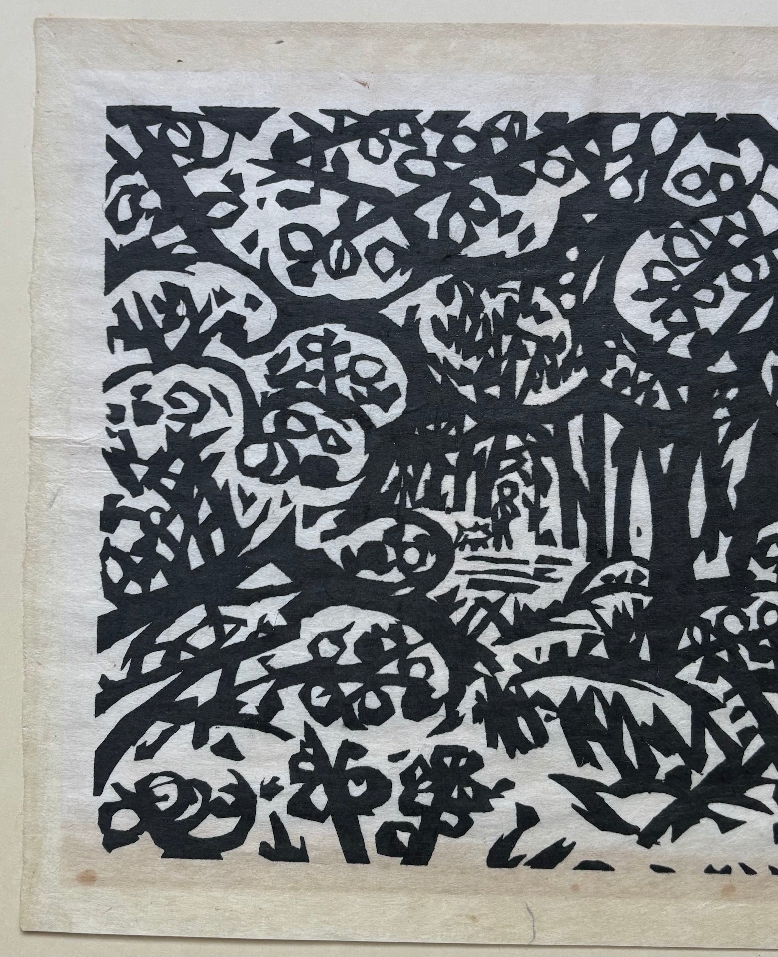 The peaceful black-and-white print “A Walk with a Dog in the Woods” by Kihei Sasajima (1906–1993) captures a quiet moment in nature. A solitary figure walking a dog appears through the gaps in the trees, introducing a gentle sense of movement within the stillness. Rendered in a restrained palette, the scene conveys warmth and simplicity.