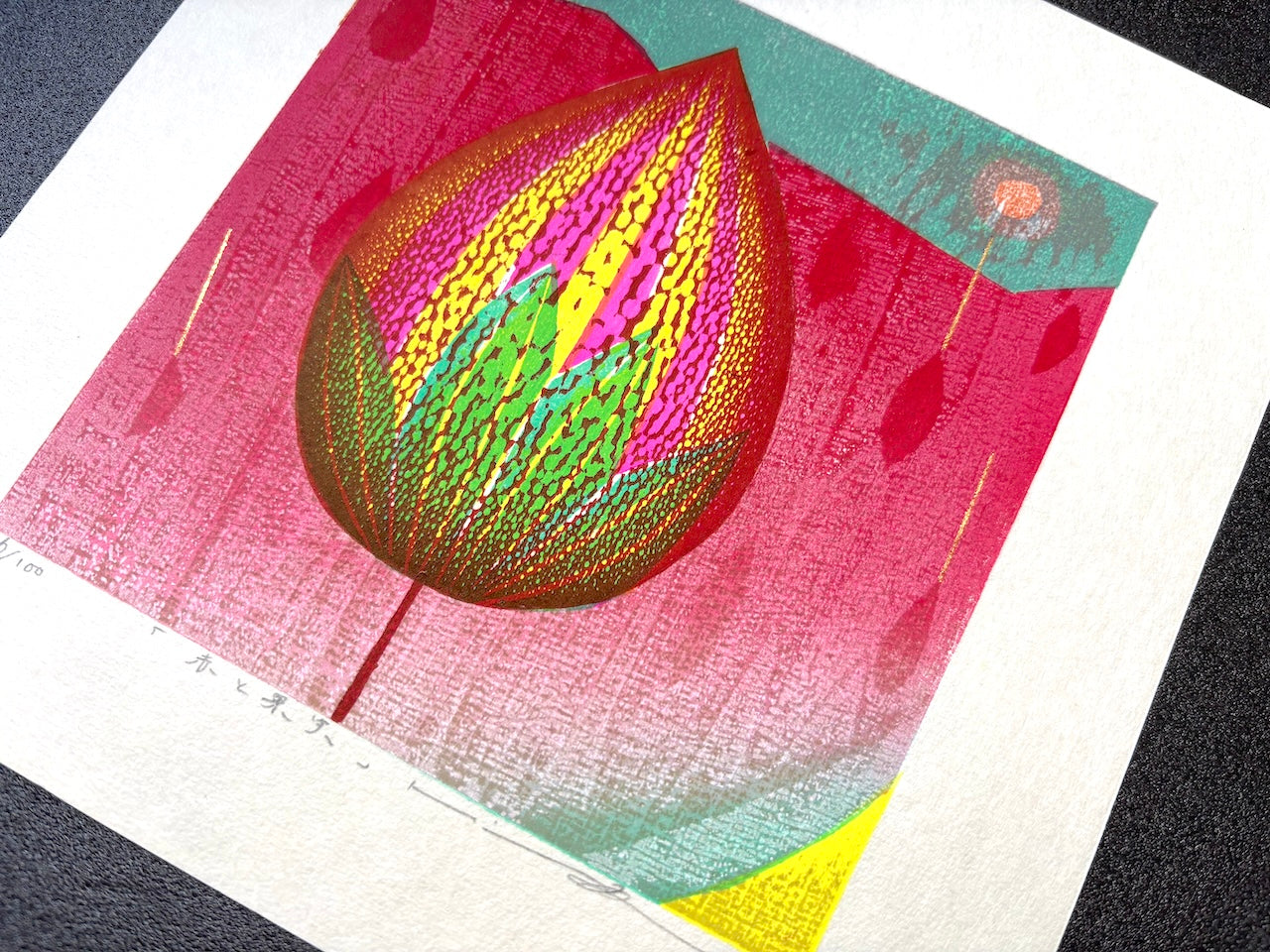 The charming woodblock print “Aka to Kajitsu” (“Red and Fruits”) is by Mitsuru Hiraki (b. 1958). It features a large strawberry in the foreground with a watermelon in the background. The piece exudes a juicy freshness, using vibrant colors to create a playful and eye-catching composition.