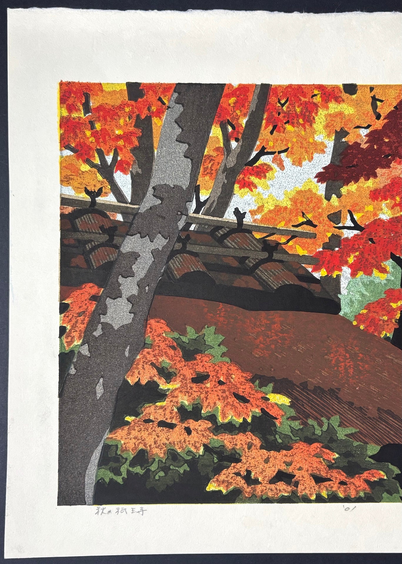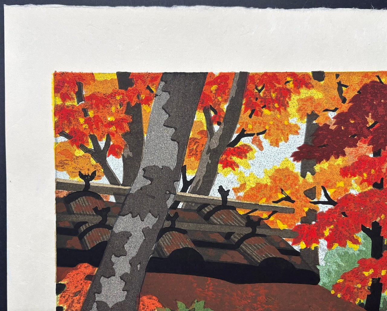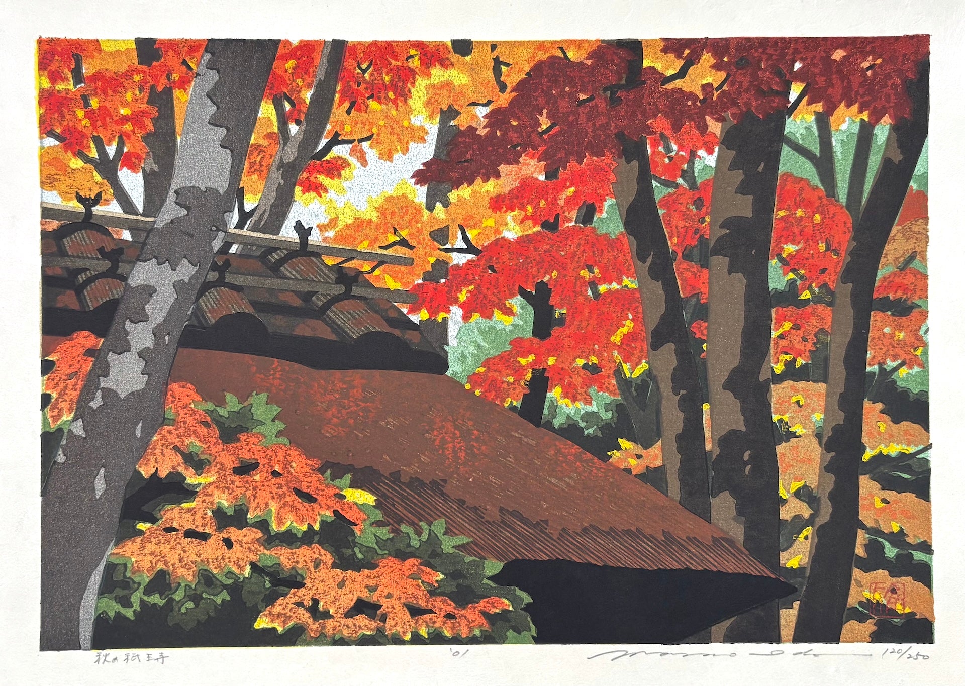 The breathtaking woodblock print “Aki no Gio-ji” (Gio-ji Temple in Autumn, Kyoto) is by Masao Ido. It beautifully captures the tranquil atmosphere of Kyoto’s iconic Gio-ji Temple in autumn, highlighted by its vibrant, richly colored foliage. The autumn leaves at Gio-ji are truly stunning—personally, I believe it’s one of the most beautiful places to experience the fall season in Kyoto.