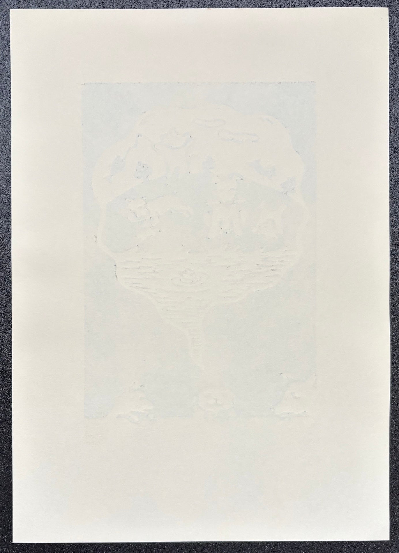 The delightful woodblock print ““Dog’s Dream” is by Takashi Ohno (b. 1951). A whimsical black-and-white woodblock print depicting a dog’s joyful dream of life with friends on a “dog island.” Humorous, charming, and sure to delight.