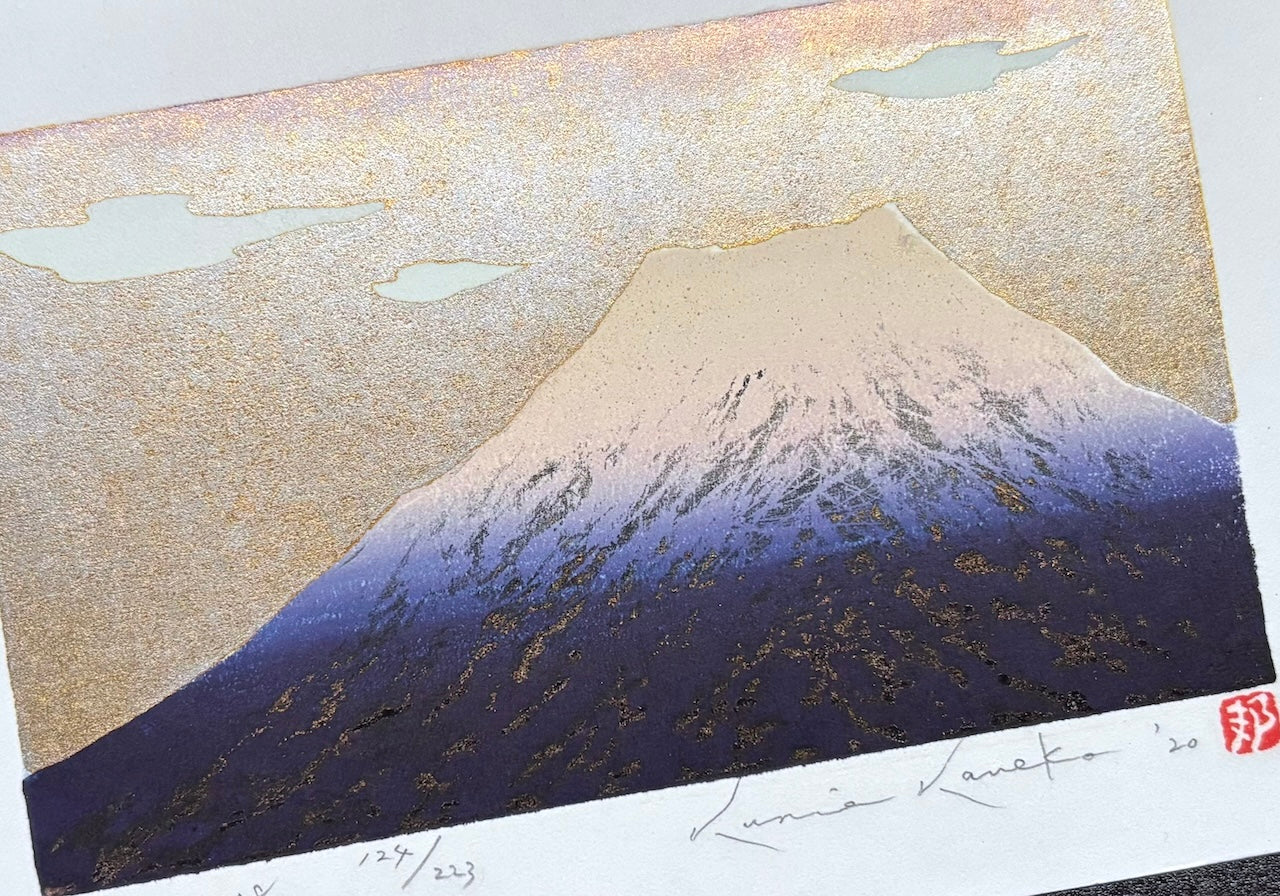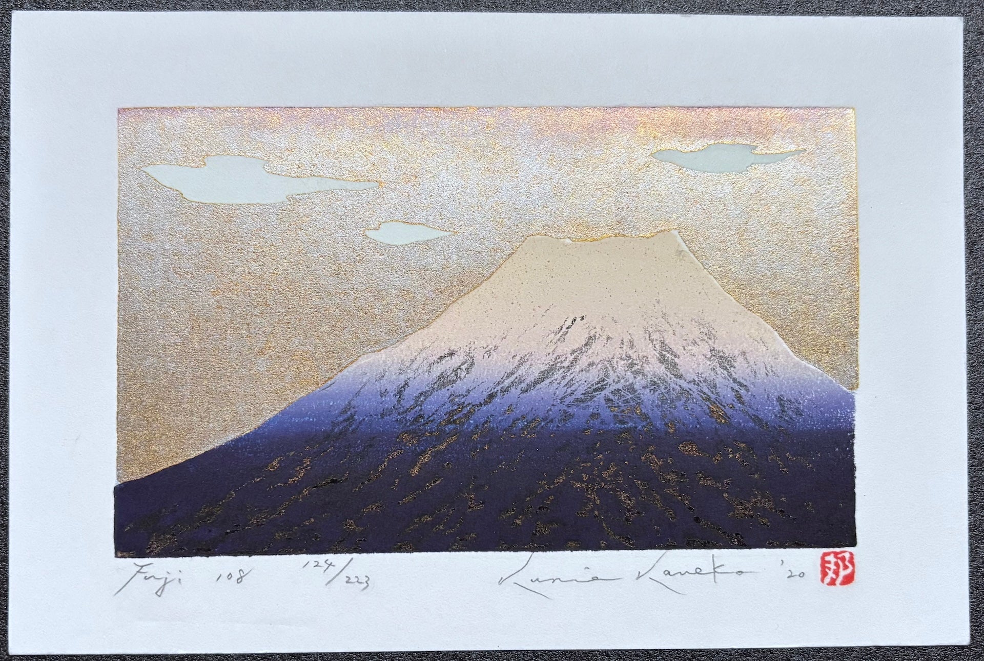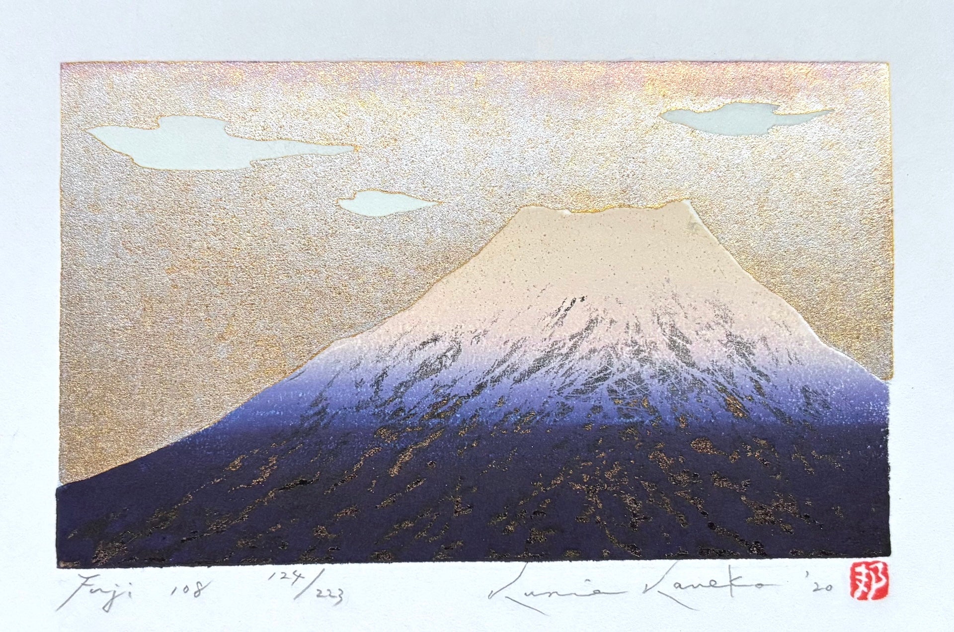 The stunning woodblock print “Fuji 108” by Kunio Kaneko beautifully captures the majestic presence of Mt. Fuji in all its glory. The artist’s use of vibrant colors conveys a sense of harmony and elegance throughout the scene. Mt. Fuji, a timeless symbol of good fortune, is depicted here with a softly tinted purple-lavender summit—truly unique and breathtaking.