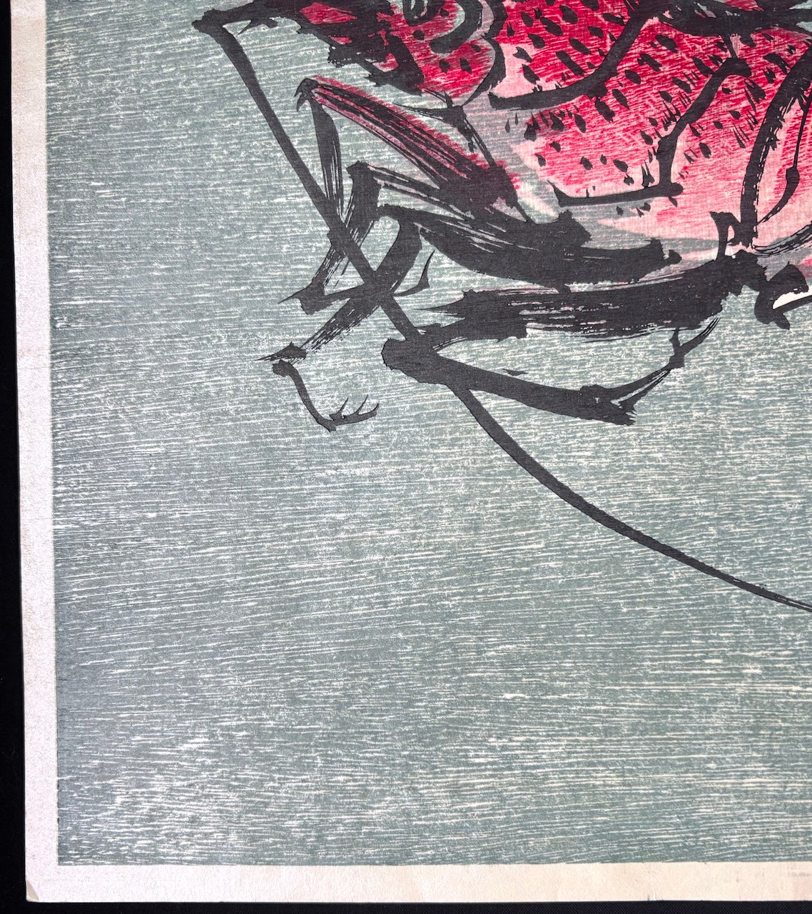 The exquisite woodblock print “Ise-Ebi” (Japanese Lobster) by Mokurei Nakagawa (1919–1979) is a beautifully executed large-format work. It depicts a Japanese lobster set against richly textured woodgrains with a subtle shimmer. In Japan, Japanese lobsters are considered lucky charms, and the tradition of using them as New Year’s decorations continues today. The dynamic composition makes this a truly eye-catching piece.