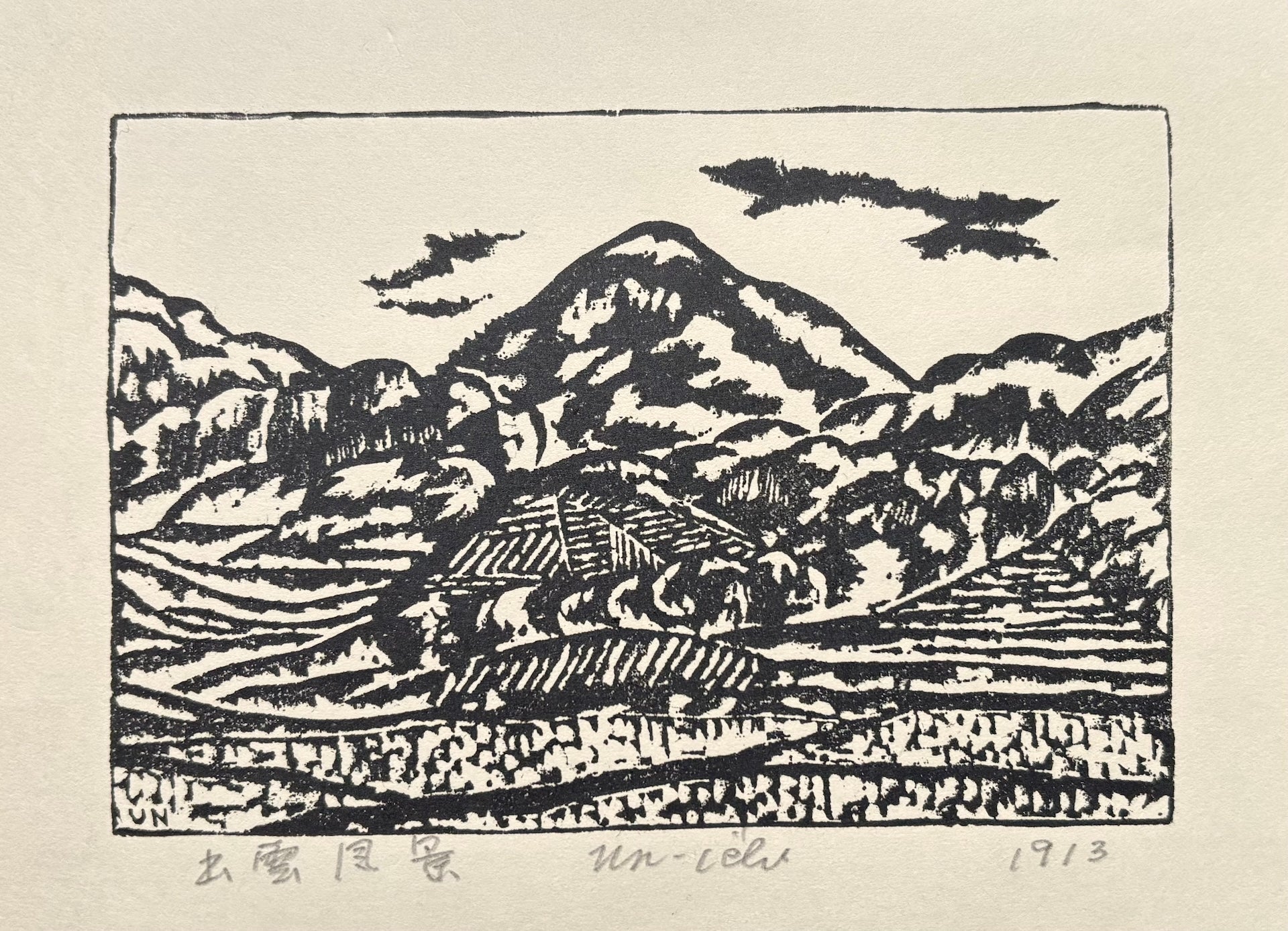The charming woodblock print "Izumo Fukei" (Izumo Landscape) is by Unichi Hiratsuka (1895–1997). This small print depicts the tranquil countryside of Izumo, a region rich in mythology and home to many sacred sites, including the renowned Izumo Taisha Shrine and the surrounding mountains. The quiet rural landscape, with its fresh, clean air, is beautifully expressed through Hiratsuka’s striking black-and-white composition. The print is hand-signed, titled, and dated in pencil along the bottom margin.