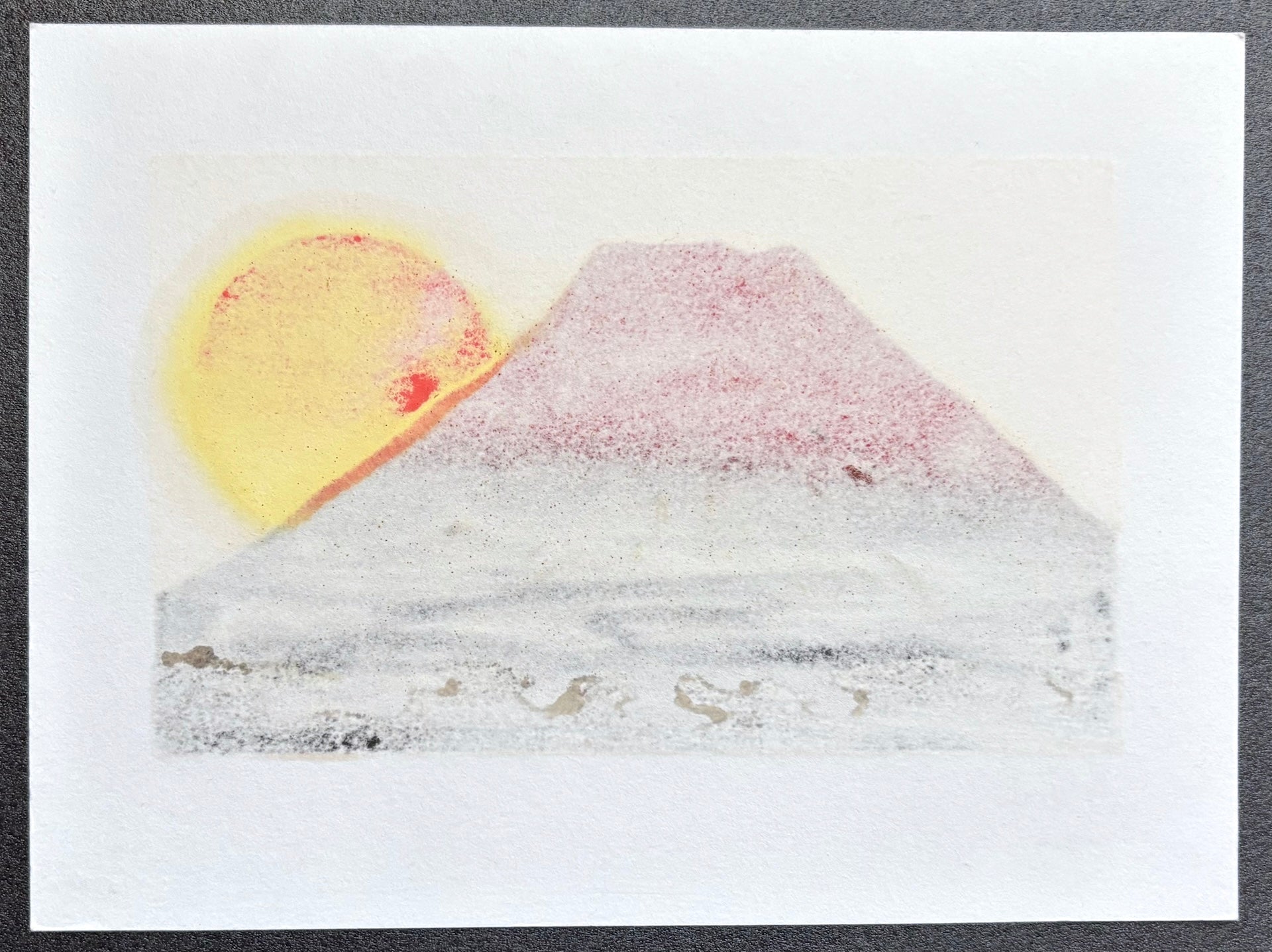 The striking Mt. Fuji print Kotobuki Fuji is by Kunio Kaneko. Kotobuki (寿) means “congratulations.” The print features rich, brilliant colors with a luxurious presence. In Japan, a red Mt. Fuji is said to bring good luck. This piece would make a perfect gift for friends or family. The edition size was limited to 200 and is now out of print. This particular print is an artist’s proof, and this is the last copy we have.